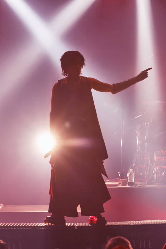 そんな新たな夏の始まりの日ということもあってか、珍しく冒頭からノースリーブの衣装で登場したKIRITO。過去にもステージを共にしてきたサポートメンバーの海(G/vistlip)、JOHN(G)、Masa(B/NOCTURNAL BLOODLUST)に、今回が初参加となるHiroki(Dr/C-GATE)が加わり、新体制で臨んだこの日のステージは、不穏な空気が漂う「Suicide View」でスタートを切るという意外な選曲で幕を開け、攻撃力の高いヘヴィーサウンドを武器に様々な場面を経ながら全21曲が披露された。