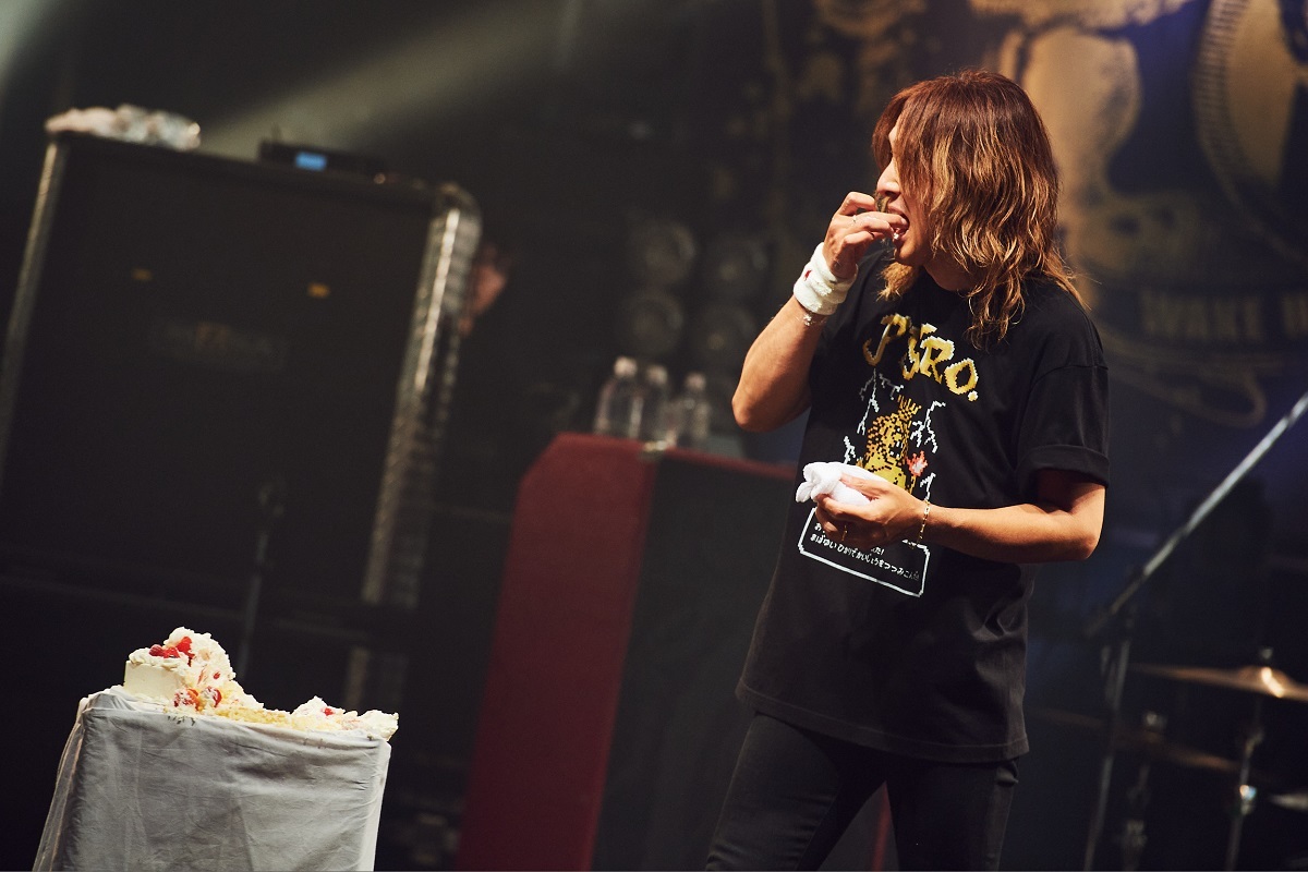 そうして、このあとは恒例のケーキカットへ。ろうそくを吹き消したあと、Jがナイフのかわりに素手でカットしたケーキをフロアに飛ばしておすそ分けをするのだが、この日はケーキの欠片がステージ正面にいた女性の頭上にごっそりのっかってしまう。それに気づいたmasasucks、スタッフがすぐにタオルを渡し、さらにJも「大丈夫か?」と声をかけ、タオルを差し出した。タオルをもらったフロア前方の観客たちは気をきかせて、後ろのファンにもタオルを回していく。Jのライブでは、以前からスタッフが配った水を最前列から後方に回していく光景はよく見られた。このようなメンバー、スタッフ、ファンの心温まる気配りが、いつの間にか“Jイズム”として、Jのライブには根付いていった。その瞬間を目の当たりにしたシーンだった。