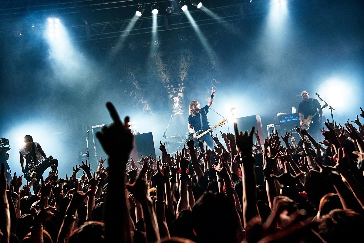 そうして、ライブは「Twisted dreams」で幕開け。今夜はJとPyroの真っ向勝負。Jが曲中、マイクスタンドをお立ち台に引きずりあげて歌うパフォーマンスで、冒頭から本気の火花をフロアに散らすと、続く「Evoke the world」では、一面のOiコールとジャンプでフロアが場内の空気を揺らしまくる。有松が繰り出すマーチングドラムで刻一刻とフロアの熱量と狂騒感が増していったところに「もっとー!」とJが叫び、さらなる頂へとかき立てていく。
