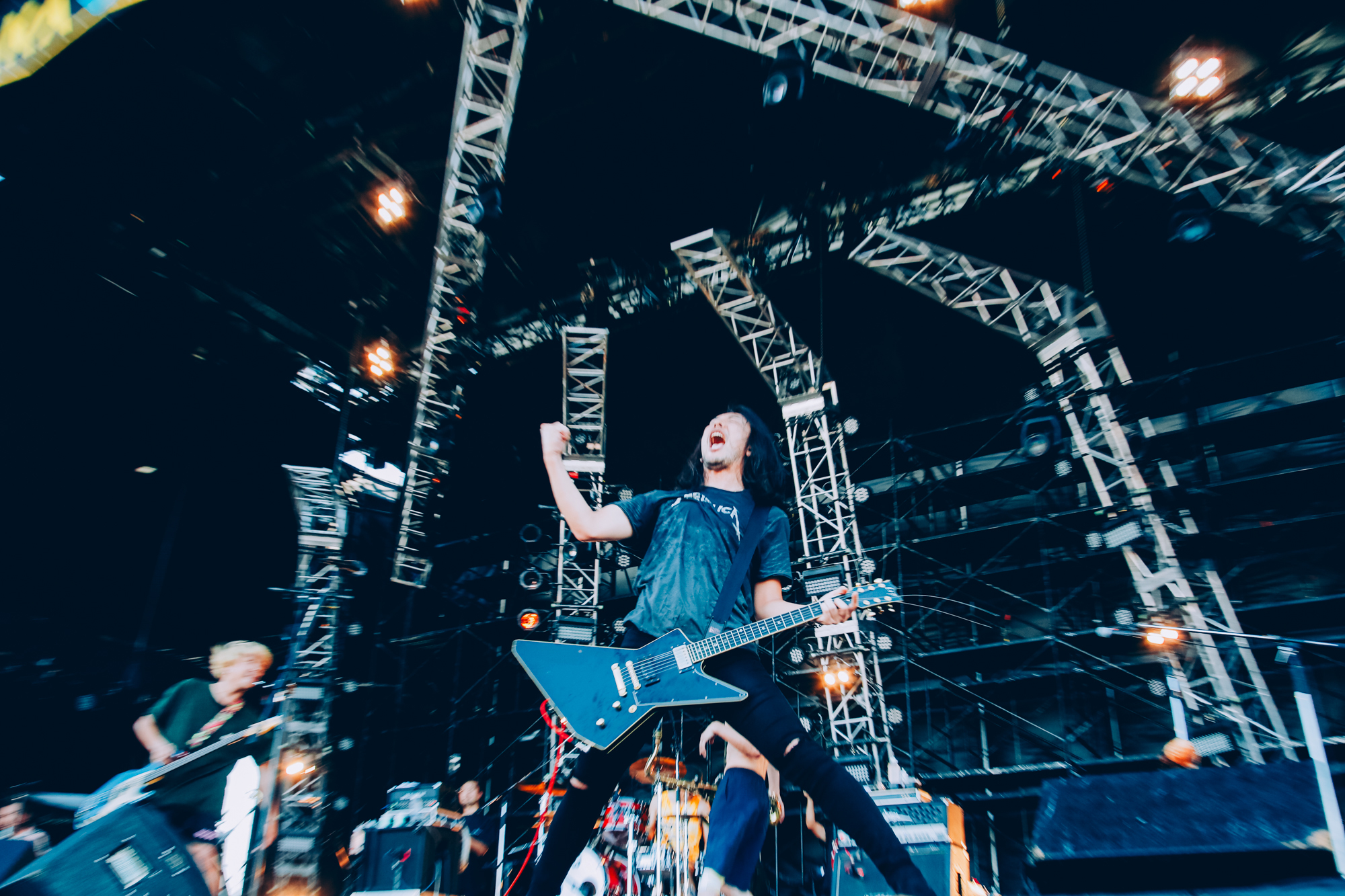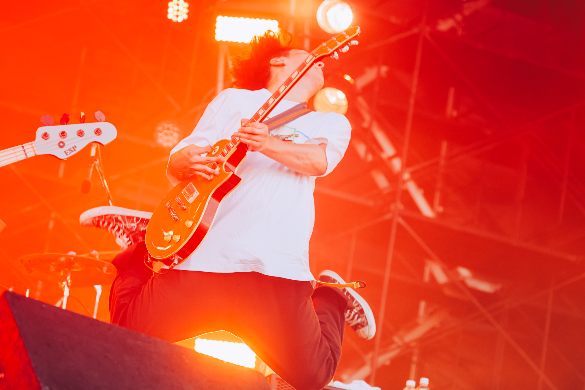自らを「『ジャイガ』の顔」と称していたのは、04 Limited Sazabys。リハから本番さながらの熱気をフロアに降ろし、興奮と熱狂にまみれたライブを展開した。MCでGEN(Vo.Ba)は「元気だなお前ら!」と笑顔を見せ、「俺たちがこんなこと言うのおこがましいし調子乗ってると思われるかもしれないけど、『ジャイガ』めっちゃ良いフェスになりましたね! 1年目から見させていただいてたので、色んなことがあったのもよく知ってますし、今年こういう環境でライブできることを誇りに思います。守ってくれてた皆さんありがとうございます!」と述べて、Crossfaithに向けた「Kitchen」を投下。「Honey」では発生したサークルをHi-STANDARDの「Mosh Under The Rainbowみたい」と喜び、「swim」では「ロックシーンの未来に、皆さんの未来に、Crossfaithとキョードーの未来に光が射しますように!」と願いを込めてラストスパート! ライブキッズたちを熱狂の渦に巻き込んだ。