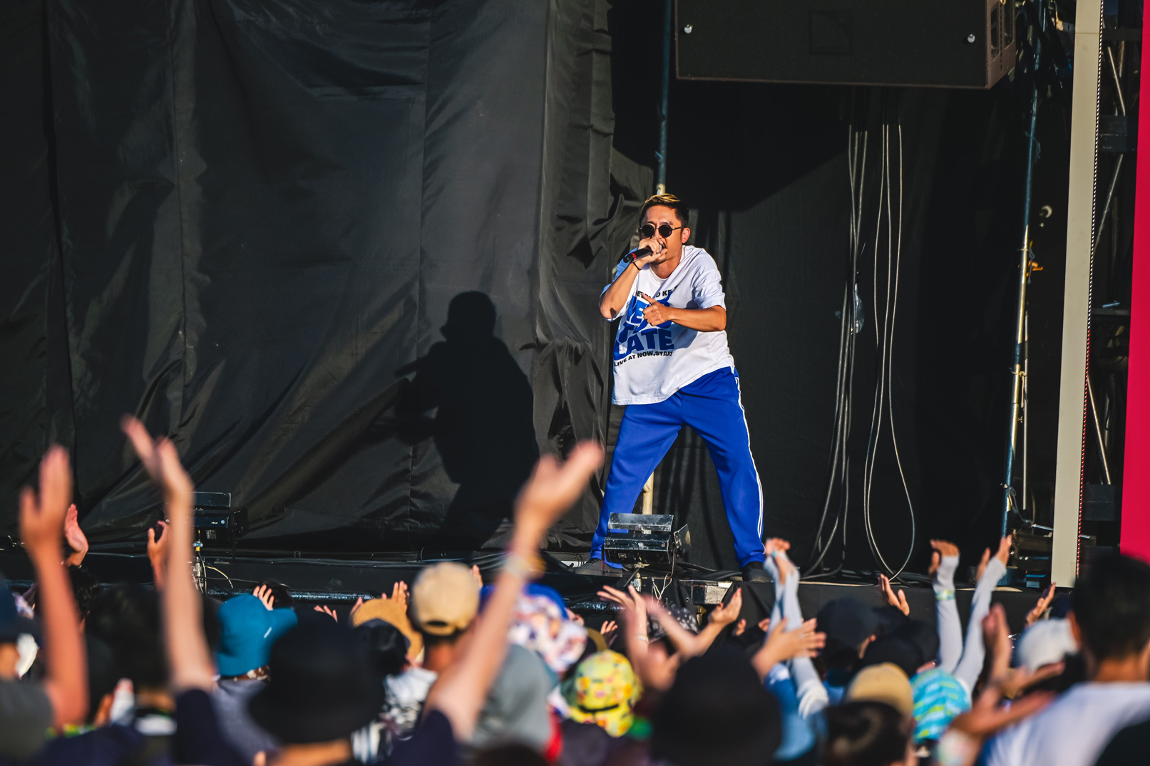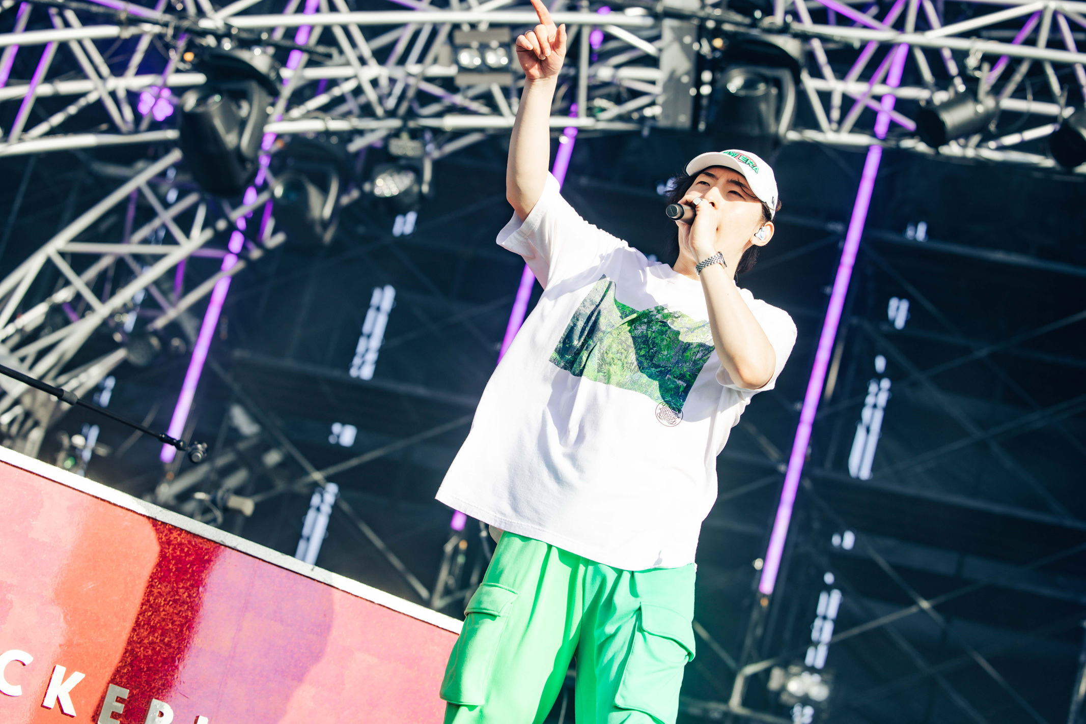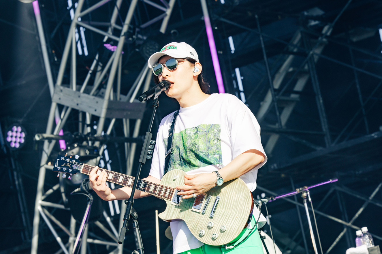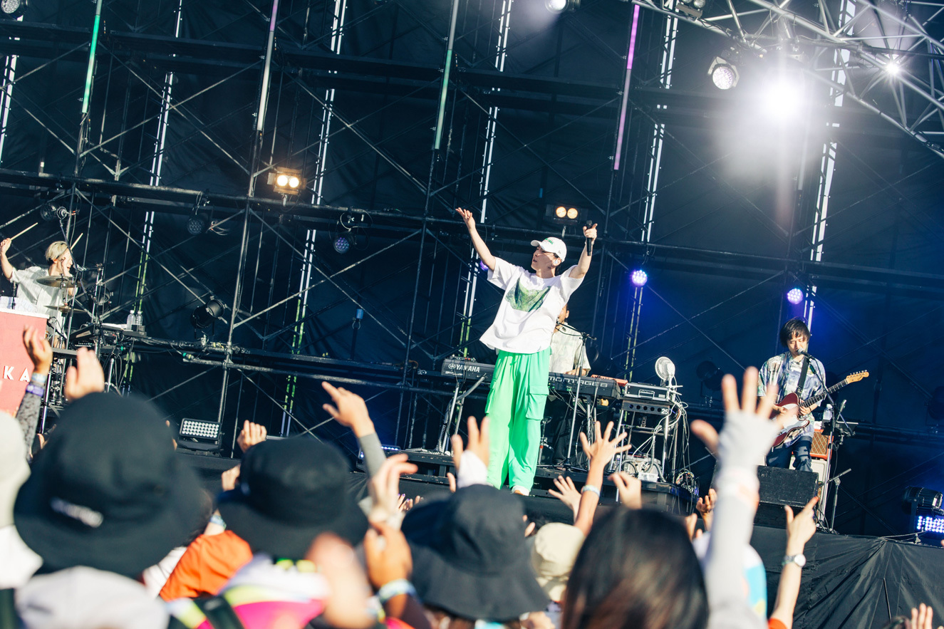 O.A.でSKY STAGEの幕を開けたのはMega Shinnosuke。ビートボックスをしながらバンドメンバーと共に登場し「俺のステージは今日出る人の中で1番短いけどさ、ここを盛り上げて皆とは1番長くいようと思うから。よろしく」と気合を見せて「Thinking Boyz!!!」や「Sports」などの代表曲をロックに響かせる。そして「今日はO.A.で短いんだけど、次は……このステージが1番デカいの?じゃあいつかトリで。おなしゃーす」と野望を口にした。4曲という曲数ながら、マスクマンたちと全力で大暴れし、青空の下でパワフルなアクトを見せてくれた。O.A.から大トリへ。2日目の優里に続いて、ぜひその野望を叶えてほしいと強く思った。