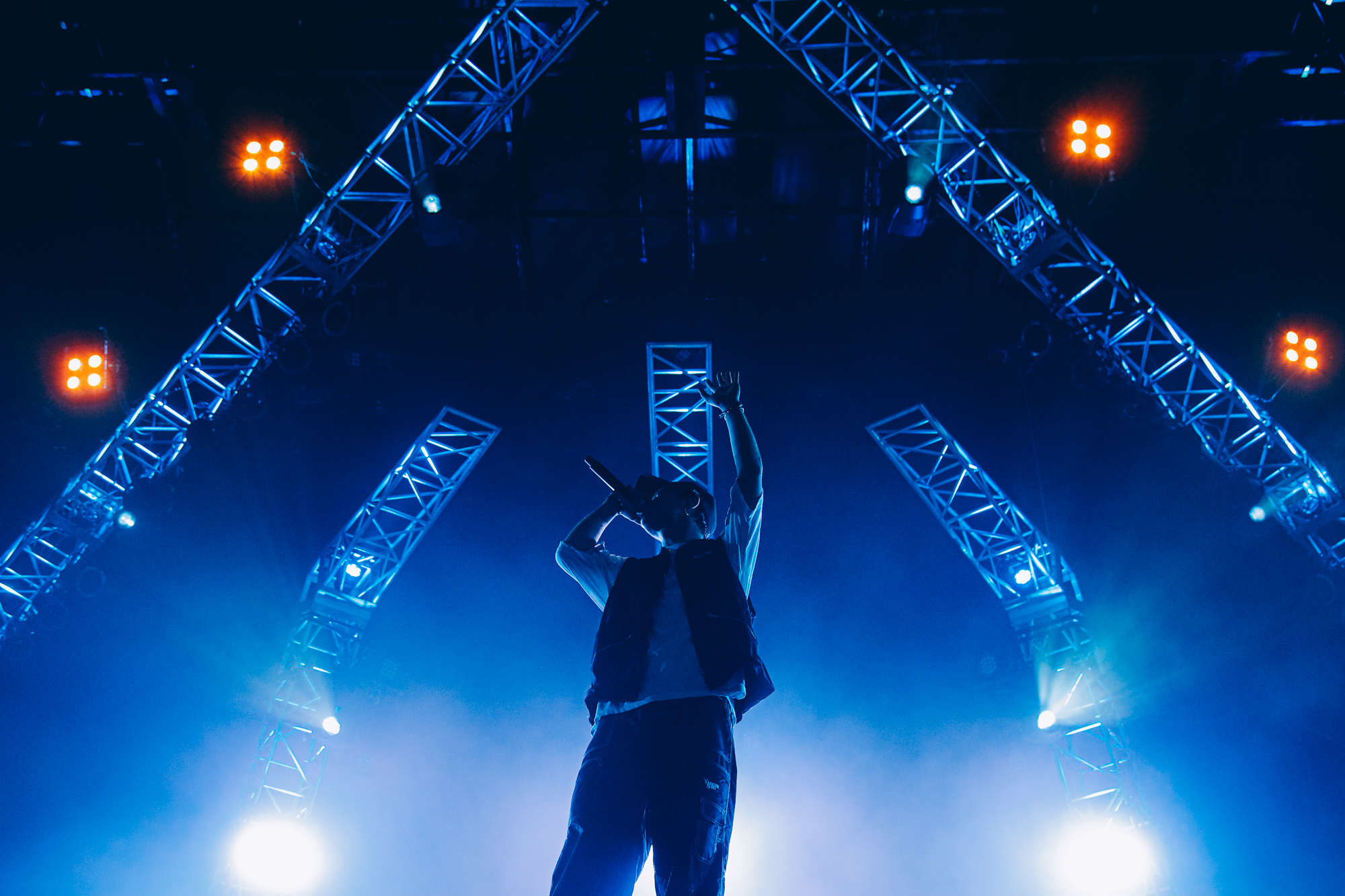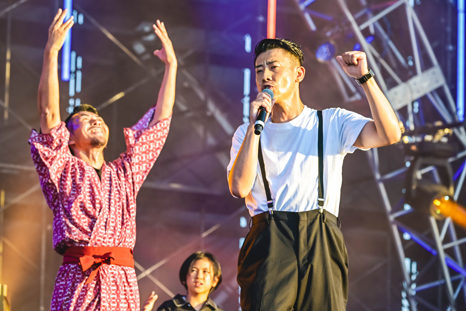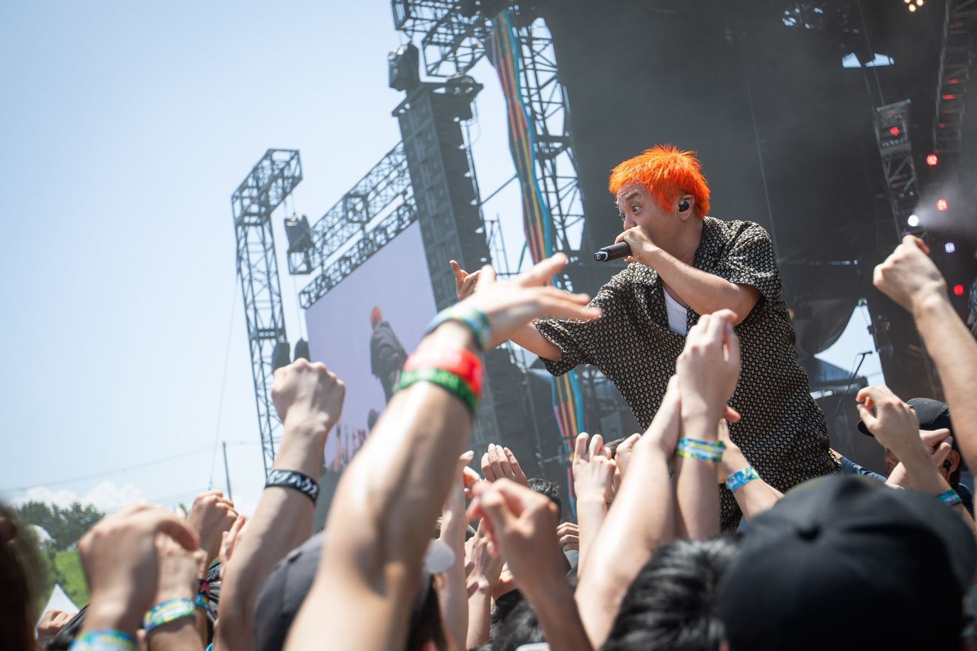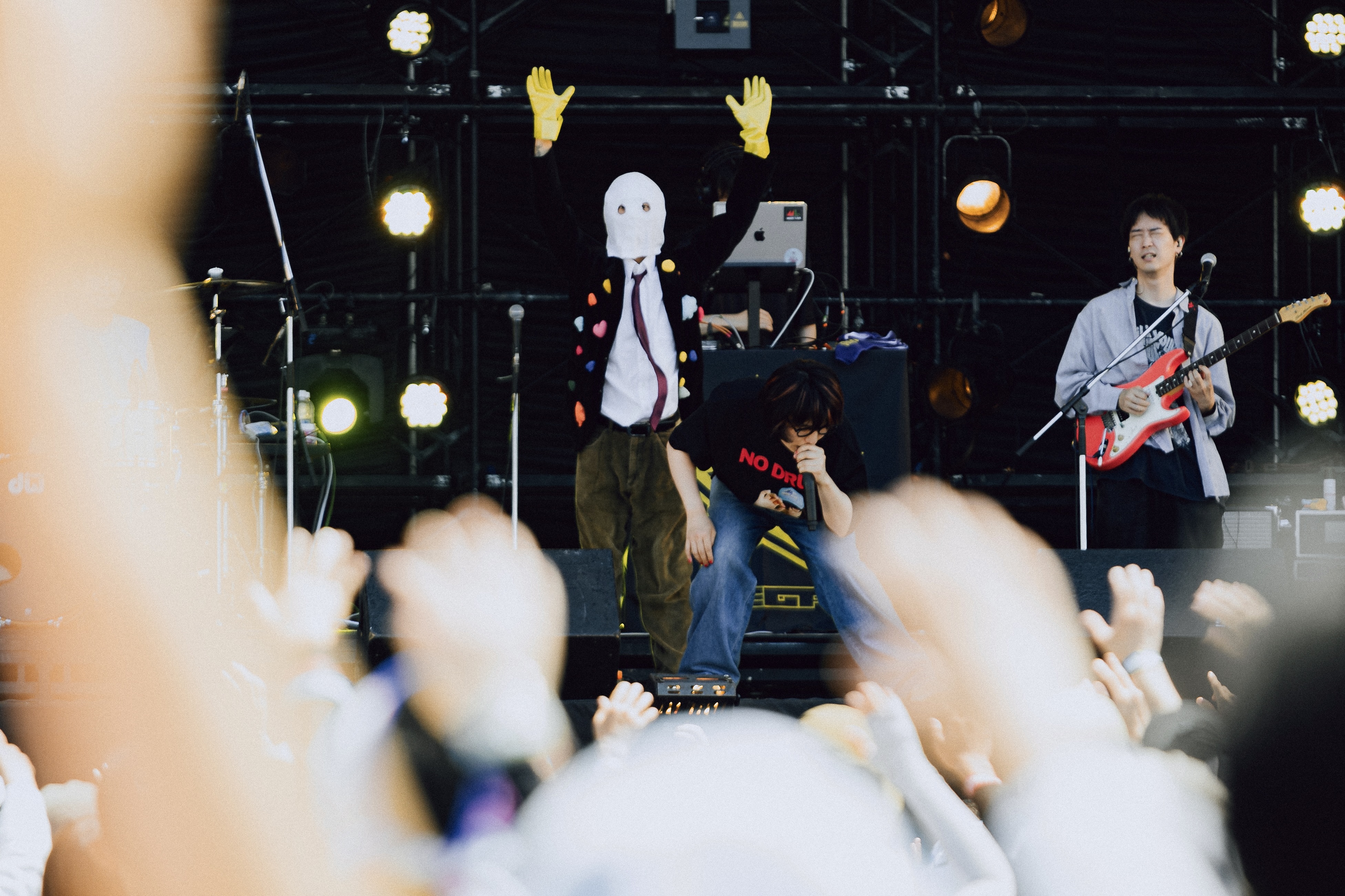 O.A.でSKY STAGEの幕を開けたのはMega Shinnosuke。ビートボックスをしながらバンドメンバーと共に登場し「俺のステージは今日出る人の中で1番短いけどさ、ここを盛り上げて皆とは1番長くいようと思うから。よろしく」と気合を見せて「Thinking Boyz!!!」や「Sports」などの代表曲をロックに響かせる。そして「今日はO.A.で短いんだけど、次は……このステージが1番デカいの?じゃあいつかトリで。おなしゃーす」と野望を口にした。4曲という曲数ながら、マスクマンたちと全力で大暴れし、青空の下でパワフルなアクトを見せてくれた。O.A.から大トリへ。2日目の優里に続いて、ぜひその野望を叶えてほしいと強く思った。