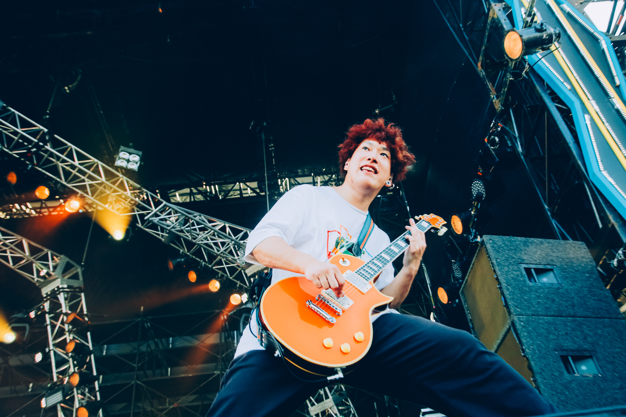 持ち前の求心力を遺憾なく発揮したのは、昨年初出演できなかったリベンジを果たしたヤバイTシャツ屋さん。1曲目の「無線LANばり便利」から見渡す限りの人々をジャンプさせ、「喜志駅周辺なんもない」ではこやまたくや(Gt.Vo)が「意味わからんタイミングで意味わからんウォール・オブ・デスしたいからやってもらっていいですか?」と言うとぱっくり2つに分かれた観客が一斉にぶつかり合って大騒ぎ。ラストの「かわE」では、神戸・甲陽音楽&ダンス専門学校の学生による総勢14名のジャイガダンサーズも登場し、ステージをカラフルかつ元気いっぱいに彩った。息つく間もなく35分を走り切り、アッパーな空気で満たしたヤバTだった。