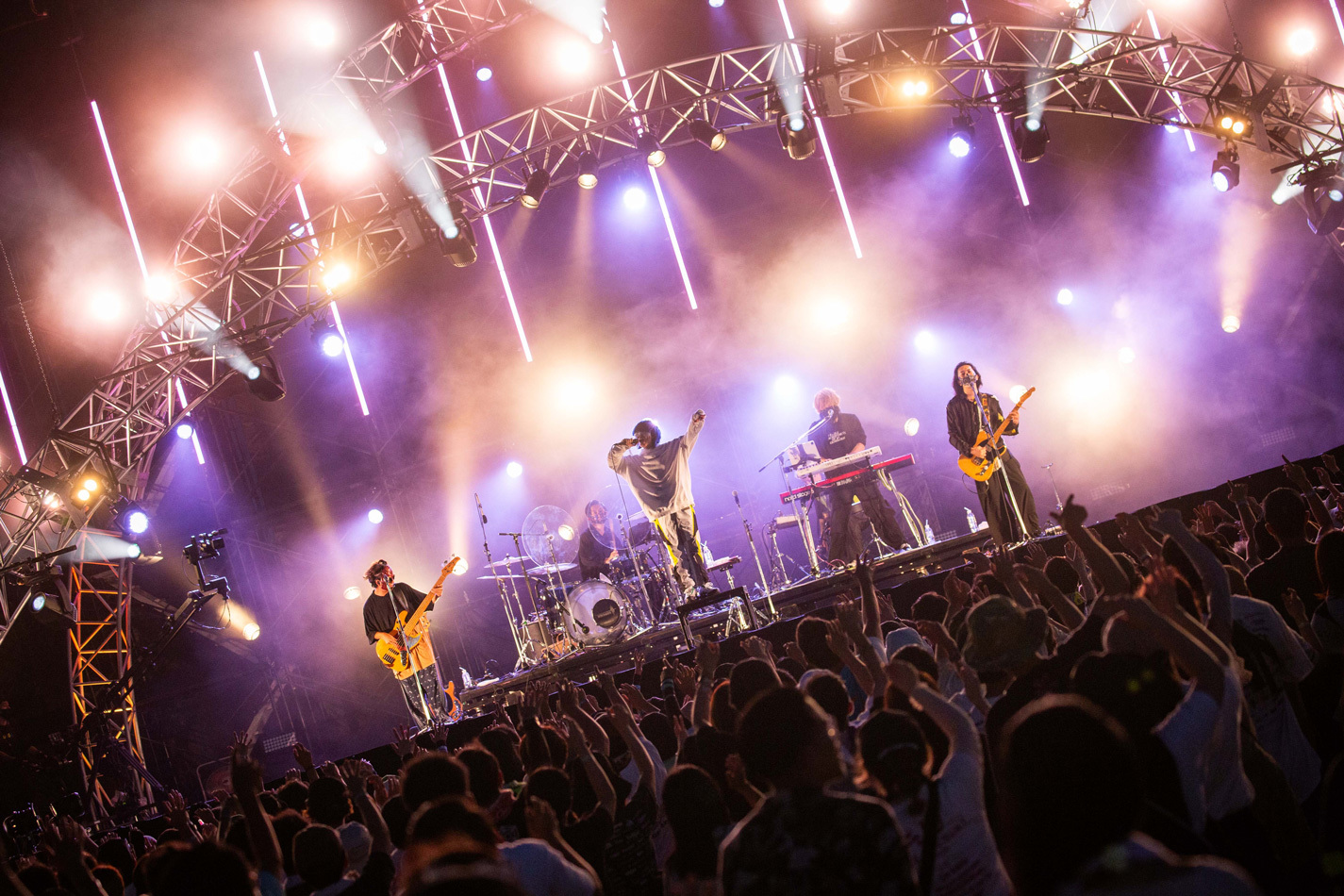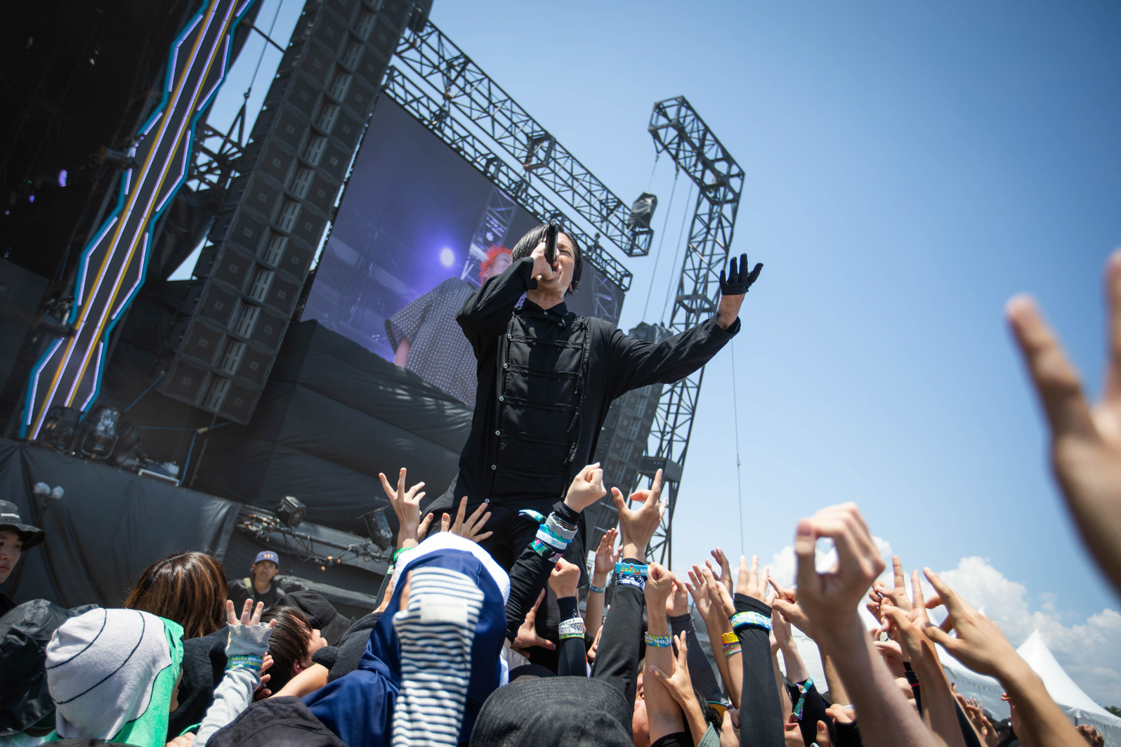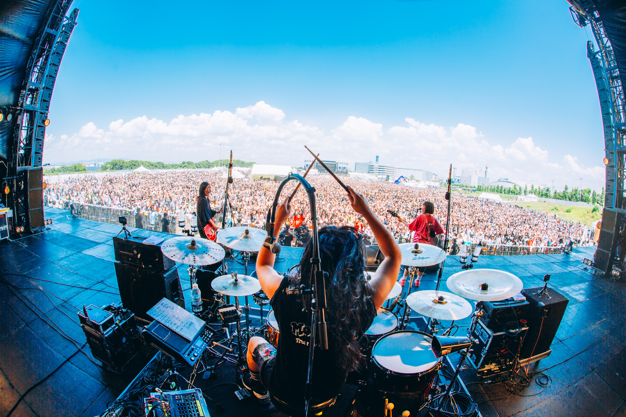 SKY STAGEにはPassCodeが登場。リハではMY FIRST STORYの「虚言NEUROSE」をカバーして観客を歓喜させた。SEが流れるとクラップが発生。バンドを従えて「Ray」から大疾走する。有馬えみりのデスボイス、大上陽奈子のクリーンな歌声と高嶋楓のキレのあるダンス。挑みかかるような眼差しで南菜生が発した「今日の出演者を見て、PassCodeがなぜこのステージに立たされているのかすごく理解しているつもりです。その期待に応える以上に超えたい! PassCodeは休憩時間じゃないんでよろしくお願いします」との力強い言葉には胸を揺さぶられた。直射日光の下、フルパワーで全8曲を堂々と歌いきった4人の姿は最高にカッコ良かった。