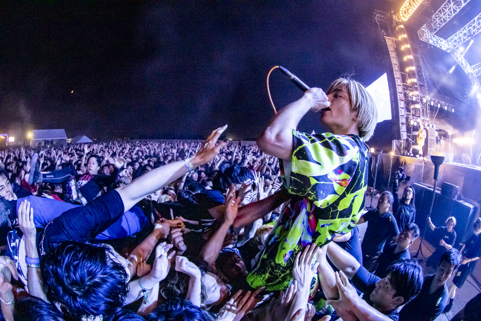 COAST STAGEのトップバッターに立ったROTTENGRAFFTYは、ライブ定番曲で盛り上げた。「This world」ではNOBUYA(Vo)が「お前らがCrossfaithの代わりに大暴れしてください!」と焚き付けて一層熱を高める。『ポルノ超特急』が『響都超特急』に名称変更することもアナウンスされ「新たな未来を一緒に作っていこう。生きてる声を叫び続けろ」と呼びかけてステージを後にした。