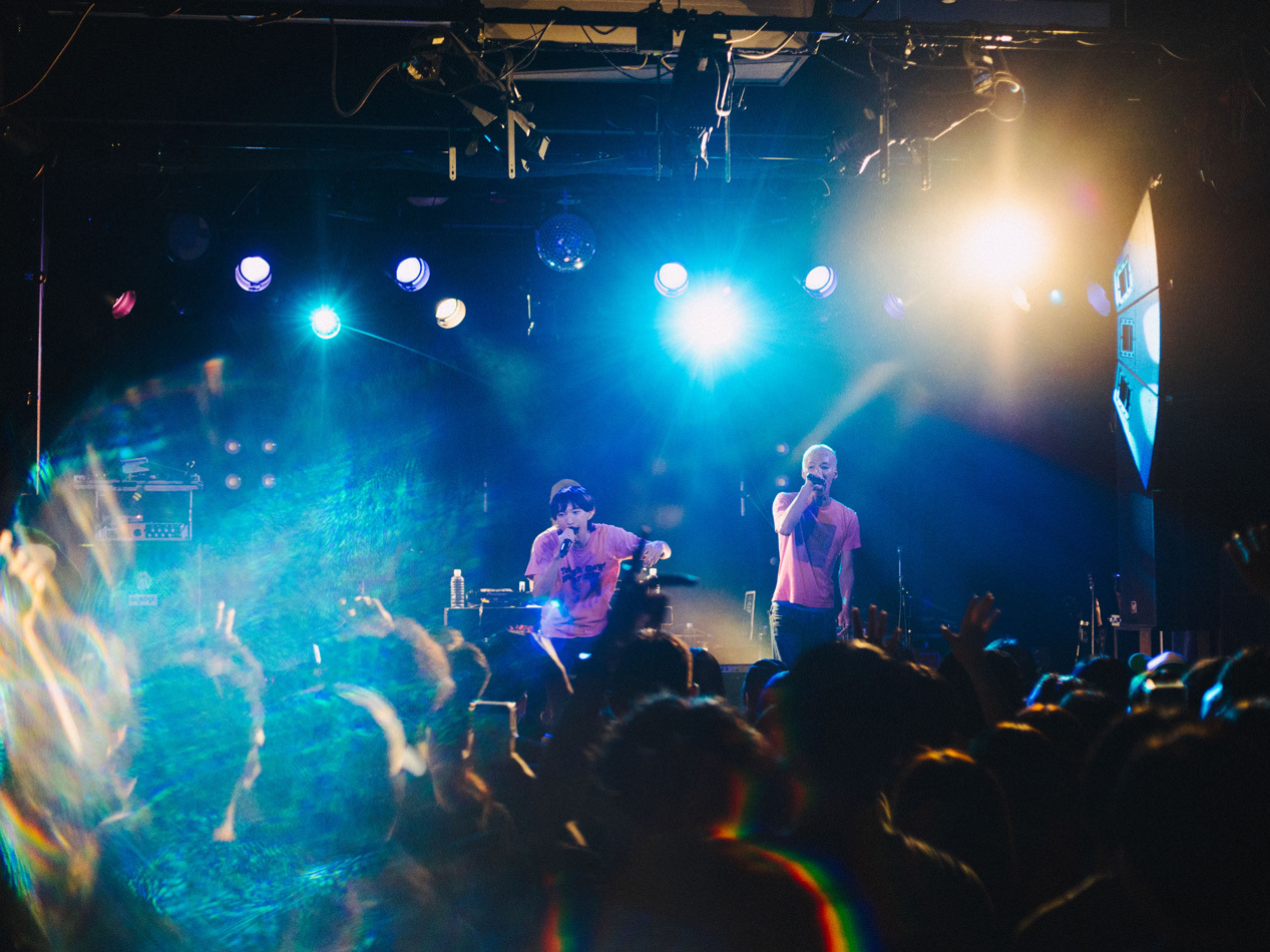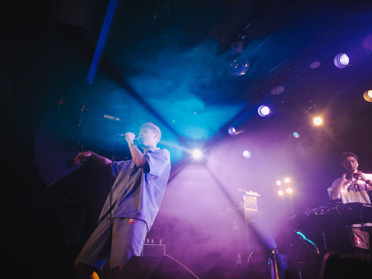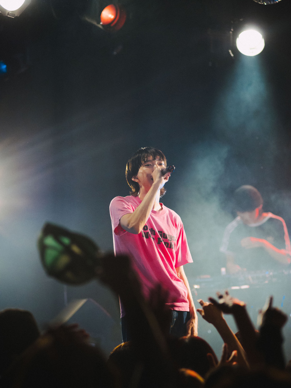 ライブは「OMG」でさらに最高潮へ。フォークソングの定番曲「オクラホマミキサー」をサンプリングしたトラックはポップなリズムが耳なじみ良すぎて、時間がアッという間に過ぎていく。ライブ後半は、7月19日にリリースしたばかりの新曲「白米」を披露。疾走感あるビートに乗せ、白く輝く白米を称える攻めのライムを構築しちゃう彼らの才能とセンスに思わず啞然としてしまう。終盤には「SANAGI」で改めて、卓越したセンスとストーリー性抜群なリリックを見せつける2人。「音楽に救われるぜ!」と、「DRUG」で気持ちを鼓舞するリリックとビートでフロアをハイジャンプで盛り上げ、ステージを締めくくった。