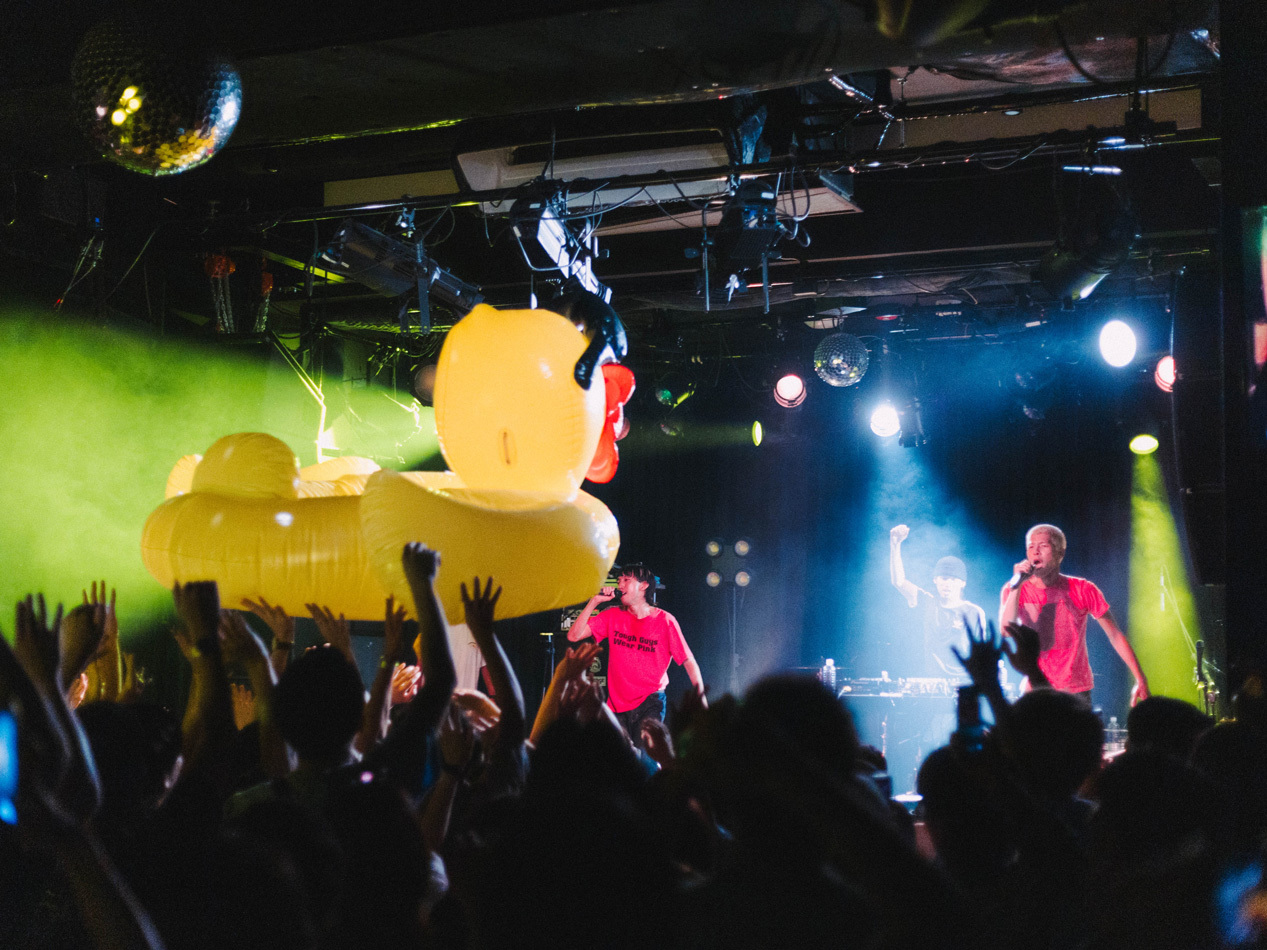 日常生活を切り取った楽曲が多い彼らにとって時事ネタもお手の物で、某大型自動車販売店のニュースを紐づけつつ、「乗り物の曲を4曲続けたい」と「軽自動車」「ダンボルギーニ」「高速道路」と連投。リリックでクスっとさせつつ、ハイなスキルもきっちりと見せるニクい一面に観客は興奮しまくりで、ファームハウス&サンテナと一緒になって踊り、歌う。ライブ中盤、息ぴったりのフロアをさらに煽るのは「アヒルボート」。ライブではおなじみのアヒル型ゴムボート(けっこう巨大!)をフロアに投げ込み、お祭り気分は最高潮に。コール&レスポンスも”アヒル””ボート”とポップ&キャッチーで、彼らのライブが初見の観客もあっという間に巻き込んでしまう。