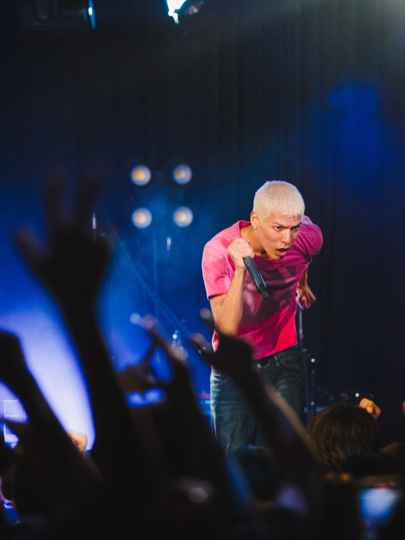 大阪でのライブは久しぶりだという彼ら。大声で騒いで踊れることにハイになりつつ、「最初に飛ばしすぎたんで、夏の曲を」と「ISCREM」へと繋ぐ。同曲はMVのセンスが最高なのだが、なんともいえない哀愁を感じるトラックに心がほっこり。かと思えば続く「LOUD」では、ファームハウスのスリリングでとんがったバースにフロアが熱狂。(ちなみにこの曲のMVもツッコミどころ満載で最高!) ポップなのにほどよい気だるさと皮肉さがこめられたリリック、中毒性満点のトラック、そしてファームハウスとサンテナのスプーキーなパフォーマンス。そしてDJ兼カメラマン兼マネージャー兼運転手兼スーパーバイザーのneo yoshikawa(役割多い!)のえぇ塩梅なバランスの取り方に、オーディエンスは大喜び。