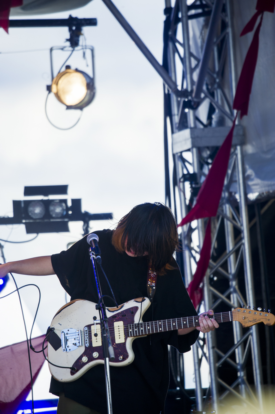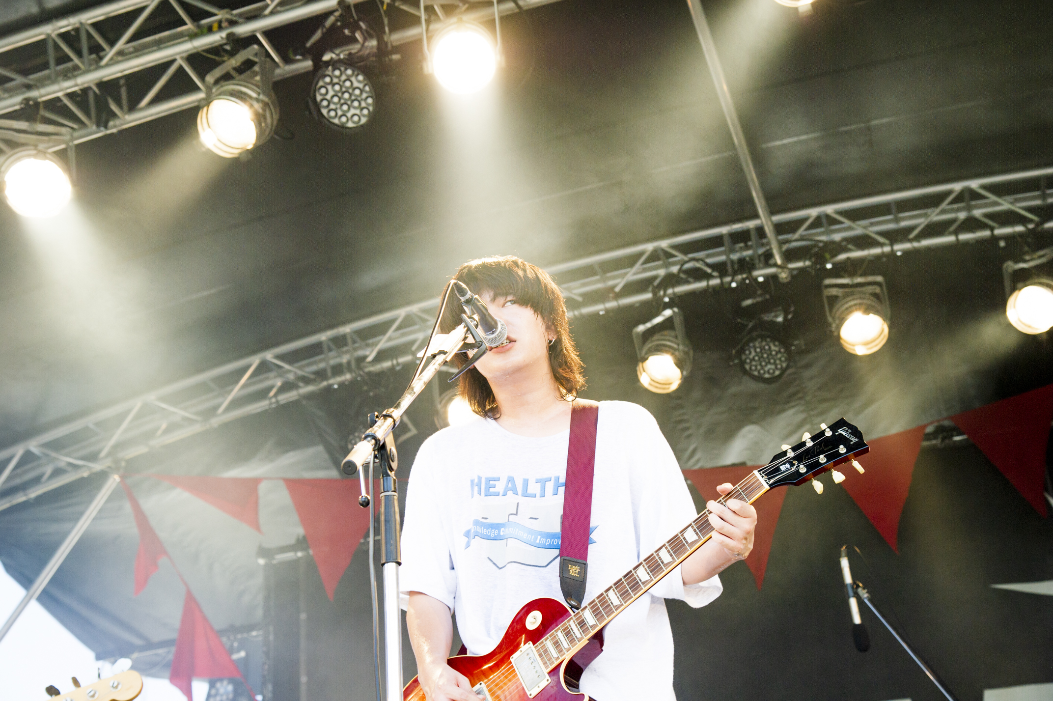 リハから観客の注目を集めていたのは、埼玉発のギターロックバンド・ペルシカリア。1曲目は、8月30日(水)にリリースするEP「俺様は世間に用がある」のリード曲「いびき」。初登場のステージでさっそく新作をぶつけてくる様は勇ましく、うだるような暑さにぴったりのナンバーをじっとりと聴かせる。