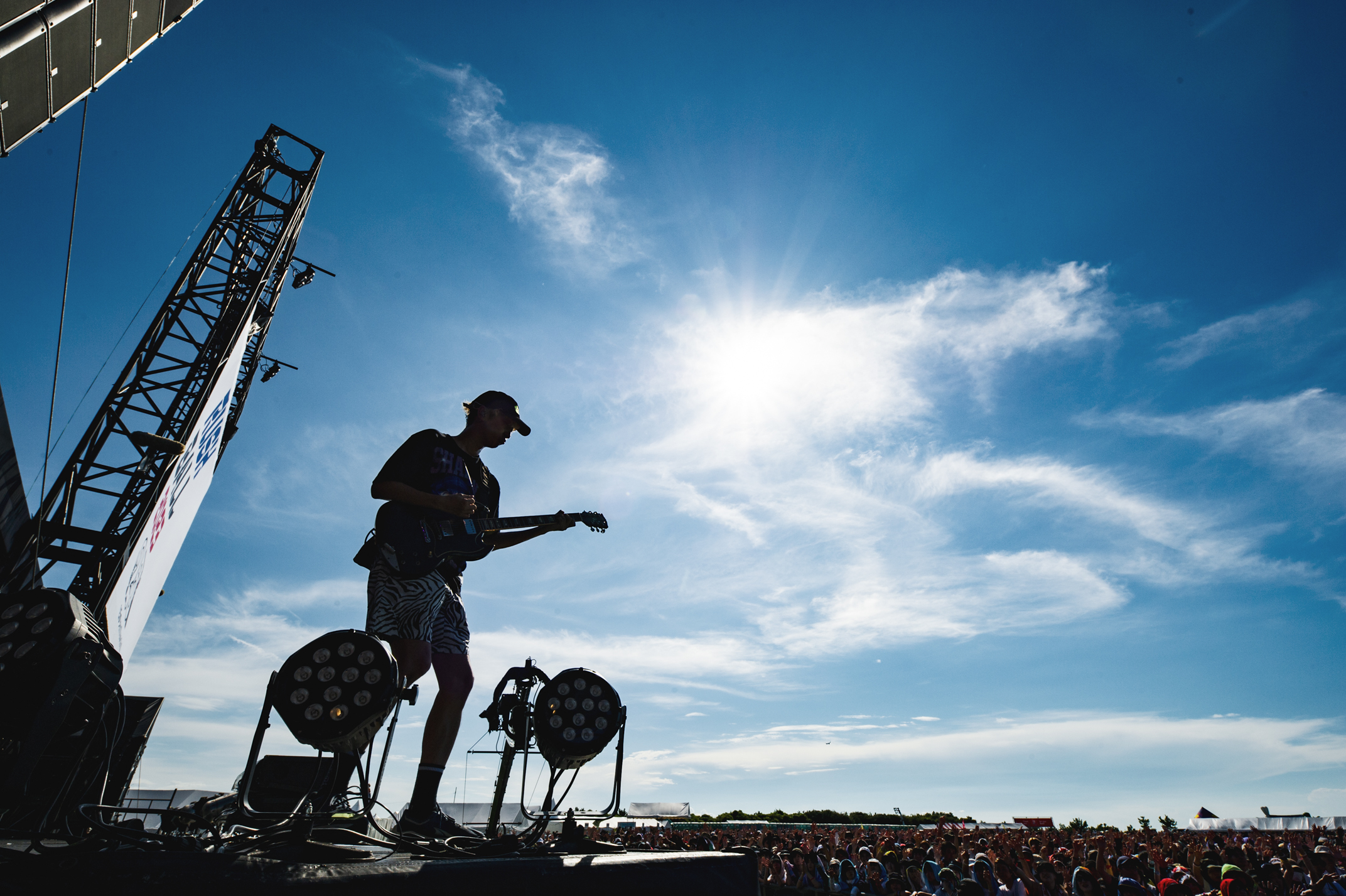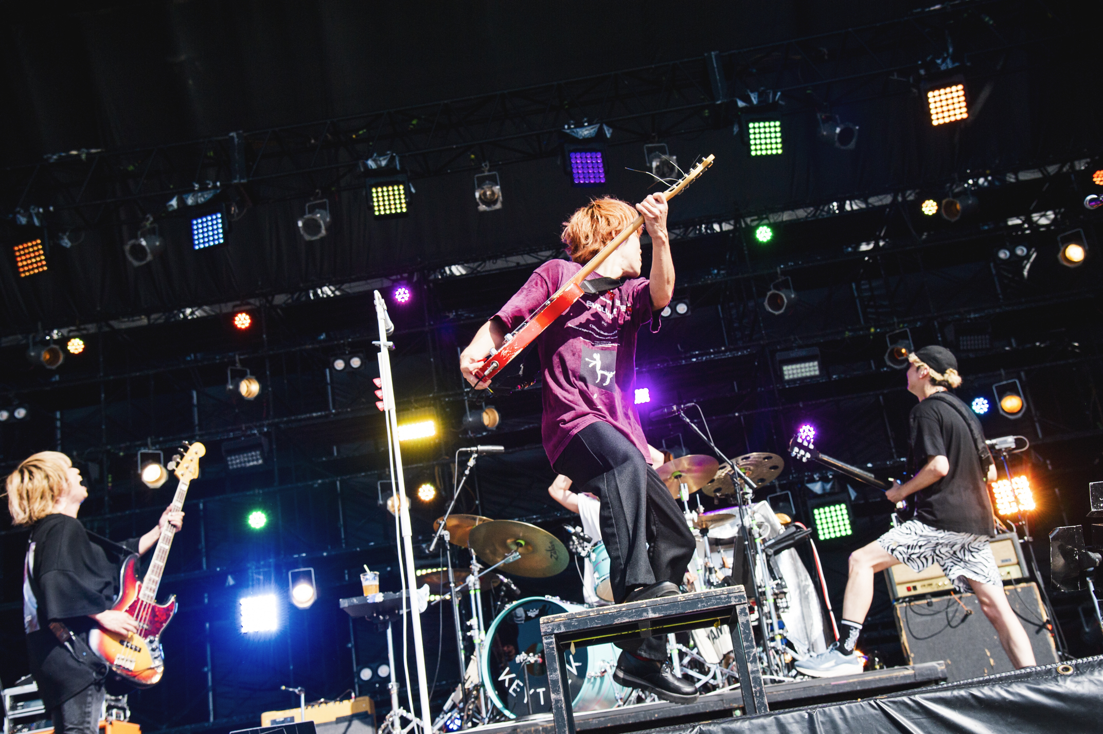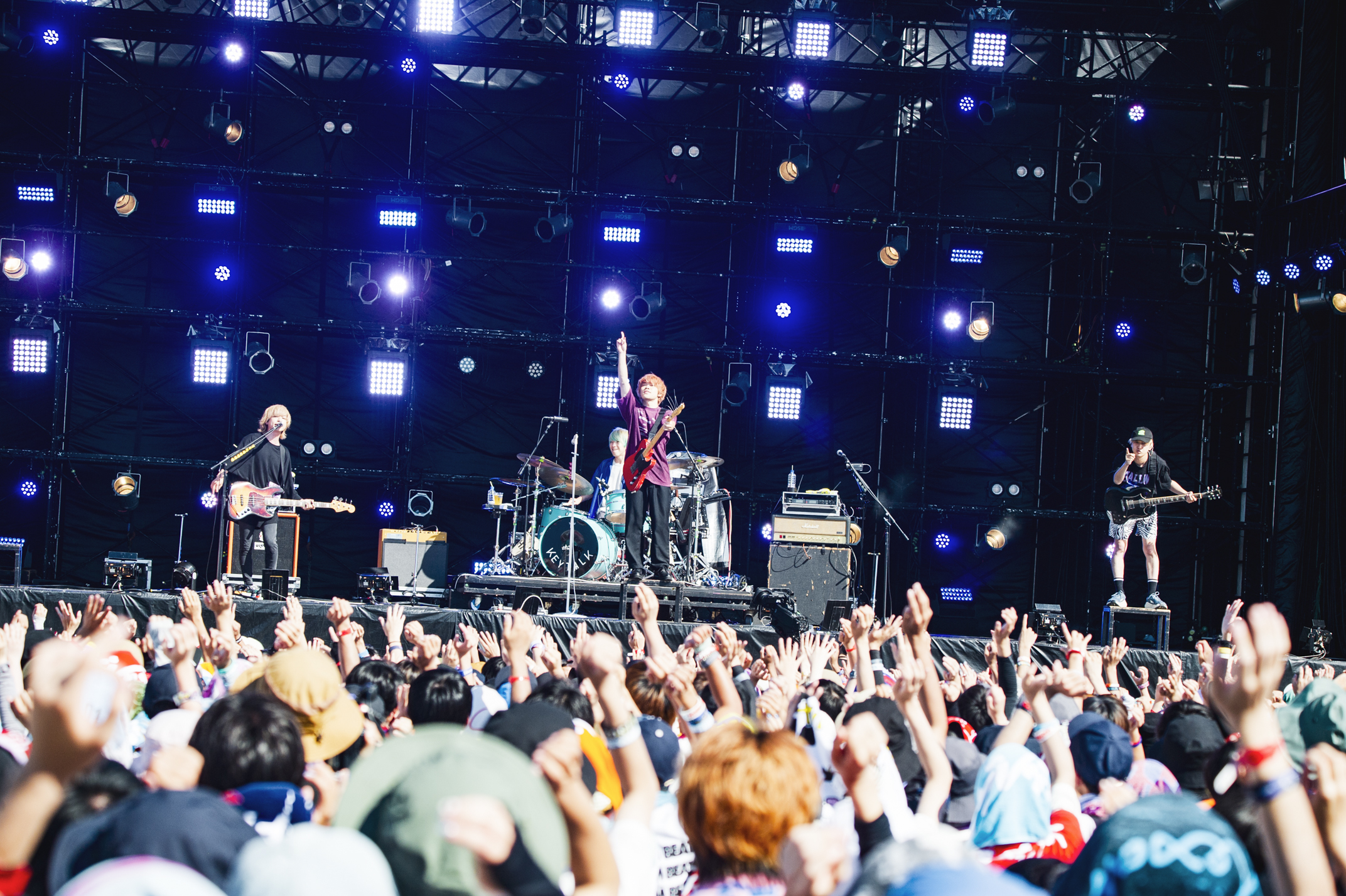 直前の出番だったフレデリックの三原健司(Vo.Gt)から「カッコ良いバンドがカッコ良いライブをする」とバトンを渡されたKEYTALK。元気よくステージに走り込み、「大脱走」からライブスタート。首藤義勝(Vo.Ba)と寺中友将(Vo.Gt)のハイトーンボイスに絡みつく、地を這うようなグルーヴィなサウンドで1曲目から爽快なまでに観客を踊らせる。間髪入れず「Summer Venus」を投下。空と芝生に溶ける伸びやかな歌声が気持ち良いと思えば、EDM要素が加わりお祭り騒ぎ状態に。小野武正(Gt.MC.Cho)はポップなギターを奏でながらステージを右へ左へ大きくダッシュ。