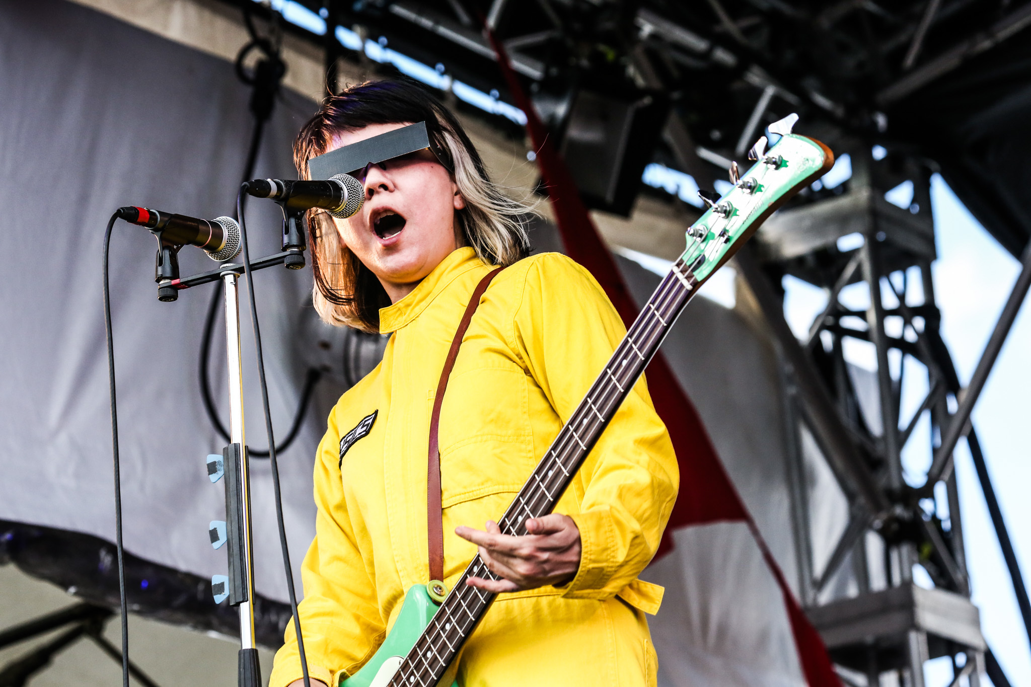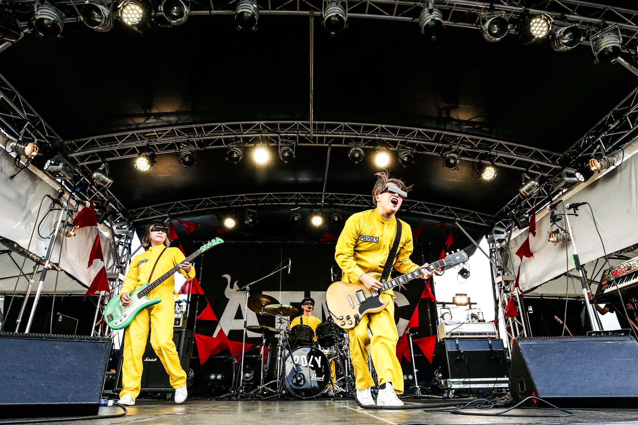 登場SEにノリながら、自らを奮い立たせながら気合いを入れているお馴染み黄色いツナギ姿のハヤシヒロユキ(Gt.Vo.Syn.Pro)に目が行く。そんな何気ない姿からも並々ならぬ気合いを感じた。『RUSH BALL』には第2回目の2000年度から出場しているキャリアを持つが、その頃からエネルギーの放出量は全く何も変わらないし、てか、増しているんじゃないかとさえ思う。シーケンスや同期サウンドは使用しているものの、そんなの関係無しで、こんなに3人で鳴らせるのという圧倒的な出音の凄み……。音量規制の無い泉大津フェニックスだからこそ、より感じてしまう……。ボコーダーボイスや同期のシンセの音色もバッチリ決まり気持ち良く、とにかく聴いているだけで勝手に体が踊っている。