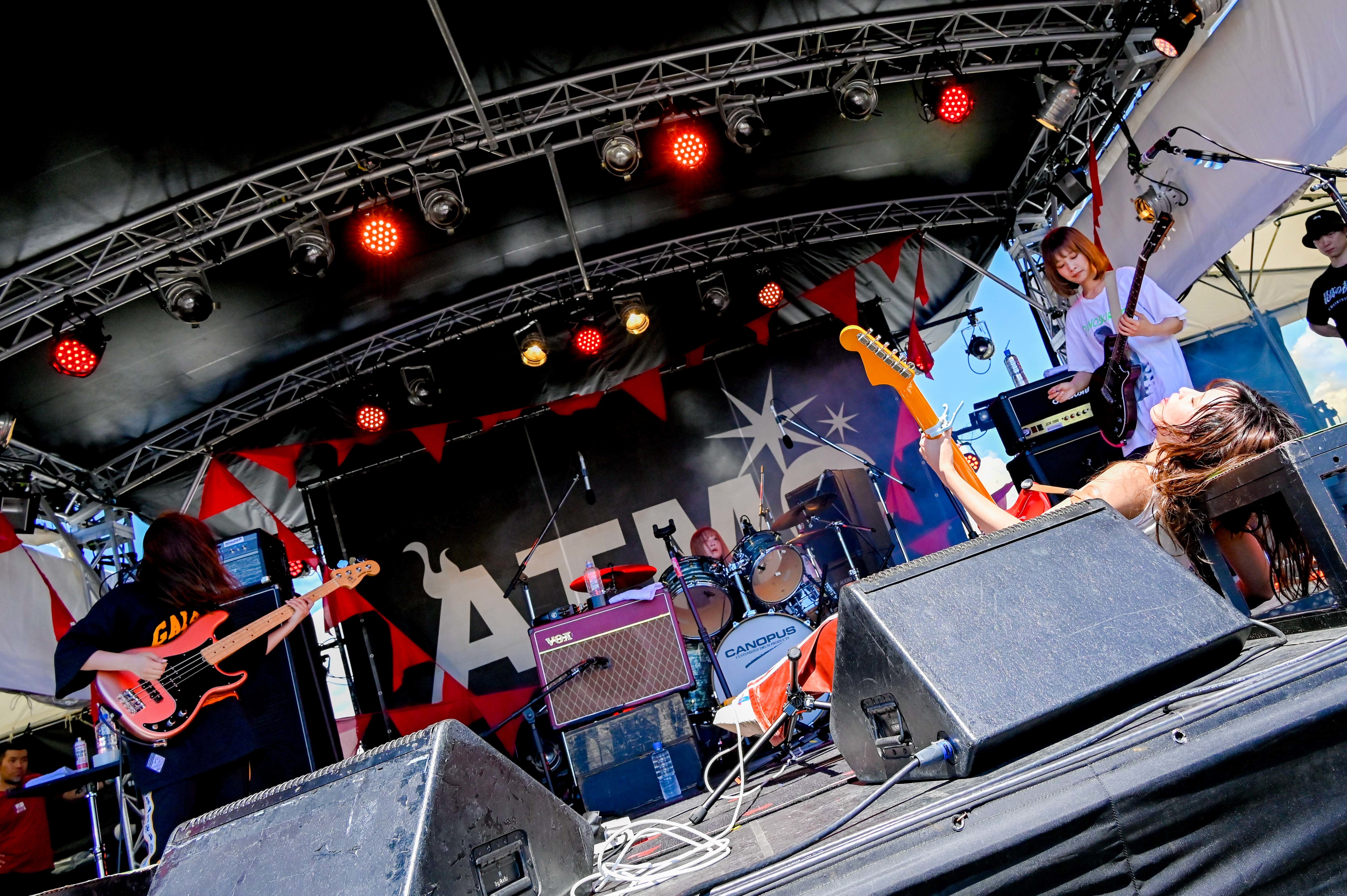 Tommy february6の「je t'aime ★ je t'aime」がSEで流れると、希(Gt)、あさか(Ba)、なお(Dr)、しーなちゃん(Vo.Gt)がステージに登場し、『RUSH BALL』に2度目の登場となる東京初期衝動のライブがスタート。じっくりと聴かせる「Becauseあいらぶゆー」で視線を引きつけながら、サビで一気に大爆発。しーなちゃんが観客の元へ飛び込む。この瞬間を着火点に、ATMCは熱狂が渦巻いていっく怒涛の展開となる。