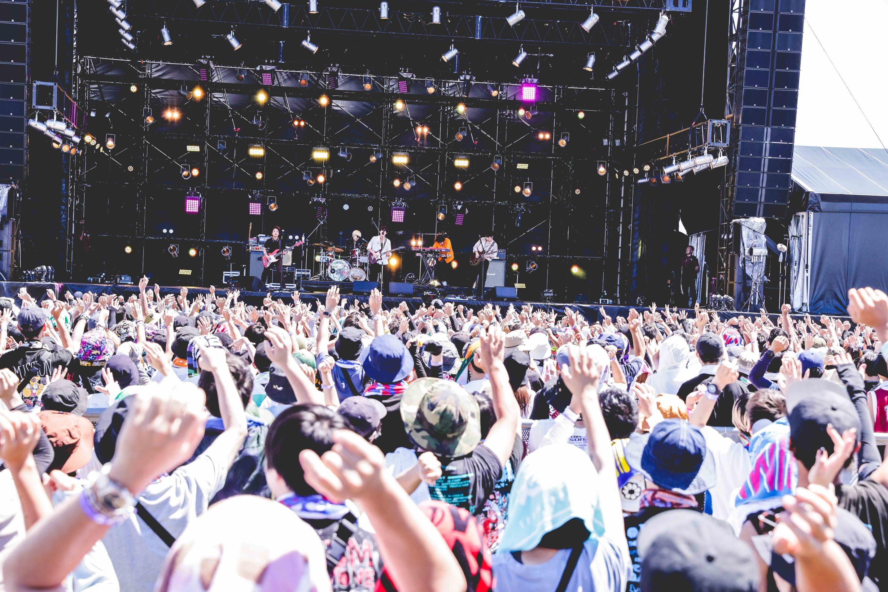そんなほのぼのしたやりとりを経て、甘酸っぱいメロディが弾け飛ぶ「お子様プレート」へ。何よりも彼らがあまりにも楽しそうだから、観ているこちらのテンションまで自動的に引き上げられていく。長谷川プリティ敬祐(Ba)がお約束の「EMAポーズ」で導いたのは、この日初解禁となった「エマ (alt ver.)」だ。サポートの井上惇志(Key)の軽快な鍵盤も効いた新鮮な表情のリアレンジで、より一層カラフルな音像を繰り広げていく。エンディングの「one shot kill」では、ハンドマイクでさらにあおりにあおる牧。広大な舞台の端から端まで、大観衆の一人も逃さないよう届ける彼らの姿勢に、オーディエンスも全力でレスポンス。祝祭感たっぷりのステージで、さらに大きなシルエットを見せてくれたgo!go!vanillasだった。