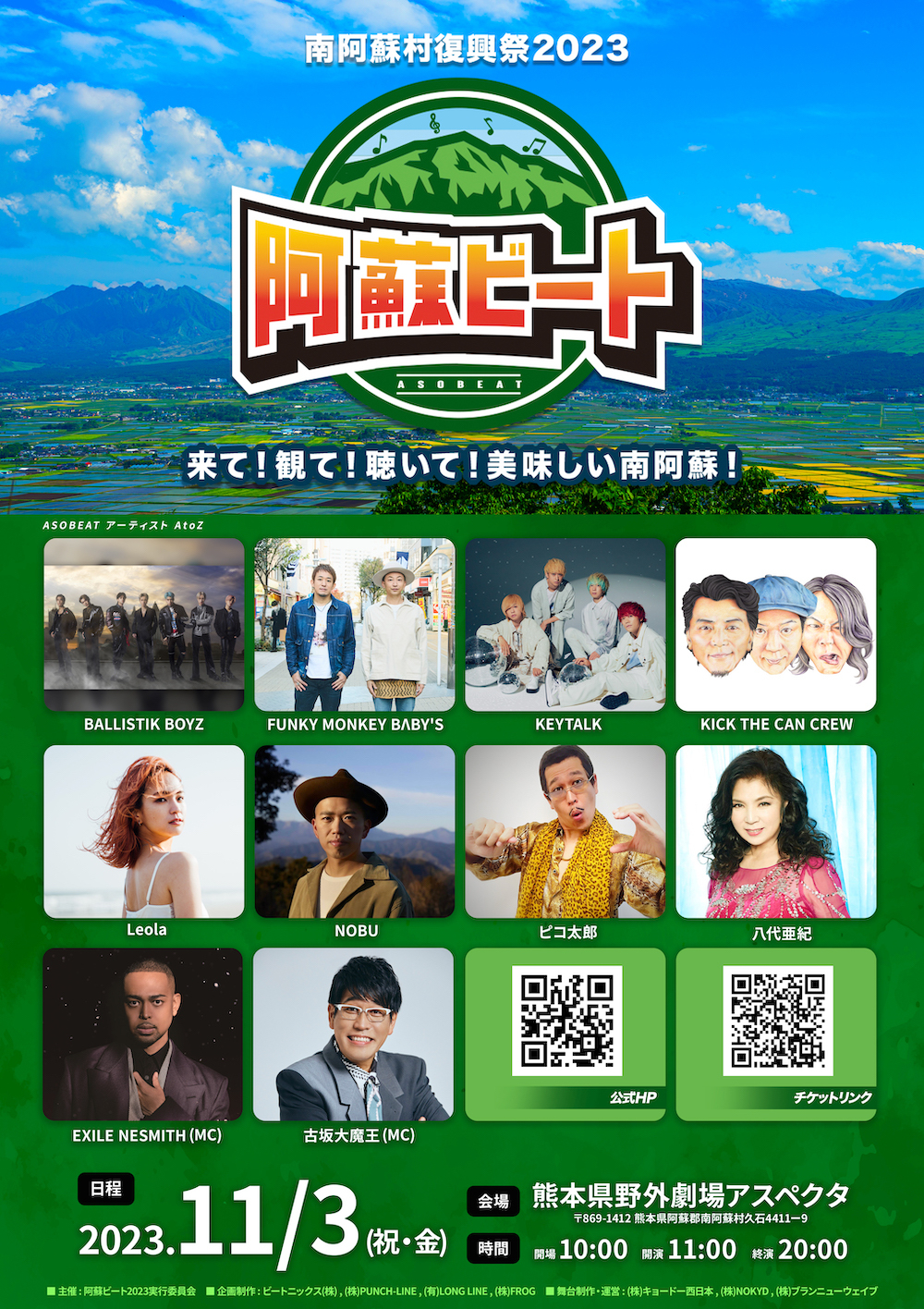 2023年11月3日(祝・金)に熊本県野外劇場アスペクタにて開催される南阿蘇の新たな野外フェスイベント『阿蘇ビート2023』の第2弾出演アーティストが発表された。