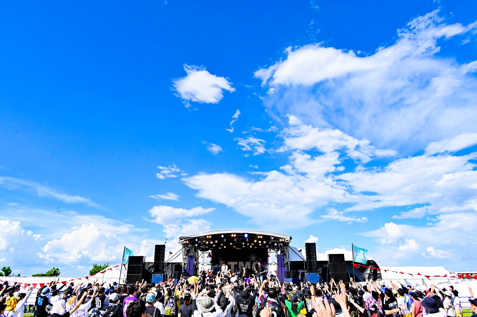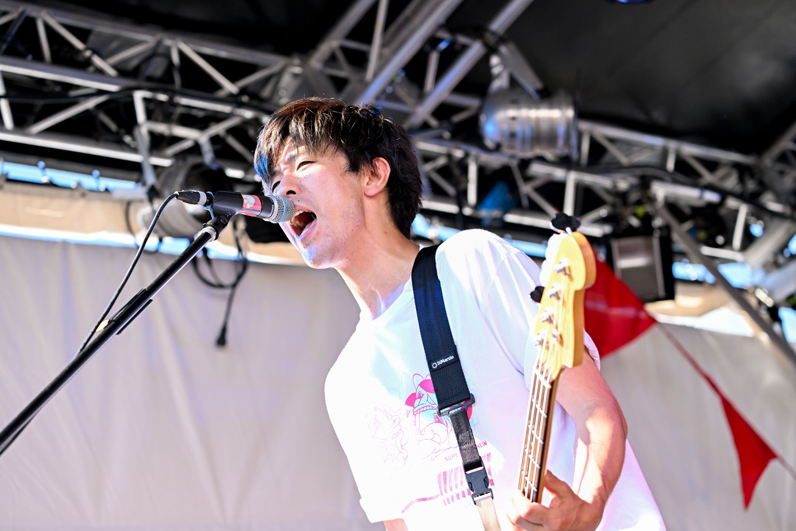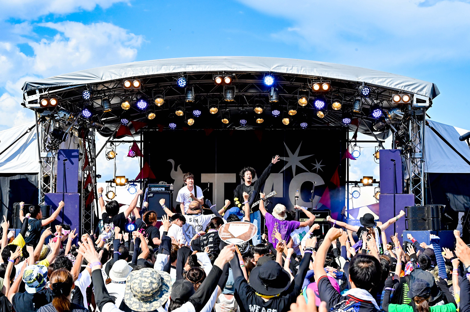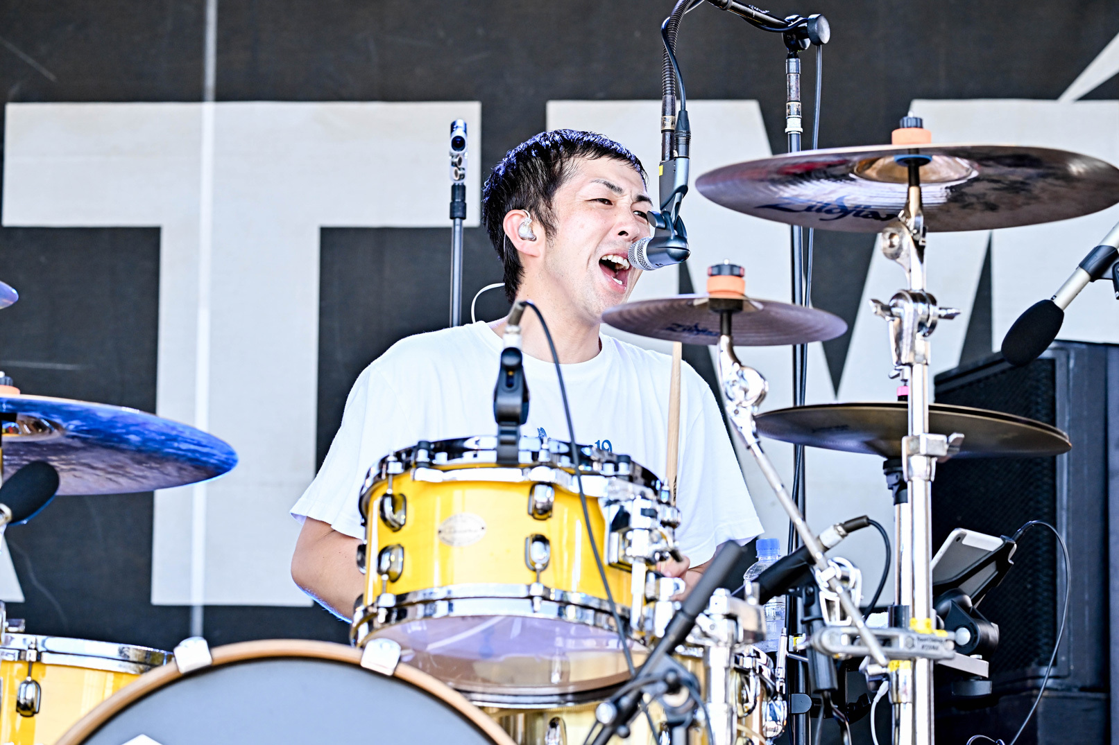 そこに笠原が「ライブ、フェス、当たり前じゃない。今日も変わらず命を燃やせてめちゃめちゃ感謝しています!」と放ち、いよいよ「STAY YOUTH FOREVER」で締めくくり。高まるベース、背中を押すドラム、敦賀の「全員来い!」の雄叫びに触発されて、<Wow Wow Wow>のシンガロングも盛大。時にそれはメンバーとオーディエンスの声だけで彩られ、言葉を超えた表現となって、コロナ禍を乗り超えた今日だからこその意味を持つ場面に。紛れもなく会場は一つになってまさに大団円。冷めそうにない興奮を残し、3人は舞台をあとにした。
