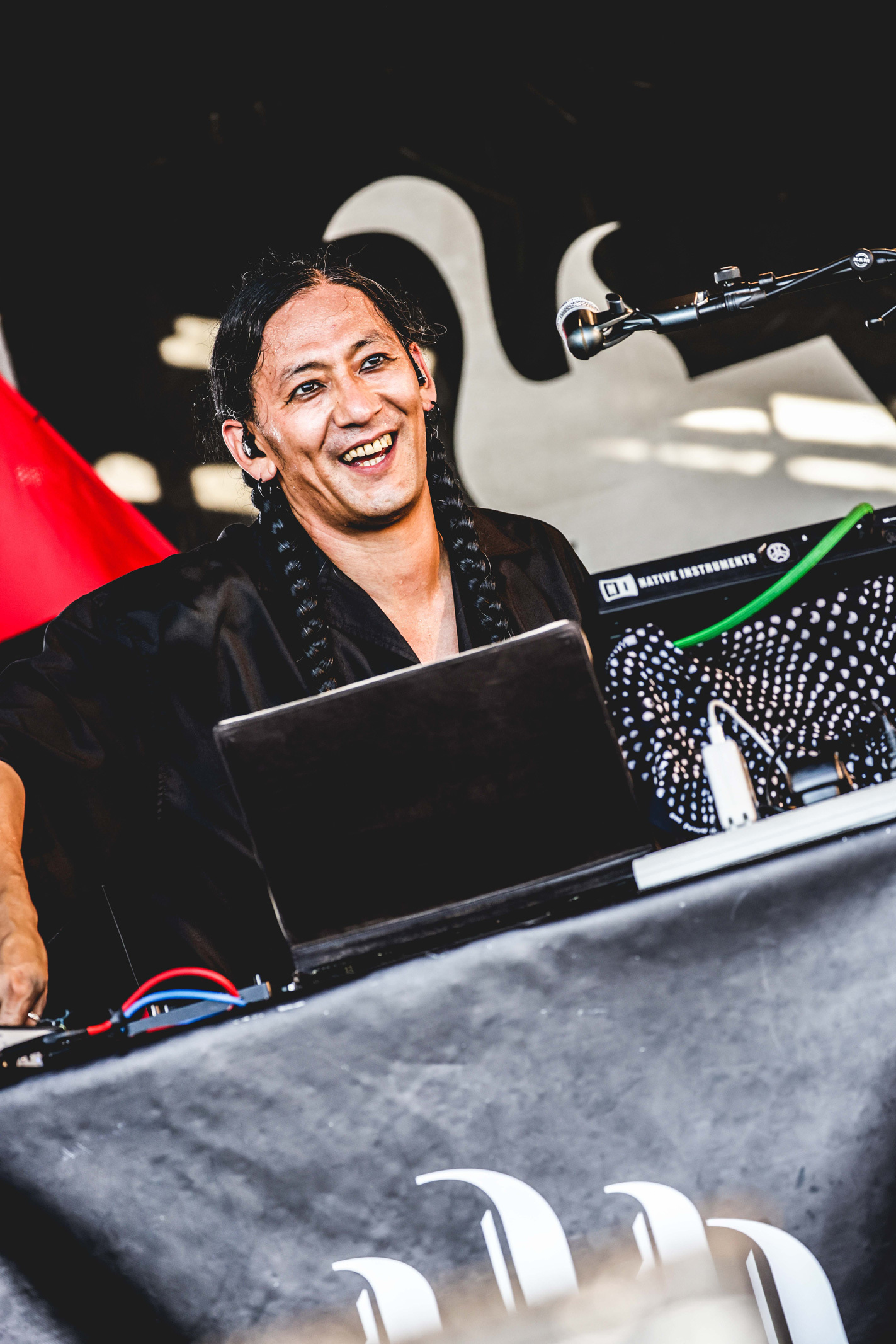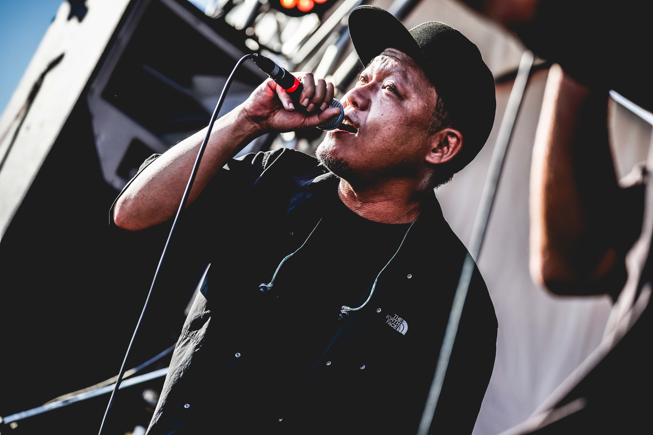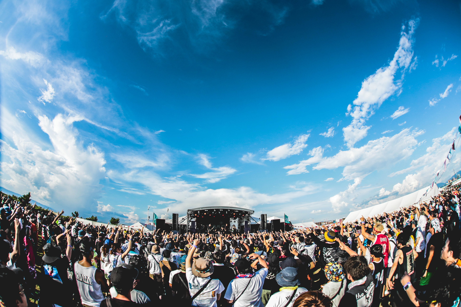 するとここで、大阪の盟友・UZMKのJUUがゲストで登場。3マイクは「Hot Jump」をより狂暴にまくし立て、人々をバウンドさせると再び大地が揺れるような感覚になる。そしてSATOSHIが初出演に関して感謝を述べると「気持ちを全力で音にぶつけたいと思います」と話して「涅槃」へ。夕暮れが近づくなか、今度は歌を聴かせて言葉を伝え、どこかエモーショナルなひと時に。