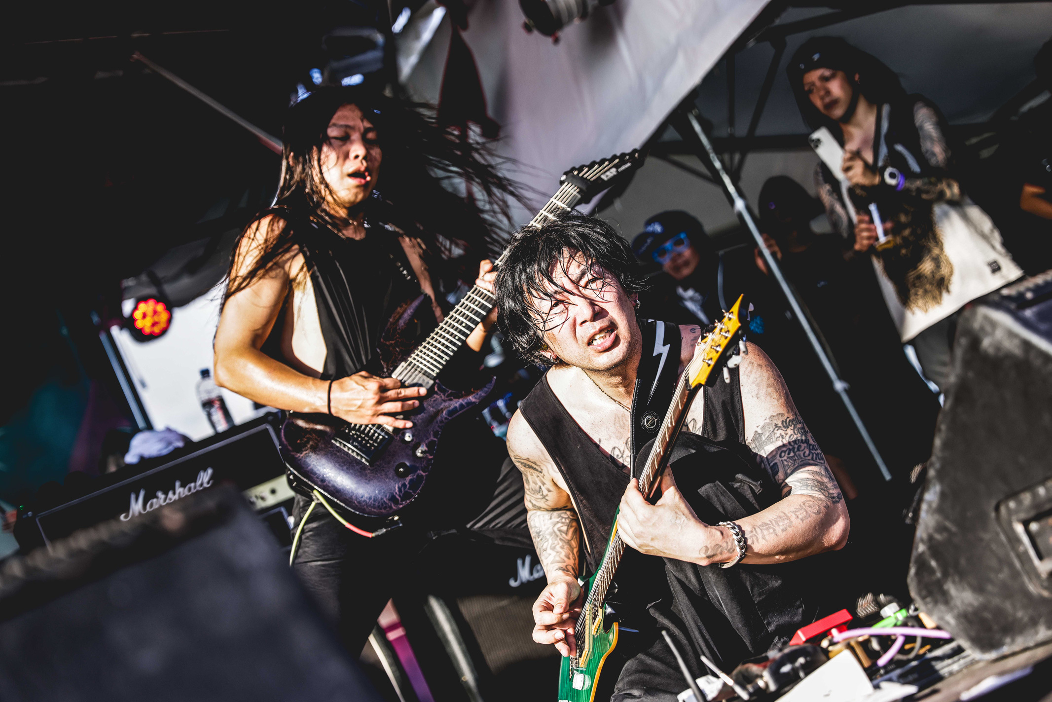 時刻は16:30を過ぎ、少し涼しい風が吹き始めたATMCにギュッと人が集まり待ち受けるのは、今日初めて『RUSH BALL』に降り立つ日本ミクスチャーロックのパイオニア。まずはバンド名を冠する「山嵐」で登場ののろしを上げ、KOJIMA(Vo)とSATOSHI(Vo)のテンポのいい掛け合いで引きつければ、オーディエンスも弾んで大地もゆらす勢い。さらに次はガッツポーズもきめて前のめりに「PAIN KILLER」。真骨頂の強烈ミクスチャーをガツンとお見舞いすれば、観客も両手を上げこたえ、ヘドバンも。腹に来るベースはさらに人を前方に集め、大きなクラップも響きだす。