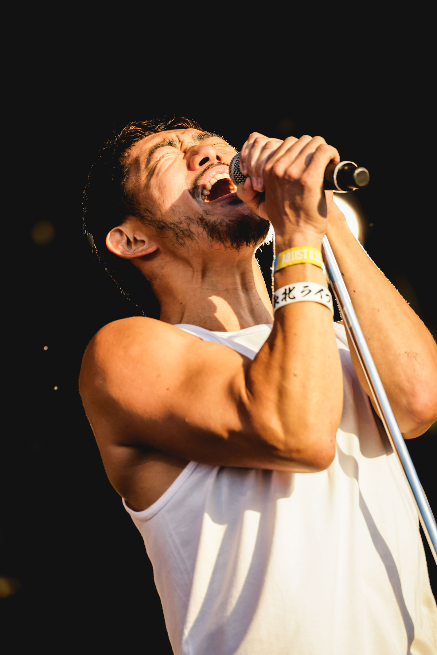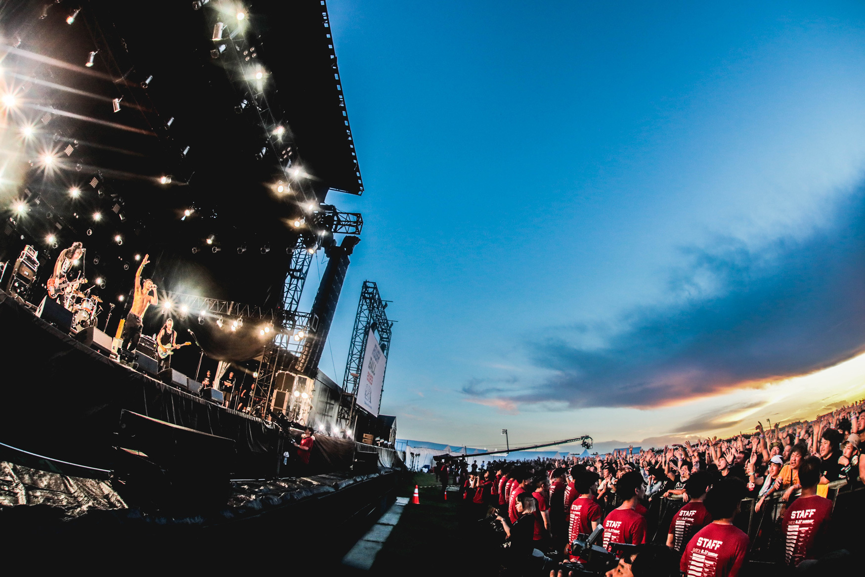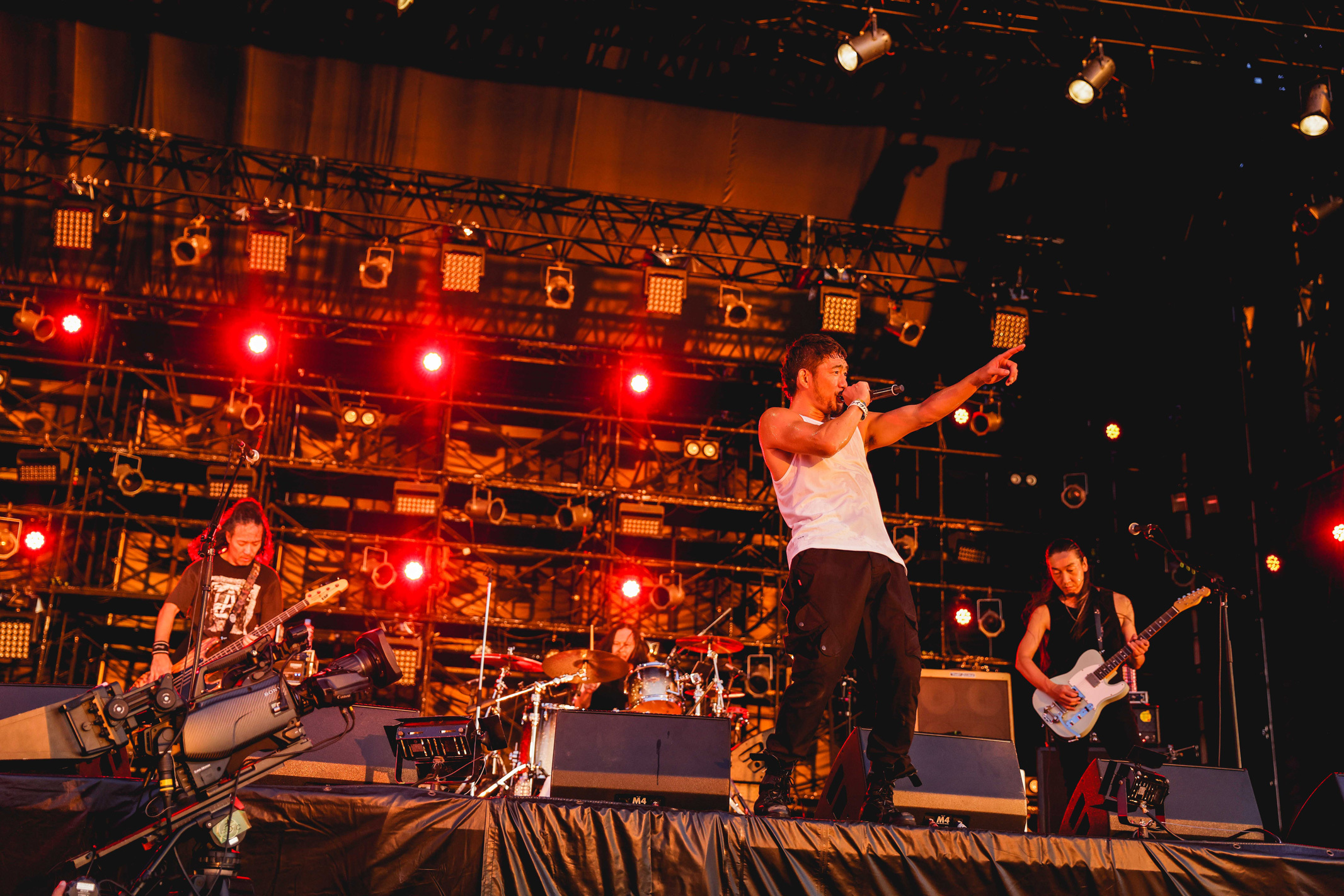 傾き始めた夕陽の下、オレンジ色に染まったステージから最初に投下されたのは「THAT’S ALL」だった。KOHKI(Gt)、MAKOTO(Ba)、RONZI(Dr)、そして白いタンクトップ姿のTOSHI-LOW(Vo)の4人が作り出す強靭なグルーヴがオレンジの空の下に轟くと、場内はたちまち興奮の坩堝と化していく。ステージ最前に大勢のオーディエンスが続々と押し寄せ、今度は笑顔で観客エリアに次々と戻っていくという歓喜のループが生まれる。