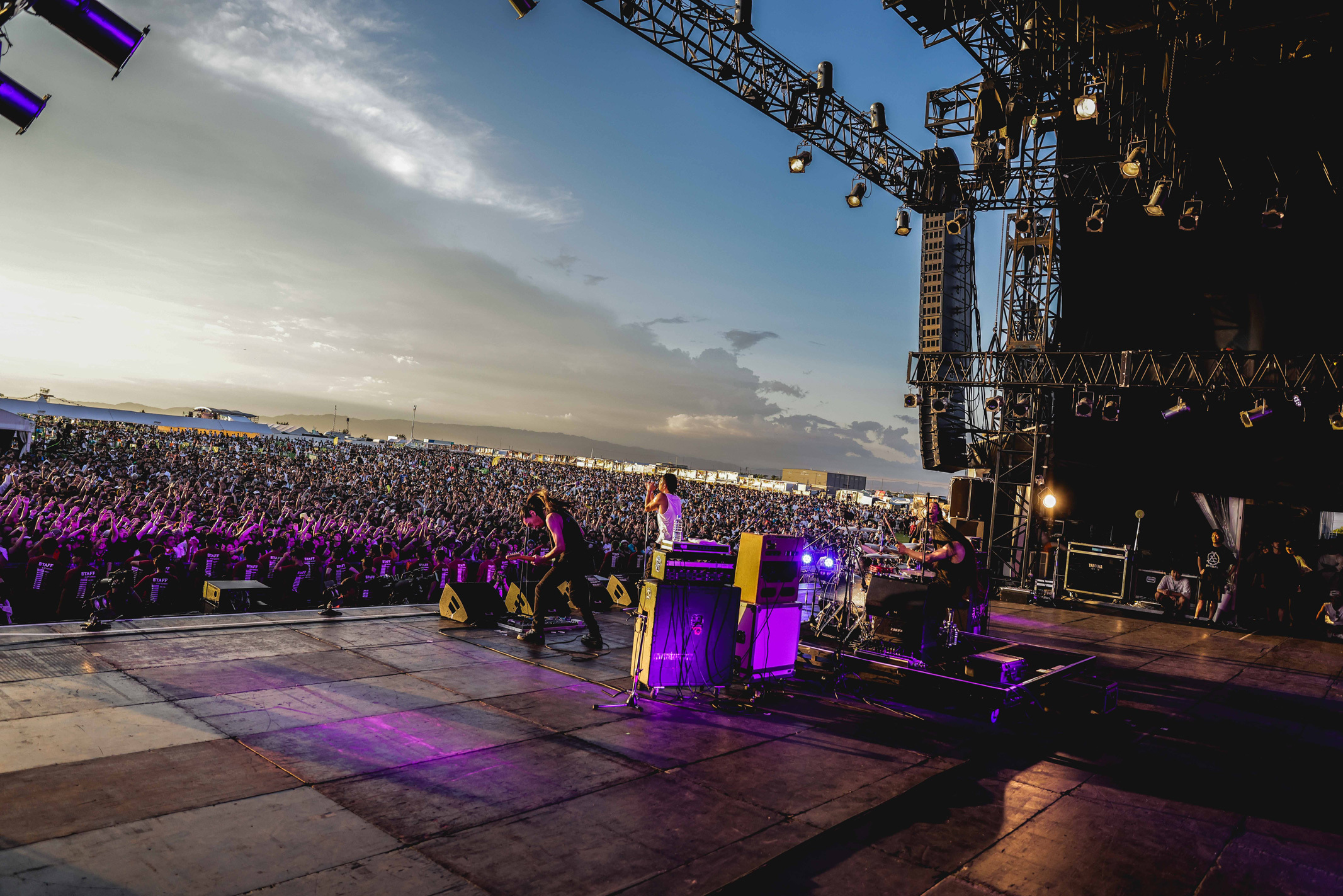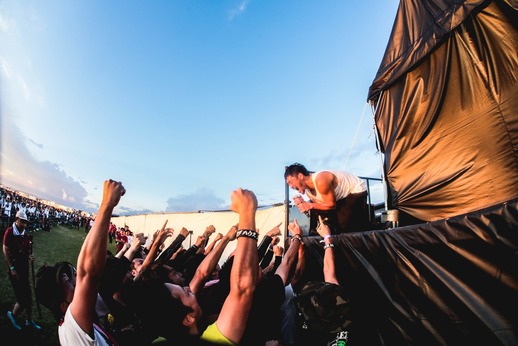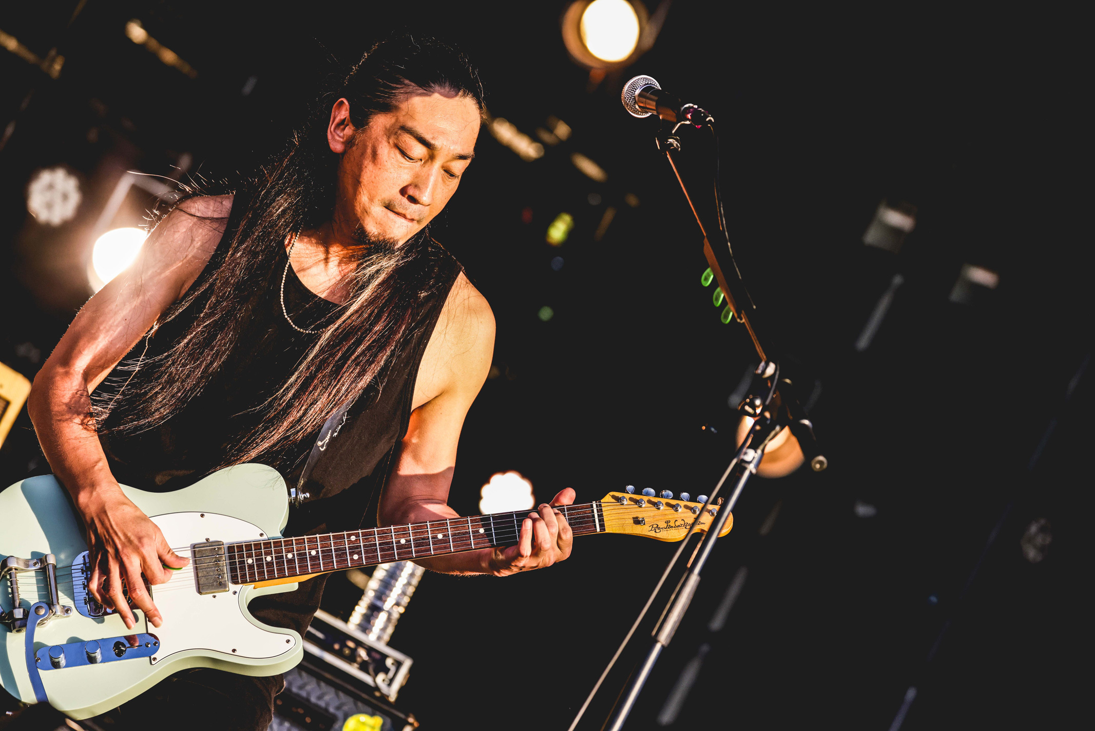 傾き始めた夕陽の下、オレンジ色に染まったステージから最初に投下されたのは「THAT’S ALL」だった。KOHKI(Gt)、MAKOTO(Ba)、RONZI(Dr)、そして白いタンクトップ姿のTOSHI-LOW(Vo)の4人が作り出す強靭なグルーヴがオレンジの空の下に轟くと、場内はたちまち興奮の坩堝と化していく。ステージ最前に大勢のオーディエンスが続々と押し寄せ、今度は笑顔で観客エリアに次々と戻っていくという歓喜のループが生まれる。