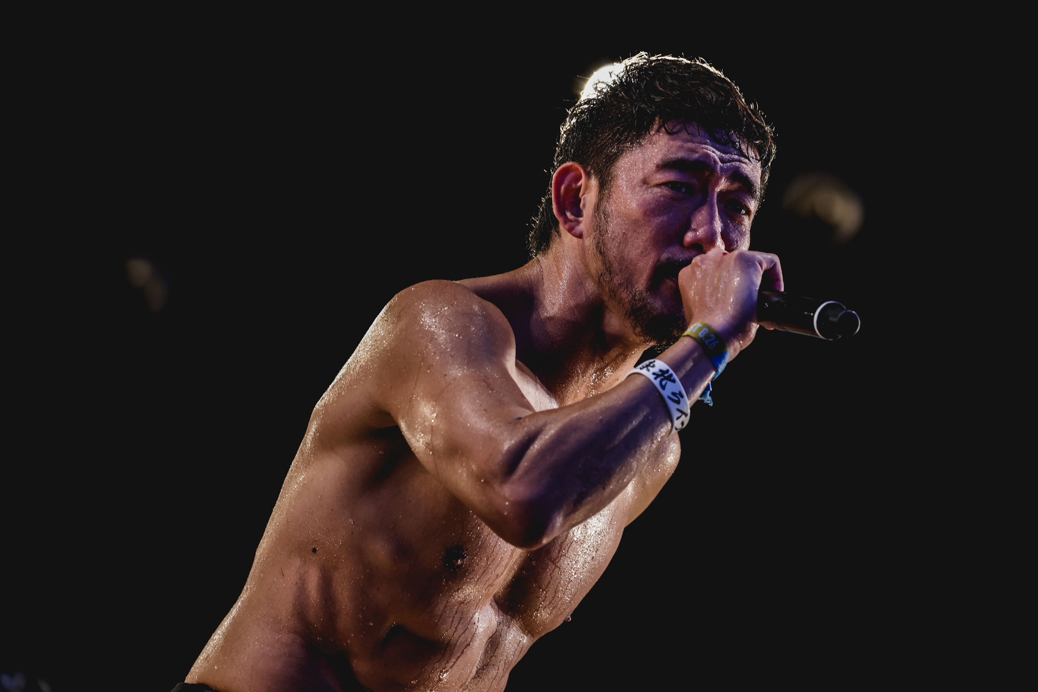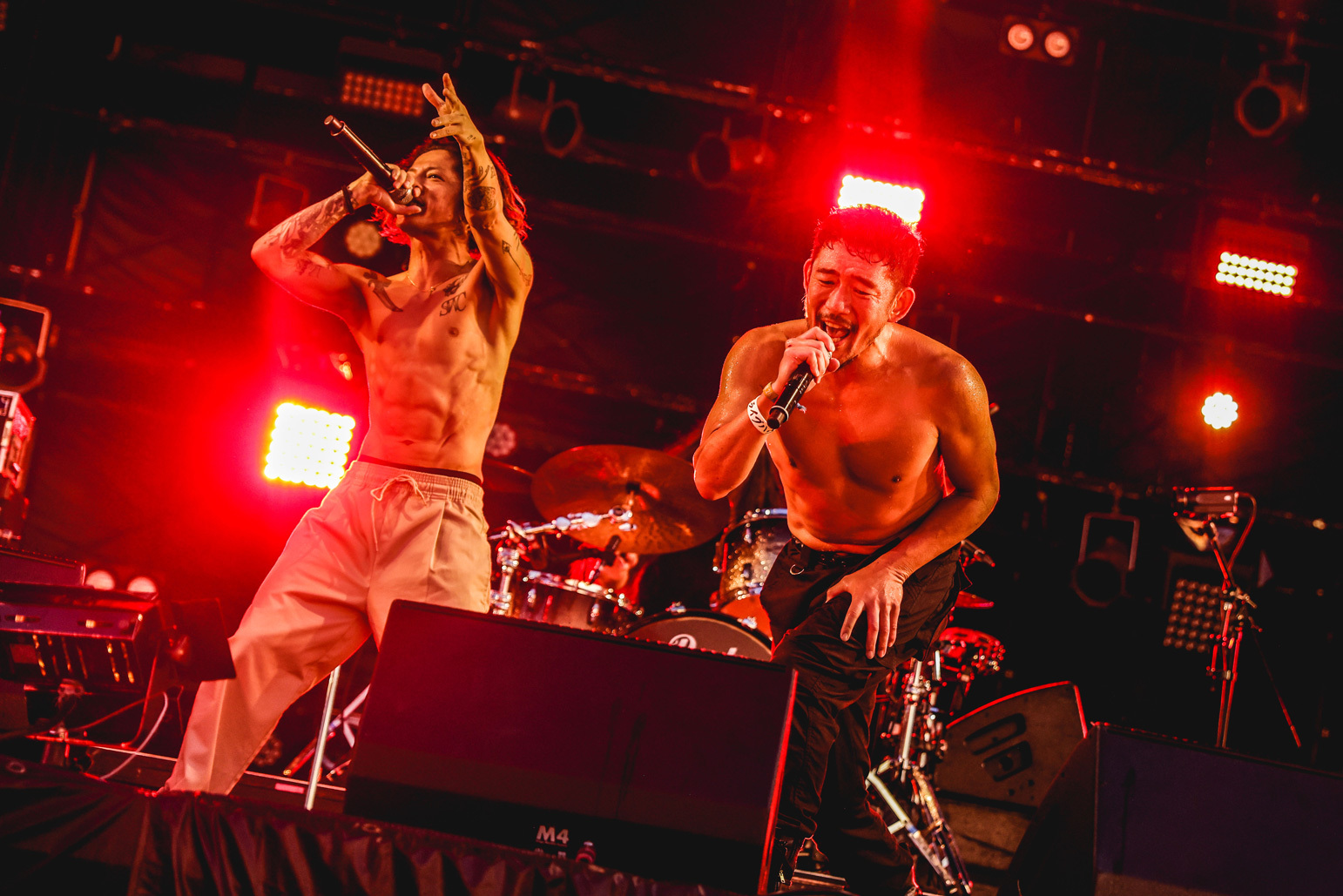 「BRAHMAN始めます」というTOSHI-LOWの声で始まった「賽の河原」、そして「BEYOND THE MOUNTAIN」では、TOSHI-LOWが下手側のサイドスステージ端に移動して熱唱したりと怒涛のライブが続く。そして、いつの間にか上半身裸になっていたTOSHI-LOWが歌い始めたのは、Dragon AshのトリビュートアルバムでBRAHMANがカバーしたDragon Ashの名曲「few lights till night」だった。すると、この日のトリを飾るDragon AshのKjが、同じく上半身裸でステージに登場。ロック界が誇る筋肉の共演に場内も大熱狂だ。