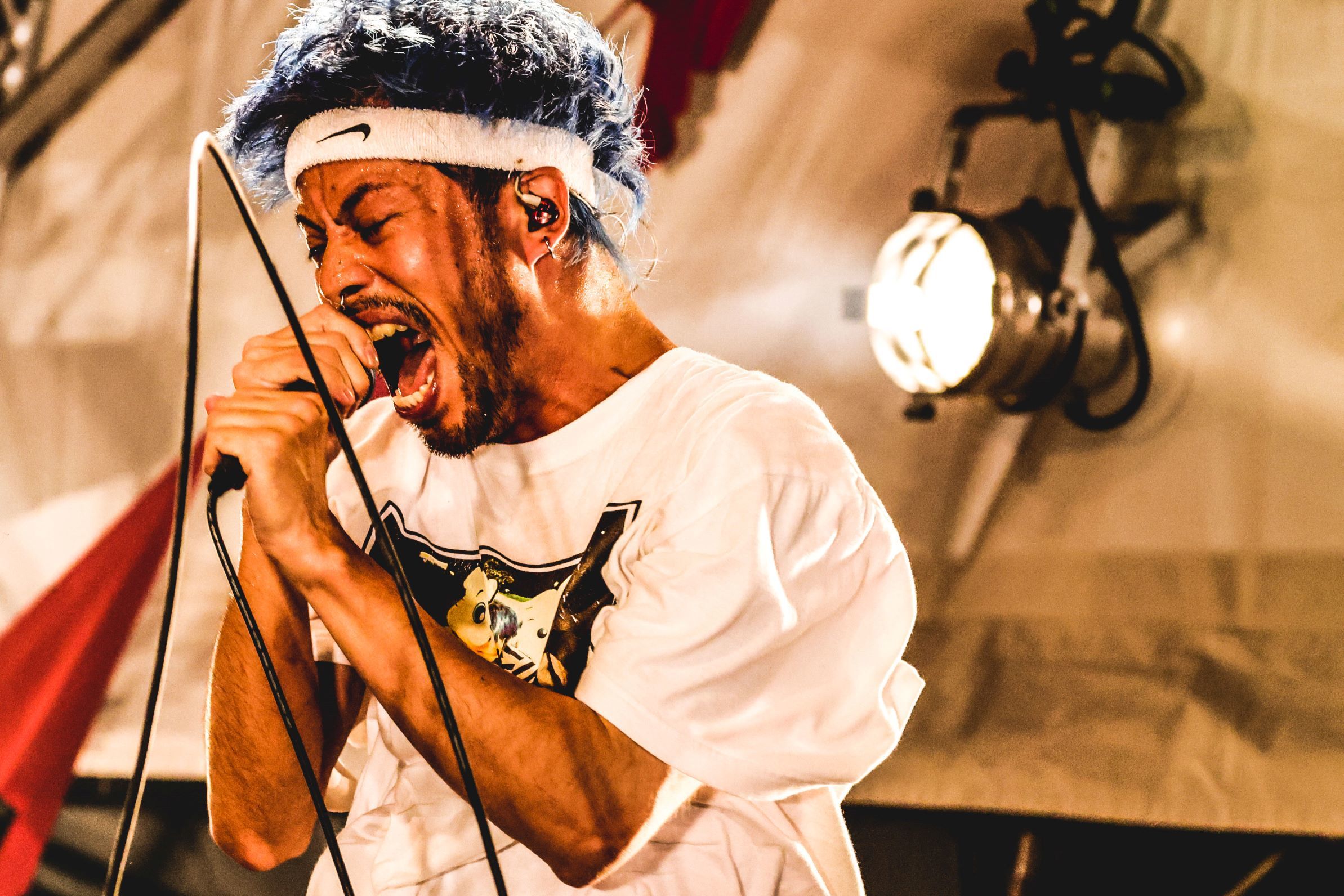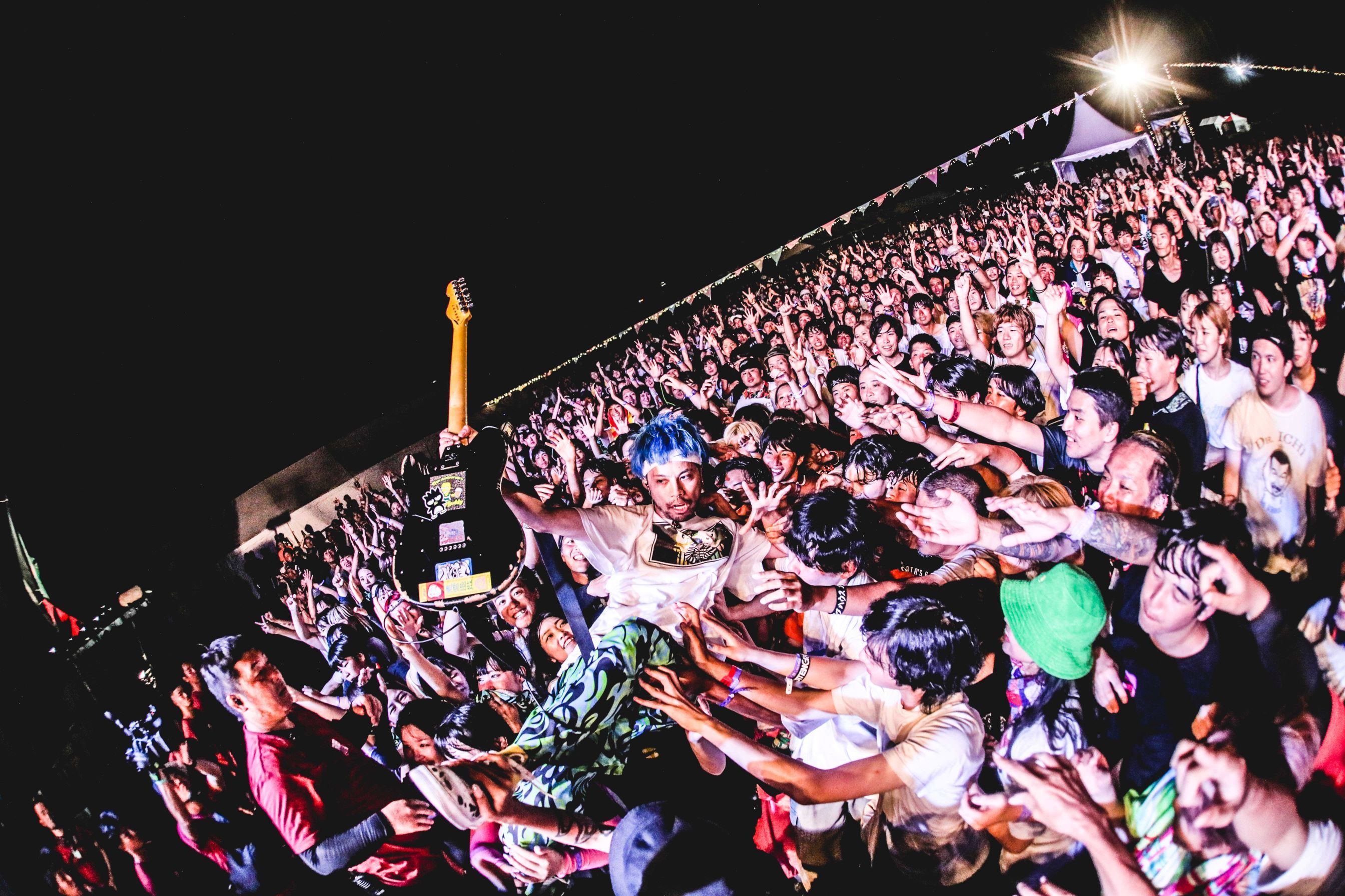 アンコールを求めるクラップが自然発生し、再びステージに躍り出たメンバー。「速くてうるさいやつ、いきたいんじゃないですか?」と「STEAL!!」を爆音で叩き込むと、観客はジャンプやツーステップとそれぞれの盛り上がり方で大騒ぎ。タナカも客席にダイブし、サーフしながらPA卓の前まで大移動。そしてPAの横の櫓によじ登り、そこでフィニッシュ! これぞスサシ! というパフォーマンスで盛大に締め括った。