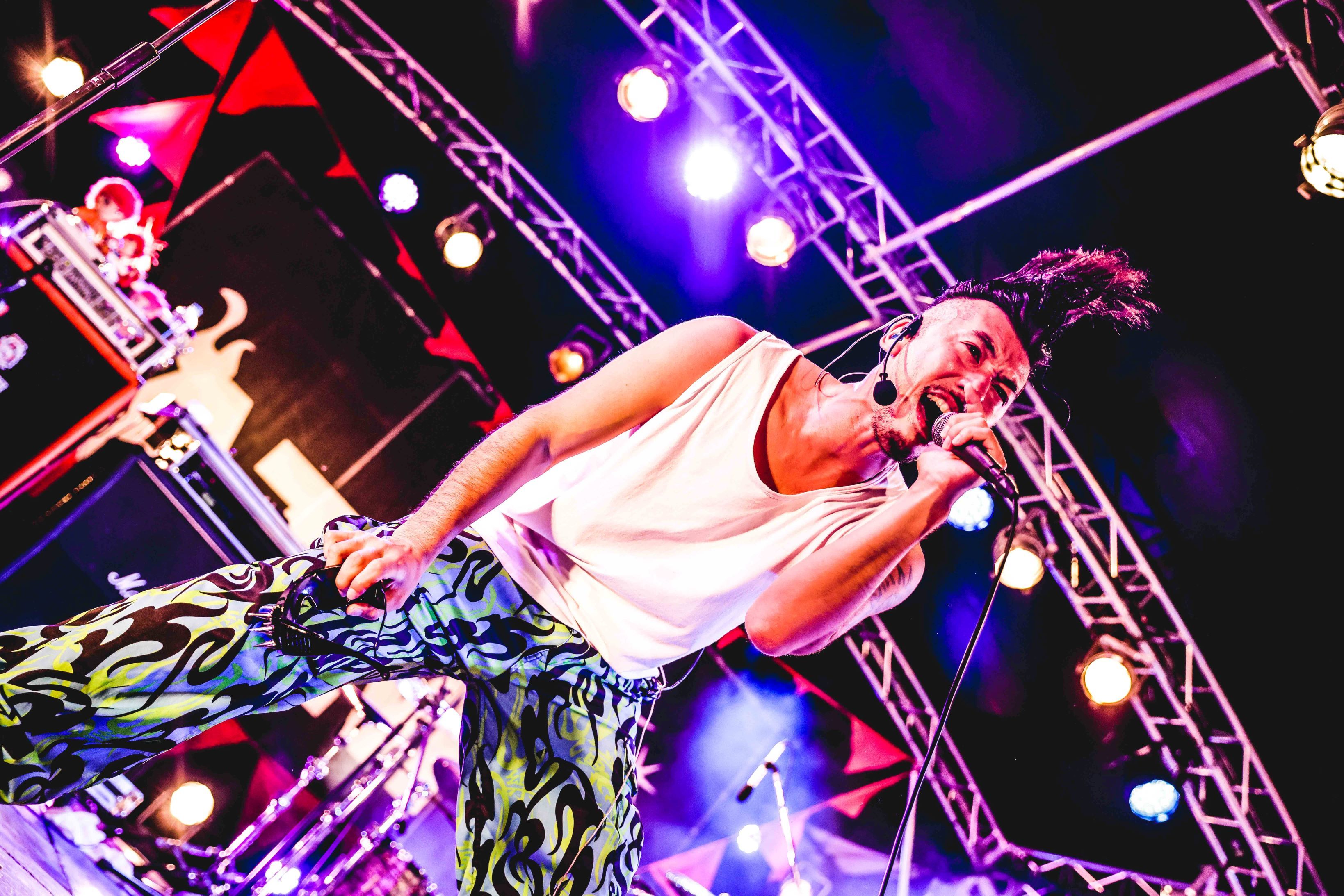 タナカは脚立の上に乗り、チヨ(Ba.Cho)とタクマ(Syn.Gt.Cho)はスピーカーの上に立ち、イチロー(Dr.Cho.169)もイヤホンマイクをつけてステージを上手へ下手へ動きながら観客を煽る。アグレッシブな展開に、一体どこを見れば良いのかと目が忙しい。さらに「憂うぎゃる」、「SKIMMING ME!!」、「YELLOW」と盛り上がり必至の楽曲を連投。ラウドやヒップホップ、エレクトロといった要素とロックが融合したサウンドの幅広さを提示する。そしてタナカは「『RUSH BALL』が25周年続いたことに対しての打ち上げを、この25分間使って俺らがやっていくんで、盛大に踊って帰ってください」(タナカ、以下同)と放ち「ゆーれい」を披露。