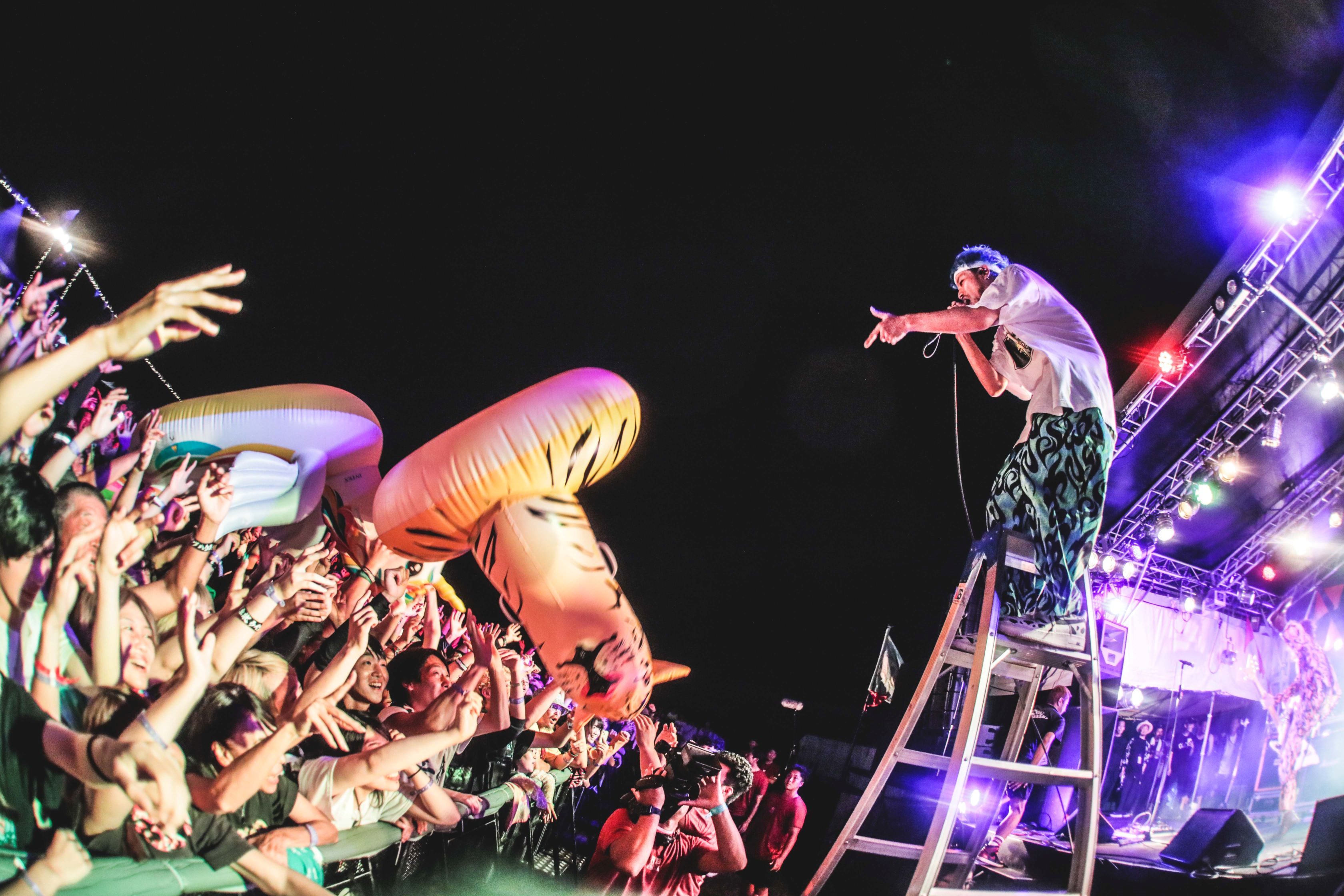 25周年の2日目を締め括るのは、昨年の『RUSH BALL 2022』でメインステージのO.A.をつとめたSPARK!!SOUND!!SHOW!!(以下、スサシ)。SEが流れてメンバーが登場すると、虎・蛇・ユニコーンのビーチ用フロートが観客の頭上を舞う。早速何が起きているのか!? と理解するのにやや時間を要してしまった。タナカユーキ(Vo.Gt)は笑顔で「『RUSH BALL』25周年おめでとうございます。大トリDragon Ashの後にぶちかますSPARK!!SOUND!!SHOW!!、どんだけ見たい? 見せたげる」と述べて「HAPPY BIRTH DIE」を投下。のっけからダンスタイムのスタートだ!
