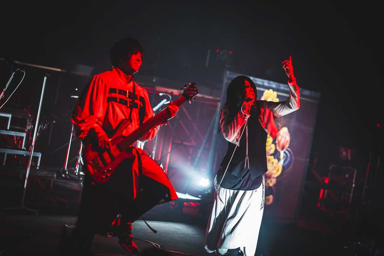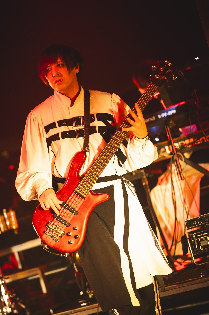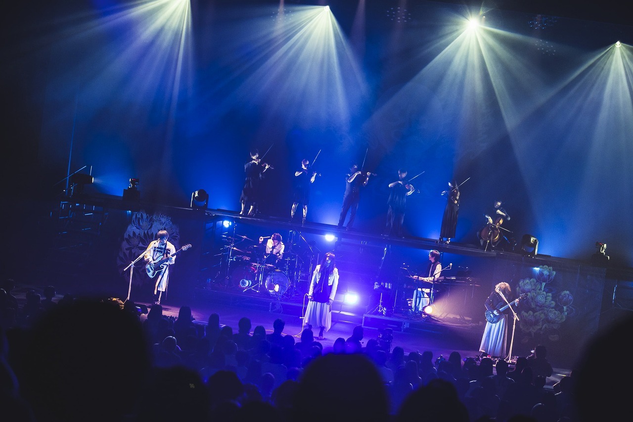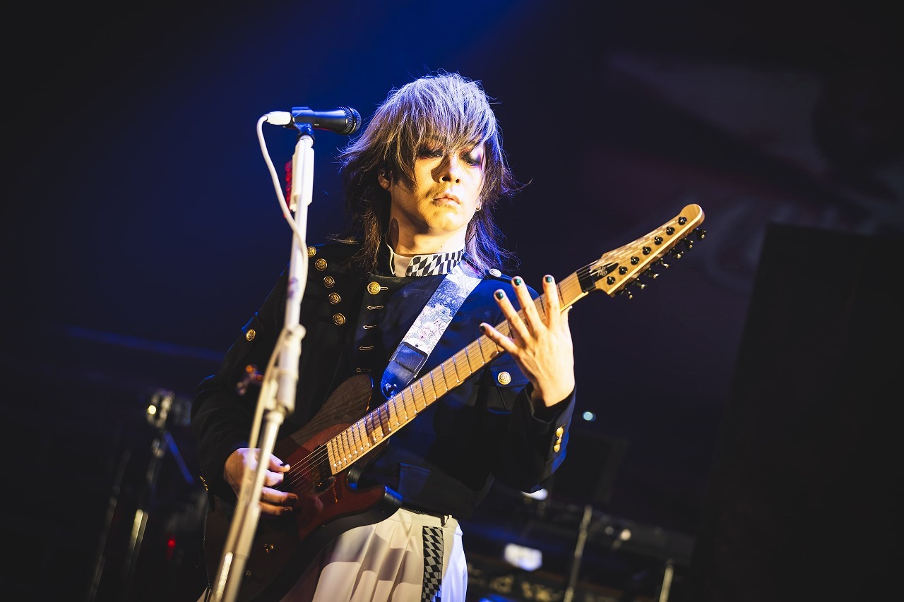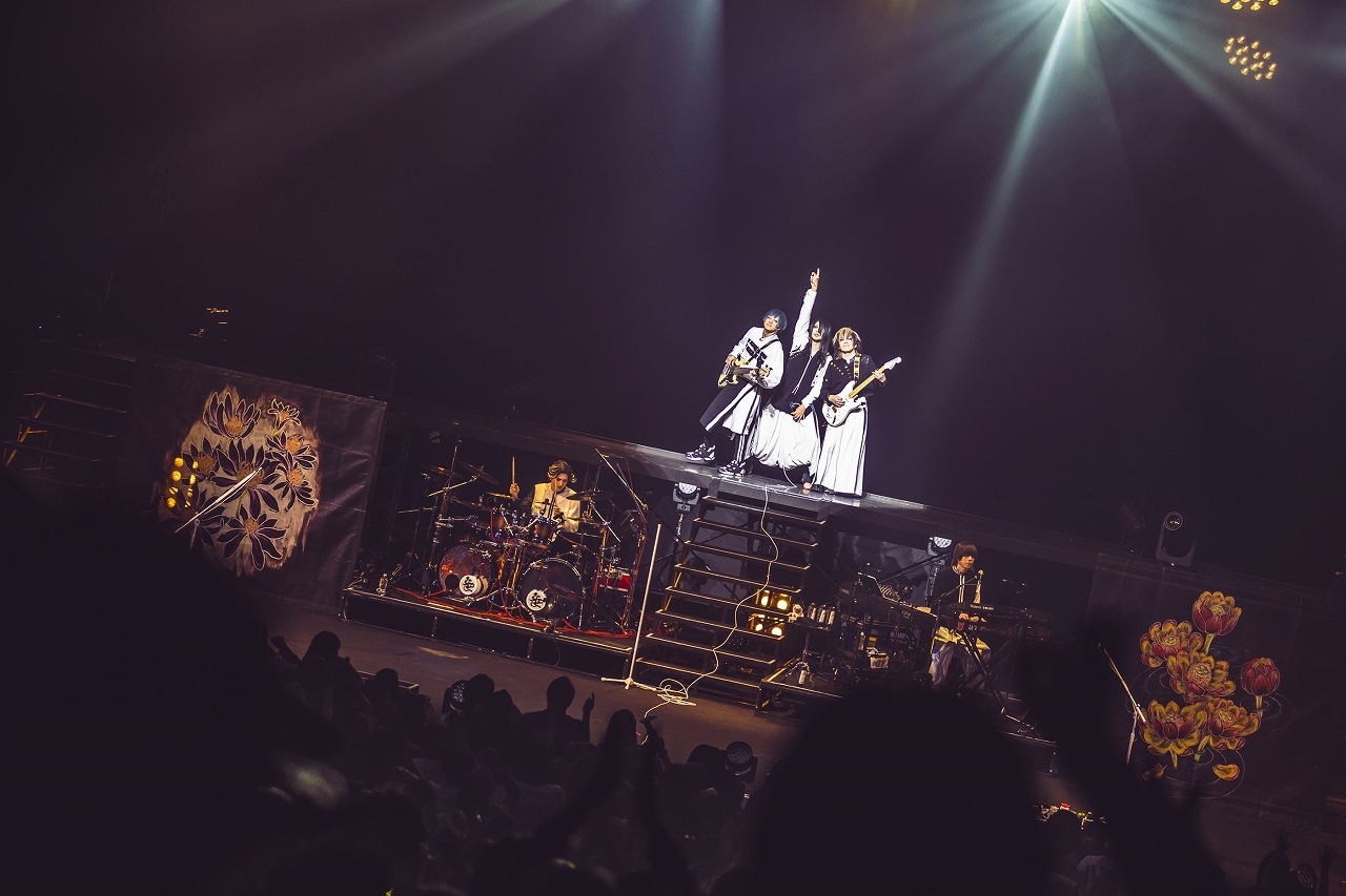 夢烏たちを歓迎する言葉もはさみながらライブはエンディングに向かって突き進む。小気味いい「空と糸」に続いて、「やるか! 騒ぐか!!」と「塗り潰すなら臙脂」もたたみ掛けた。スモークも吹き上がるステージで、勢いよく走り周りながら抜群のフォーメーションでも視線を奪うミヤとYUKKE。ステージ・センターでシャウトやグロウル、メロディなど唱法を瞬間ごとに切り替えながら、シンガーとして存在感を放ち続ける逹瑯。曲が次々に続く中、逹瑯とミヤとYUKKEはステージセットの上段で3人で並んでライブパフォームしながら笑顔も。会場を埋め尽くす夢烏たちも、もちろん最高の笑顔を輝かせた。そしてライブ本編のラストを締めくくったのは「リブラ」。強い生命力も宿らせた逹瑯の歌声に、ストリングスもフィーチャーした美しいバンド・アンサンブルが絡み、夢烏たちを感動で包み込んでいった。