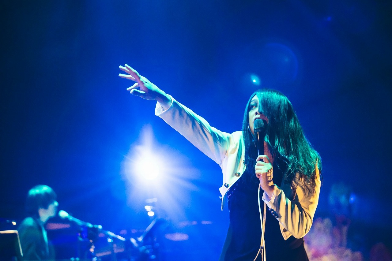 YUKKEの弾くアップライトベースに逹瑯がハープフレーズを絡ませる「ファズ」、夢烏たちの手にするLEDの光るMUCCの扇子が舞い踊る中でダンサブルに決める「アンジャベル」、50’sロカビリーとブルース・テイストが同居する「カナリア」など、『志恩』と『球体』の時期ならではのヴァリエーションで、まさに逹瑯のMCどおり思いっきり楽しませるMUCC。どの瞬間もクライマックスだが、一人ひとりを曲の世界に思いっきり引き込んだのは、ライブ中盤過ぎ。今ツアーでは披露されていなかった『志恩』収録の「蝉時雨」から立て続けに組曲のように披露した「小さな窓」。切なさ、悲しみ、願いなど、曲に描いた情景と感情で夢烏たちを溺れさせていく。逹瑯の歌は、会場にいる全員の心をつかみ、そして優しく抱きしめてもくれた。「讃美歌」を歌い終えたとき、夢烏たちからの感謝の拍手が逹瑯を包み込んだ。