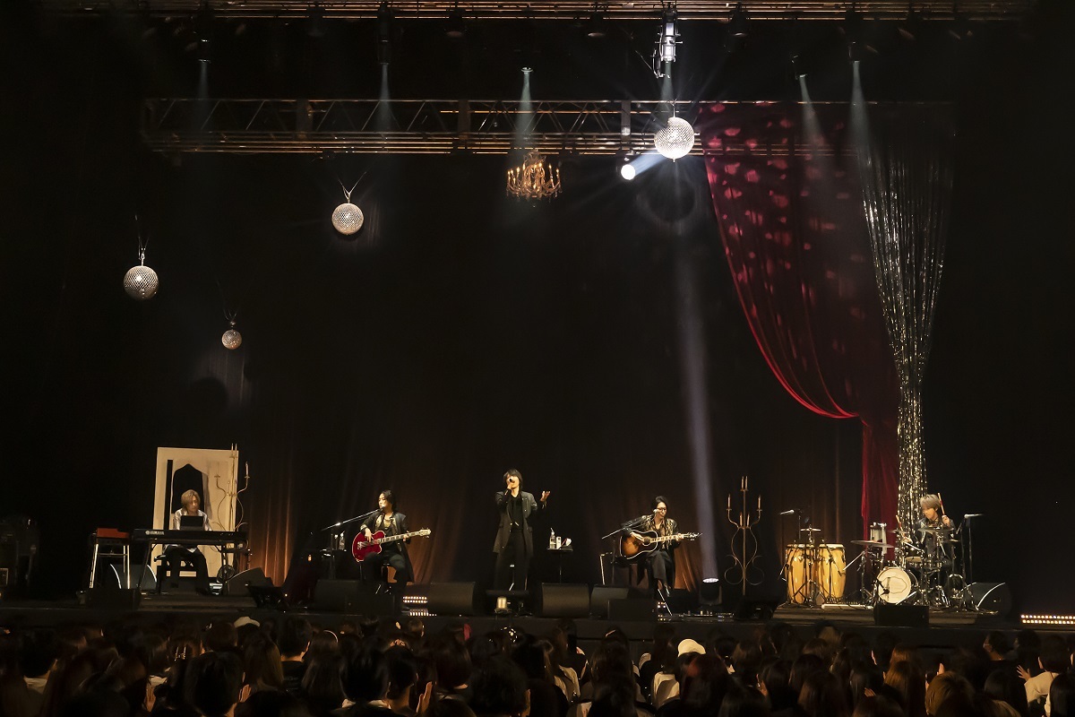 定時、舞台にラグジュアリーな衣装に身を包んだ4人が静かに登場。フロントに上手からゆうや(Dr)、Shinji(Gt)、マオ(Vo)、明希(Ba)が並ぶというイレギュラーな立ち位置で、ライブは「live」で幕開け。ゆうやは小ぶりなドラムセットの横にあるコンガを叩き、Shinjiがアコースティックギターを奏でると、マオが柔らかなタッチの歌声をのせ、明希のベースフレーズまで人肌の温もりを感じさせるような表現で「live」をアクト。今回、アコースティックアレンジを担当した葉山拓亮(Key)は、サポートメンバーとしてツアーにも帯同し、明希の横で、シドサウンドにエレガントな彩りを加えていく。20年目にして、編成もサウンドも真新しい扉を開けたシド。4人は椅子に座り、これまでライブで聴き慣れた曲を大人びたムードで次々と演奏。集まったオーディエンスは、メンバーそれぞれのテクニカルで艶っぽい音像に集中して没入しながら、楽曲の新たな魅力、新しいシドの表現を発見してはうっとりとした表情を浮かべる。本公演で5本目となったバンド初のアコースティックライブについて「毎回違うよね。みんな、アレンジを変えてくるから」とマオが感想を述べると「だから、一瞬一瞬にドラマがある。まさにプレミアムライブ。楽しく演らせてもらってます」と明希が付け加えた。そして、後半はシドのライブならではの客席のシンガロングを即すようにマオが椅子から離れ、観客にマイクを預けると、アコースティックライブとは思えない様相で、どんどん盛り上がりを作っていく。ミラーボールが燦然と輝く空間に、シドのアニバーサリーのアンセム「ANNIVERSARY」が放たれると、この日最大の合唱が客席から響き渡り、場内にひたすら歓喜が広がっていくなかで1部は終了した。