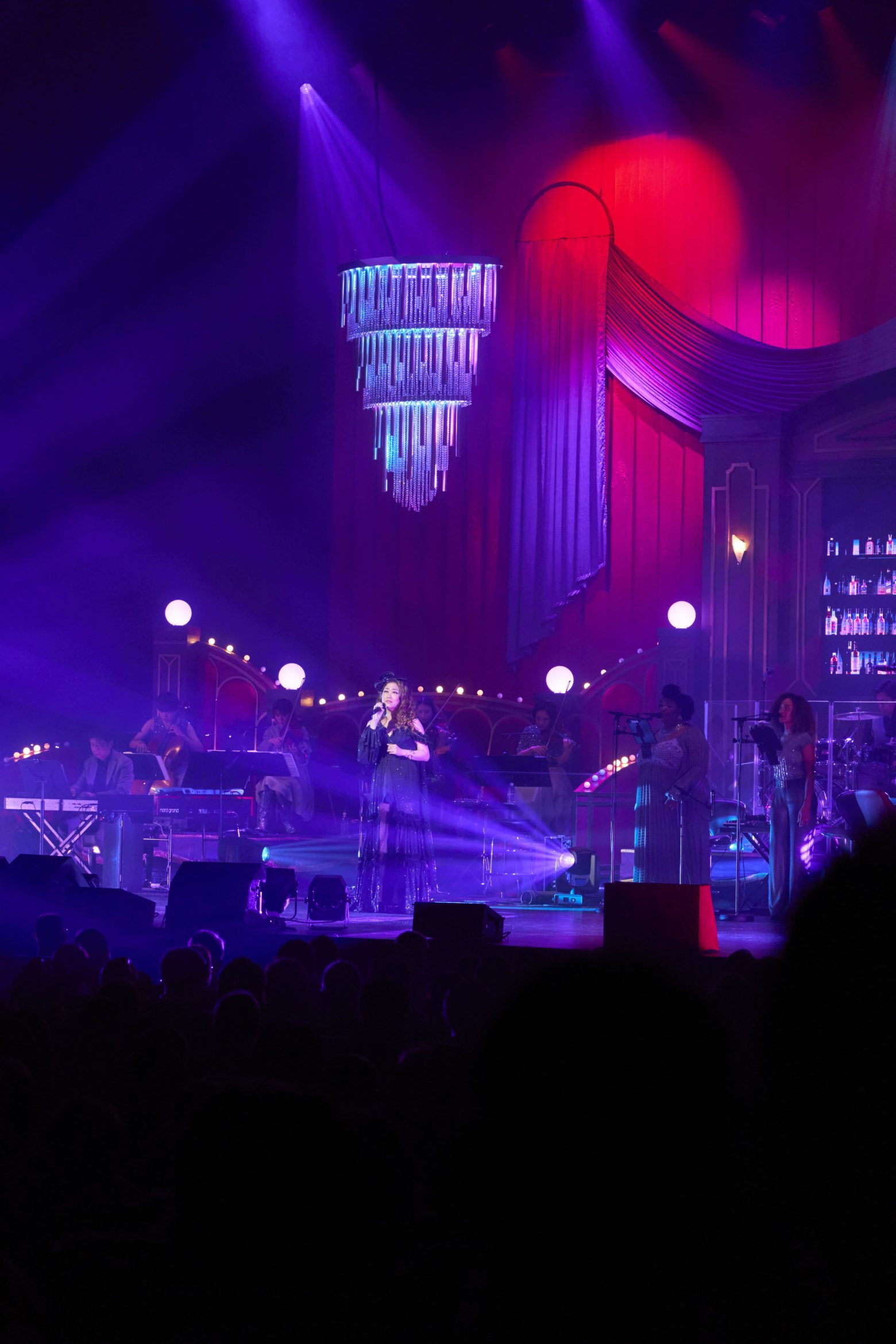 お馴染みの看板・カウンター・椅子が配置されているステージに、まるで本当のスナックに入り込んだような感覚をおぼえていると、“流しのミュージシャン達”の演奏にあわせて、ママがステージに登場。スリリングな弦が印象的な名曲「魅せられて」で、“スナックJUJU有楽町店”は堂々と開店した。
