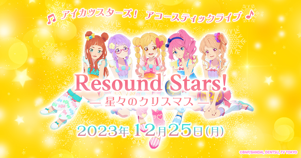 2023年12月24日(日)にアニメ『アイカツフレンズ!』5周年記念イベント「アイカツフレンズ! 一緒に来たね5周年!! Fan meeting」、2023年12月25日(月)に『アイカツスターズ!』アコースティックライブ「Resound Stars! ―星々のクリスマス―」が日本橋三井ホールにて開催されることが発表された。