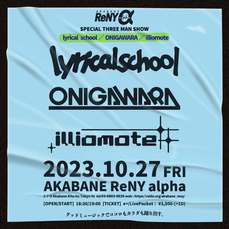 赤羽ReNY alphaが主催する同ライブには、「グッドミュージックでココロもカラダも踊り出す。」をテーマに3組が出演。lyrical school、ONIGAWARA、illiomoteが共演を果たす。