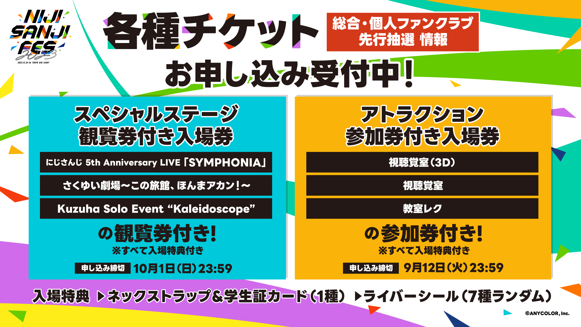 そして、本イベントのチケットである、アトラクション参加券付き入場券、スペシャルステージ観覧券付き入場券の「にじさんじ総合・個人ファンクラブ先行抽選」が本日2023年9月1日(金)12:00よりスタートしている。