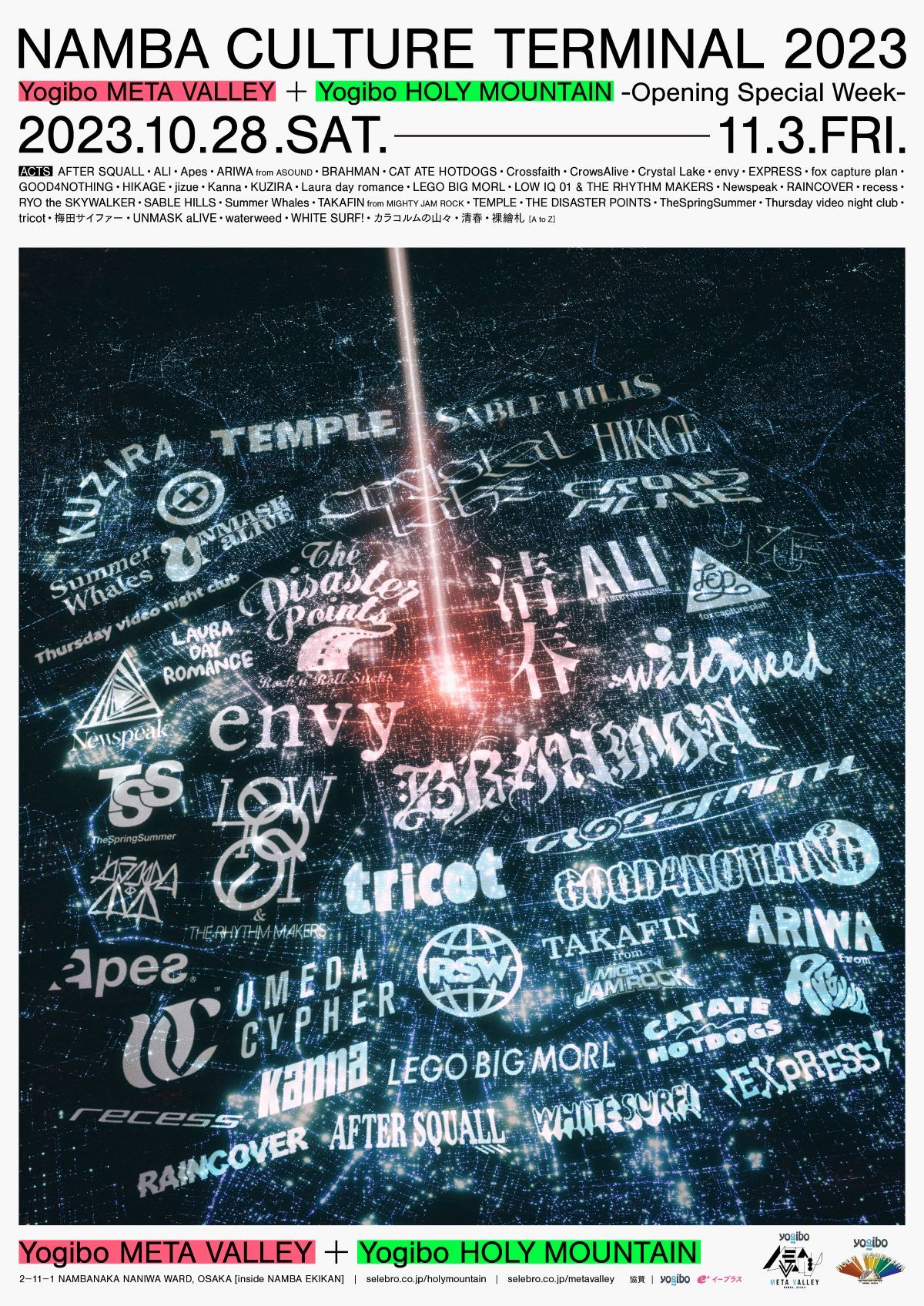 10月28日(土)~11月3日(金)にわたり、大阪なんばにオープンするライブハウスYogibo META VALLEYとYogibo HOLY MOUNTAINにて開催されるこけら落とし公演『Namba Culture Terminal 2023 -Opening Special Week-』の最終出演アーティストが発表された。fox capture planやLaura day romanceら8組が追加され、BRAHMANほか39組が出揃った。