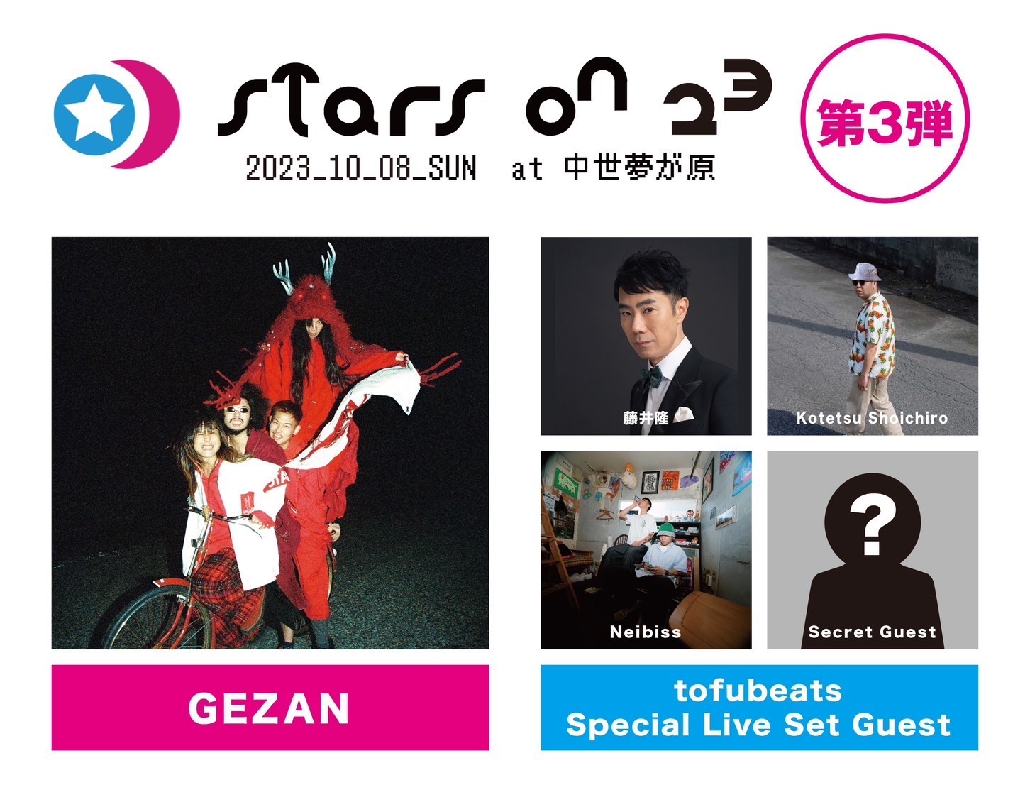 『STARS ON』は、美しい星空で知られる岡山県美星町で開催される秋の音楽フェス。第三弾出演アーティストとして発表されたのは、『STARS ON』初参加となるGEZAN。また、tofubeatsが“Special Live Set”として藤井隆、Kotetsu Shoichiro、Neibiss、シークレットゲストを招いたショーを披露することも決定した。