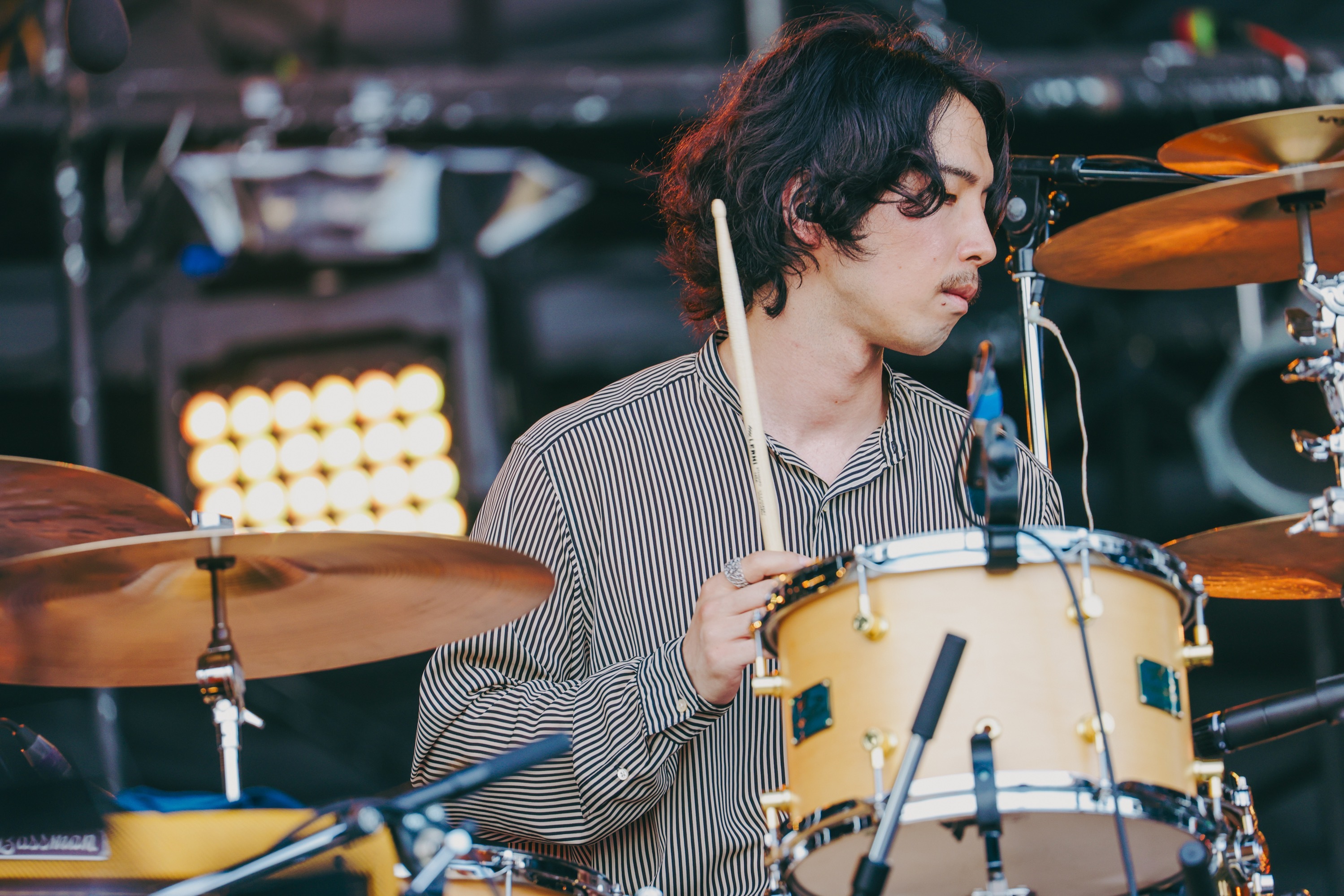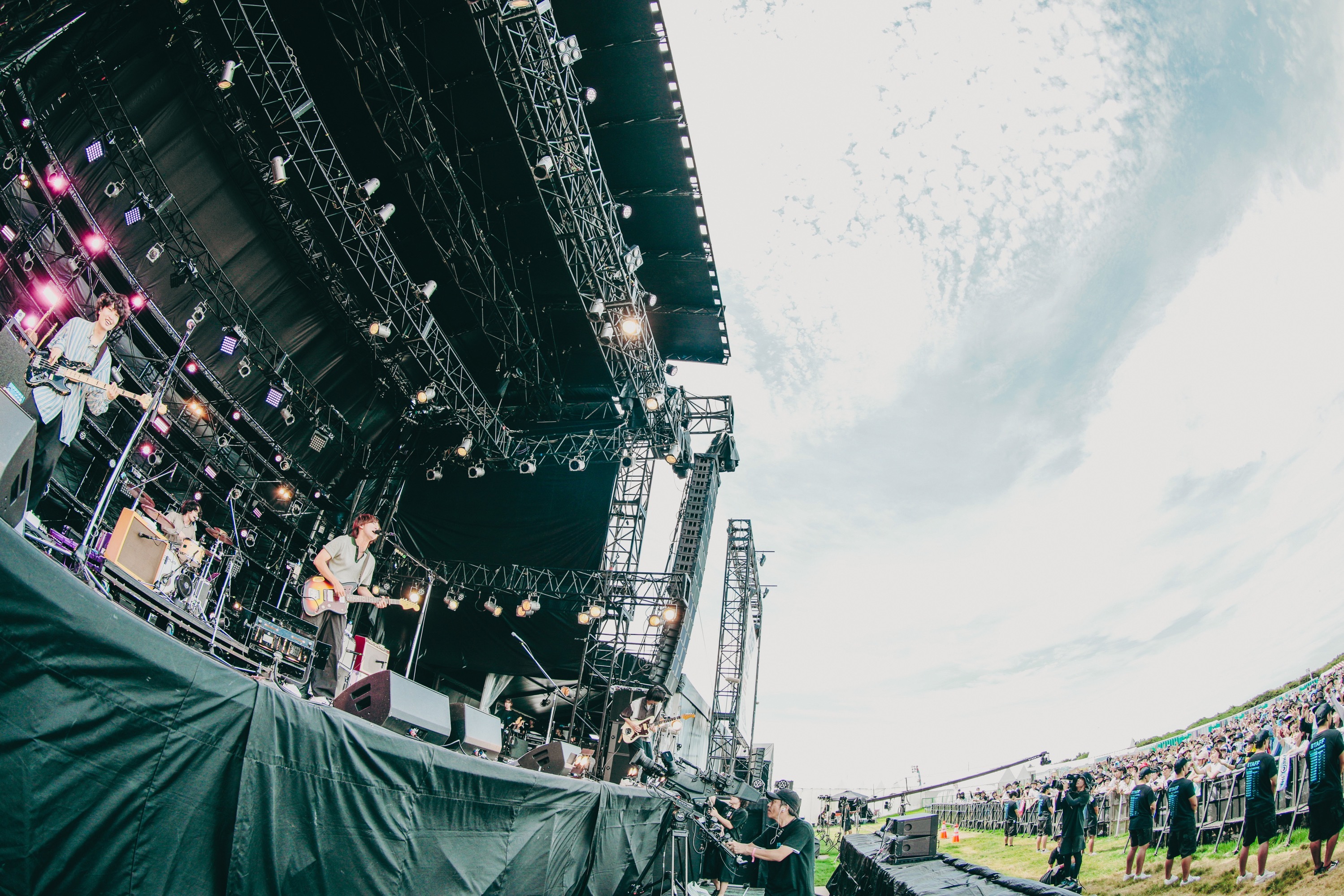 the shes goneにとって2度目の『RUSH BALL』は、サポートに松田ナオト(Ba)を迎えての編成。兼丸(Vo.Gt)が「最低だなんて」をゆったりと歌い始め、「さあ、『RUSH BALL』最終日ですよ! 皆さんいけますか! いくぞ!」と叫んで勢いを加速。疾走感たっぷりに熊谷亮也(Dr)が繰り出すビートに牽引されて、オーディエンスの手も挙がる。