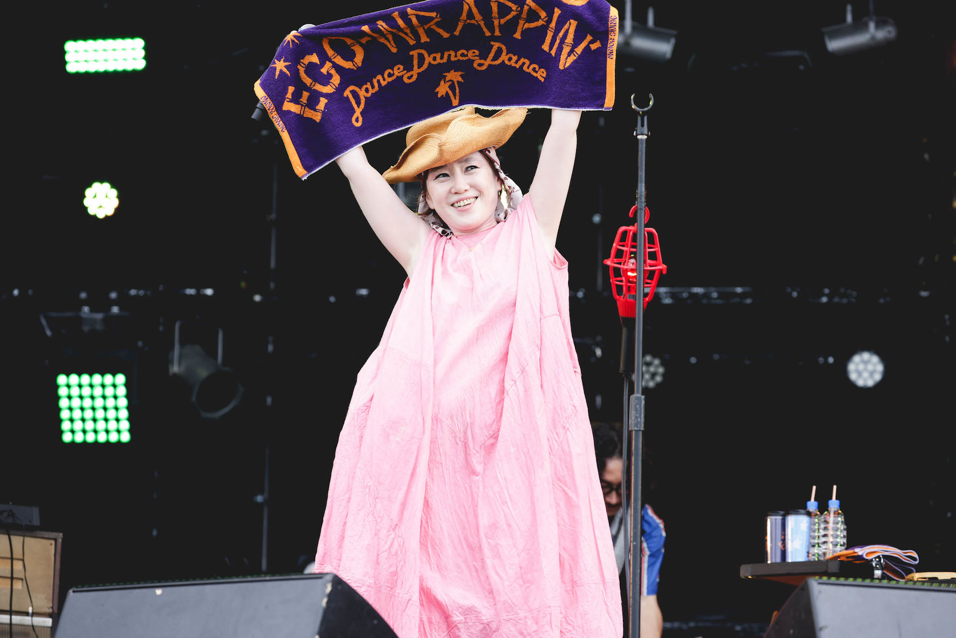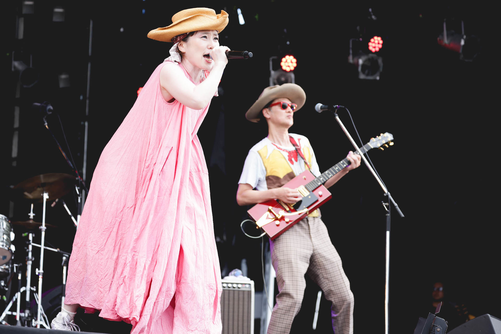 圧倒的な存在感と歌唱力で泉大津の空気を揺るがし、さすがの貫禄を見せたのはEGO-WRAPPIN’。2018年以来5年ぶりの登場となる。サポートにサックス、トランペット、ドラム、ウッドベース、ピアノを迎えた7人編成でステージにスタンバイすると、中納良恵(Vo)は「おっす。始まります、EGO-WRAPPIN’。35分一本勝負、『RUSH BALL』25周年、おめでとー!」と力強く叫ぶ。それを合図にホーン隊が勢いよくサウンドを放ち、「Paranoia」からライブスタート!