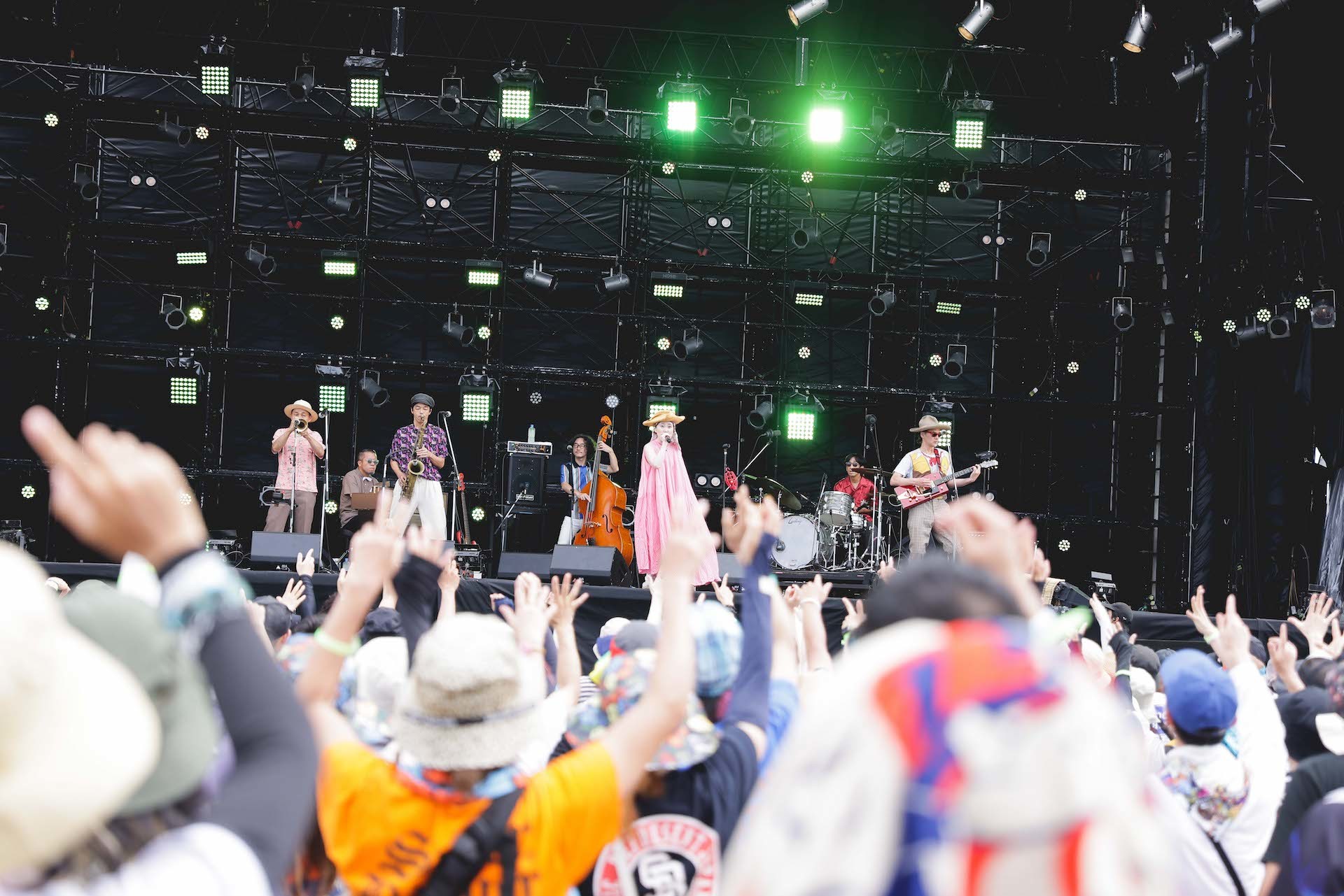 そして「まだいくよ!」と中納が叫び、投下された「くちばしにチェリー」。イントロが聞こえると沸き立つオーディエンス。「もっとこんかい!」と関西弁で煽る中納が堪らなくカッコ良い。ステージに充満した熱気とグルーヴはまだまだ止まることがない。<さえずったらまっさかさま>で溜め、「いくぞ『RUSH BALL』最終日ー!」と爆発させてからの、ラストチューンは「GO ACTION」。もう猫も杓子も踊るしかない! ステージ上ではメンバーもジャンプし、最高にハッピーでグルーヴィ。さらに最後のもうひと押しで盛り上げて、熱狂のステージを終えたEGO-WRAPPIN’だった。