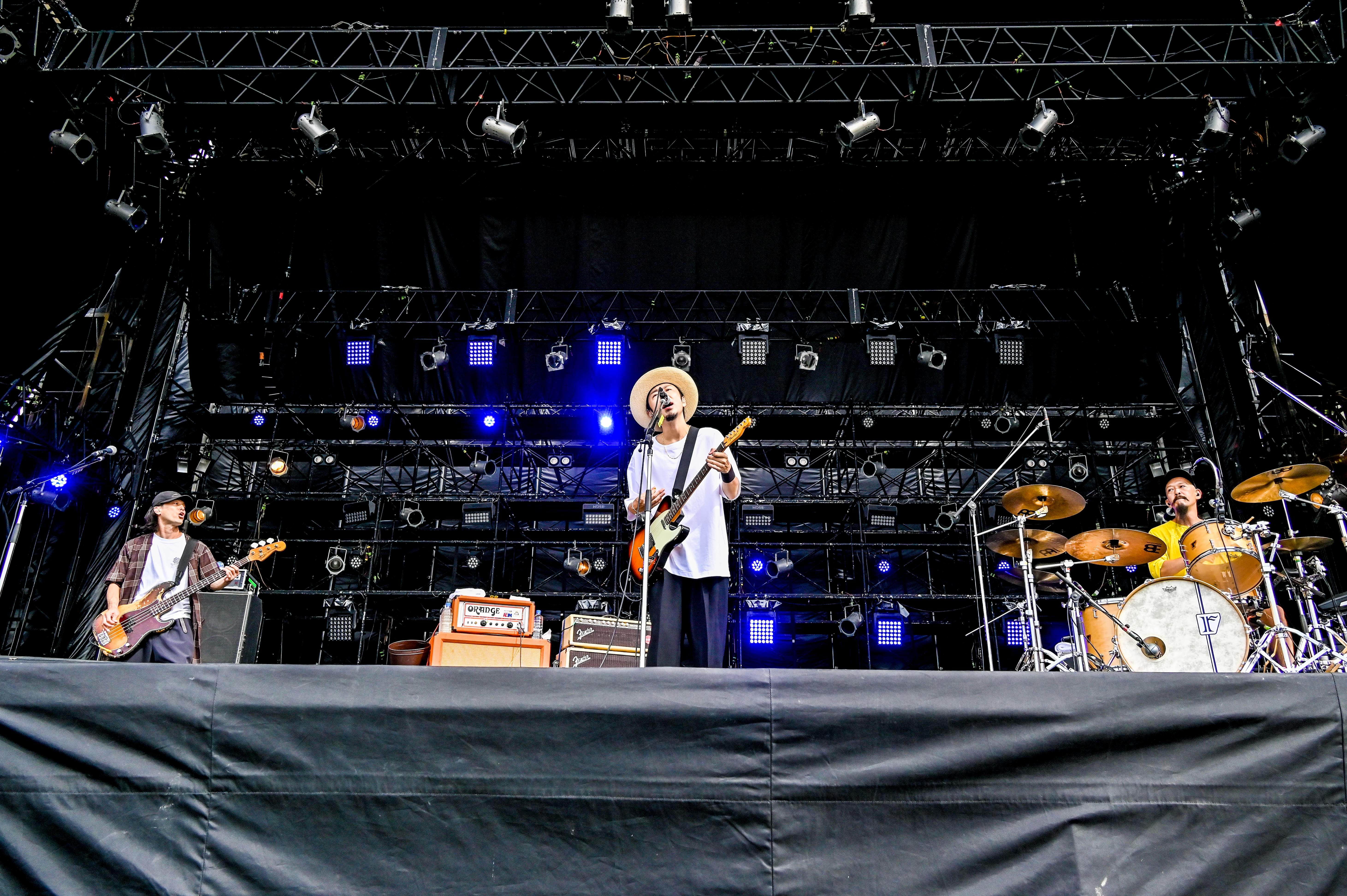 「盛り上がっていくぞ!」、大木の叫びで「アイソトープ」へ。ギターのカッティング、佐藤がアジテートしていくリズム。オーディエンスの感情を高みへ連れていくというより、3人の音で広い宇宙の中に一本の道を開き、そこに導くような……。何ともいえない高揚感と安心感で心が満ちていく。次曲「夜のために」も、じわじわと熱を孕んでいく感覚が心地よくてたまらない。ロックバンドのライブで「爆ぜる」ものはサウンドや感情、色々な形があるけれど、彼らの音は星の瞬きに似た爆ぜ方をしている。心情をしっかりとつかむと、3ピースバンドのシンプルで美しいロックサウンドが日が沈みだした高い空の下を翔けていく。