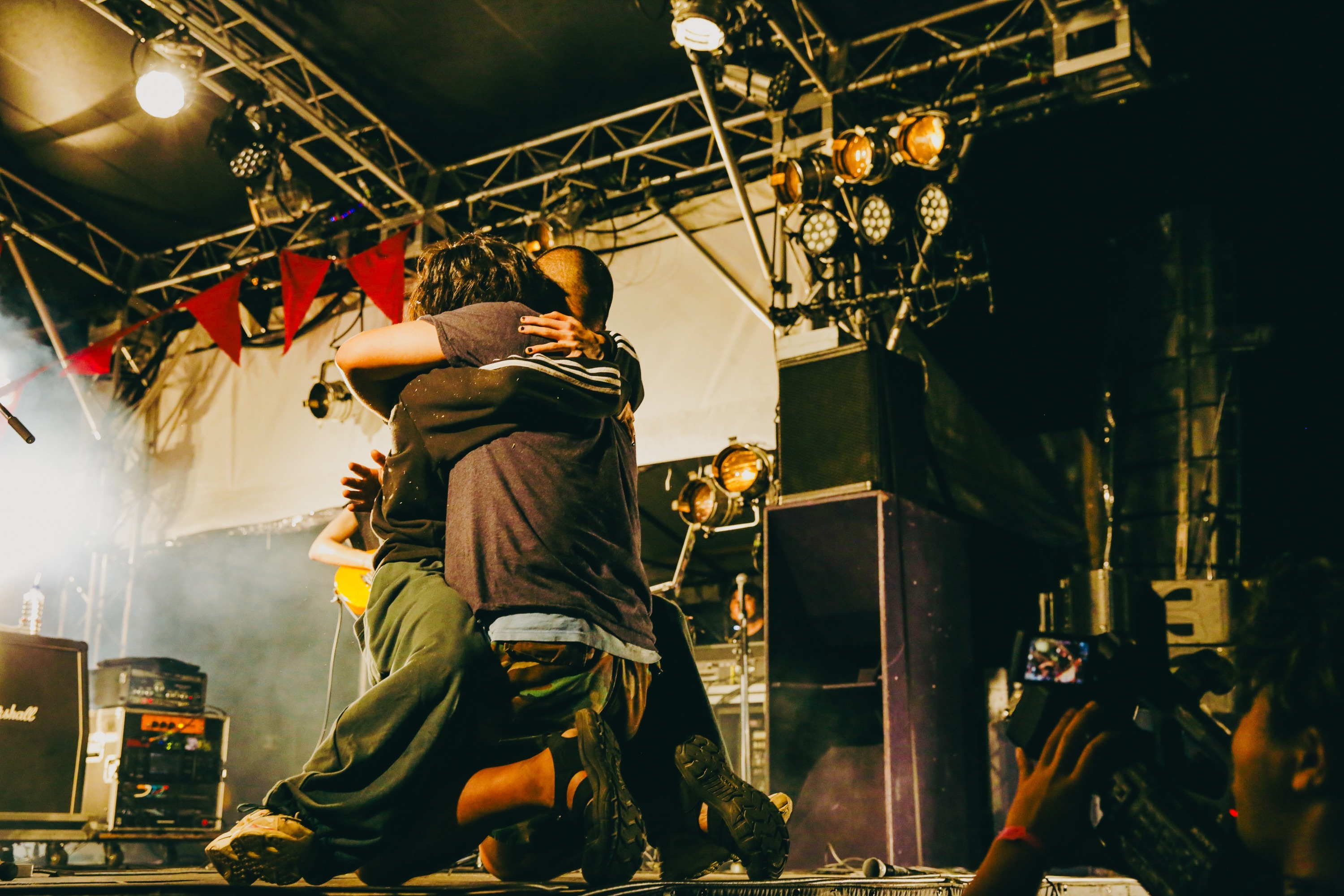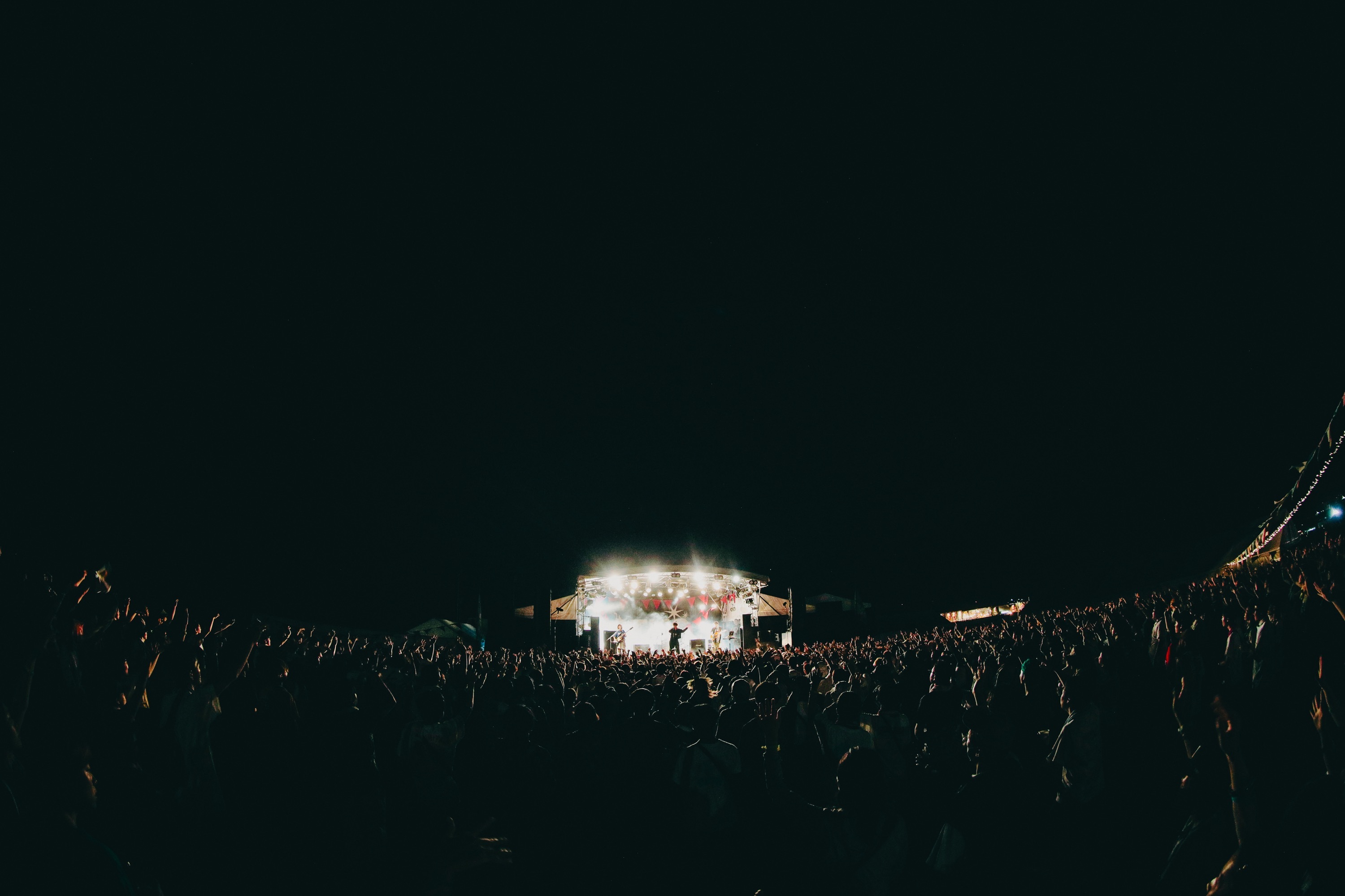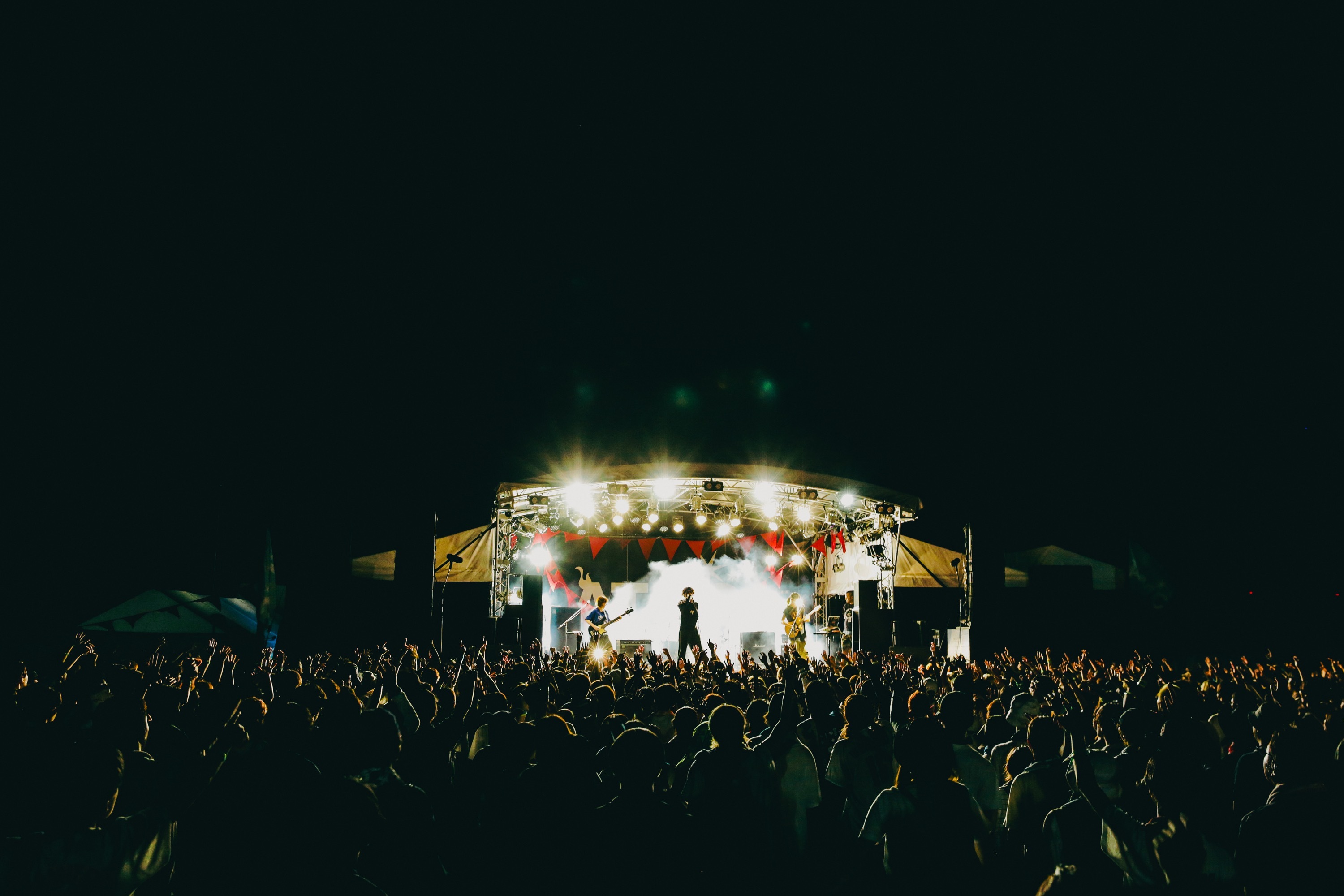 会場の盛り上がりは、舞い上がる砂ぼこりがライトに照らされて見えるほど。そしてゲート付近でも多くの人が弾む、まさにクライマックスの雰囲気で切るカードは「月曜日の歌」だ。ファンの歌う声もジャンプも一層大きくなり、くぅが絞り出すボーカルは叫びに変化。夕日(Gt)も客降りして全員がフルスロットルになると、オーラスはたっぷりのアウトロで余韻を広げ、「僕らの今年はここに置いていきます!」という宣言で、ついに『RUSH BALL 2023』の幕は下ろされた。