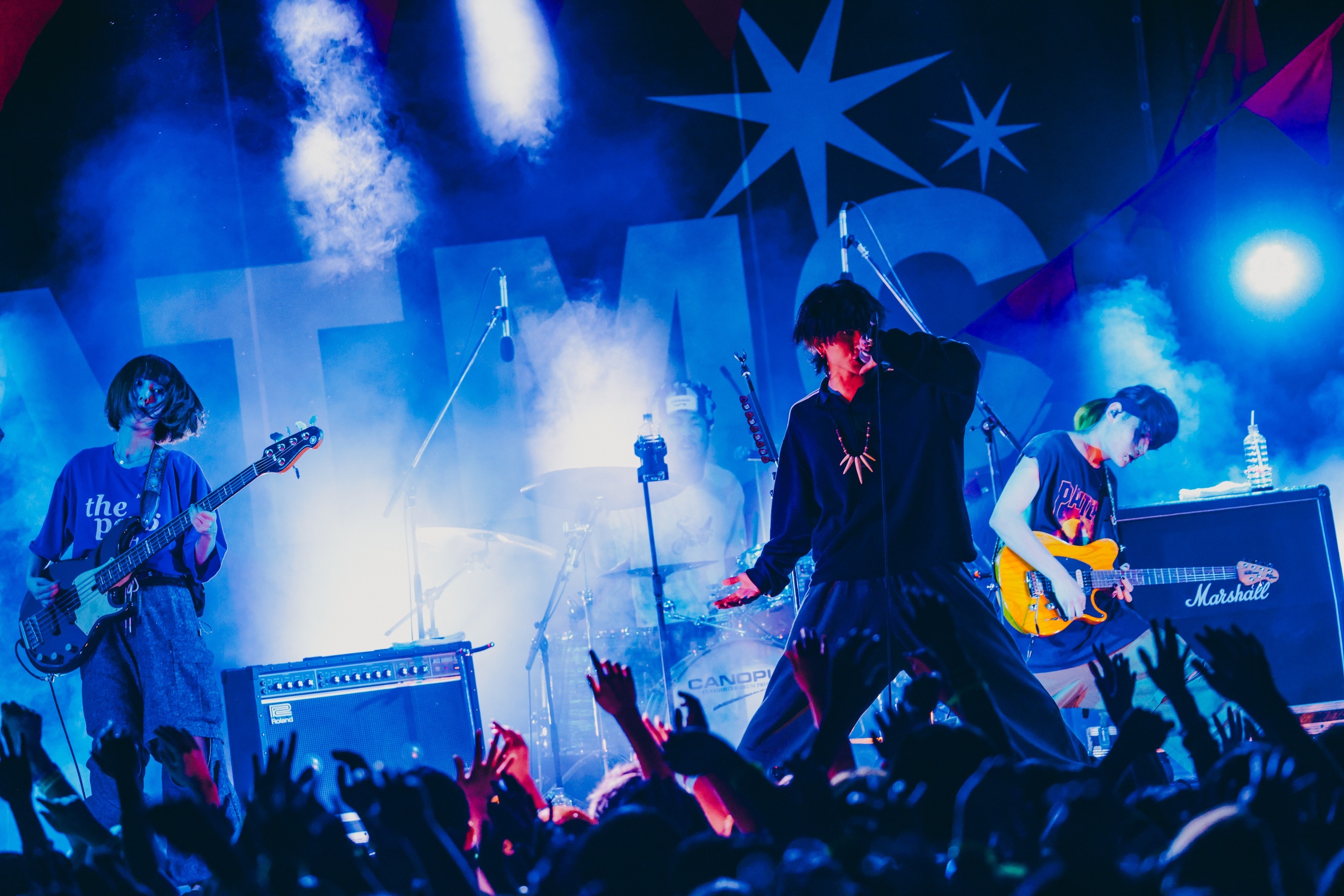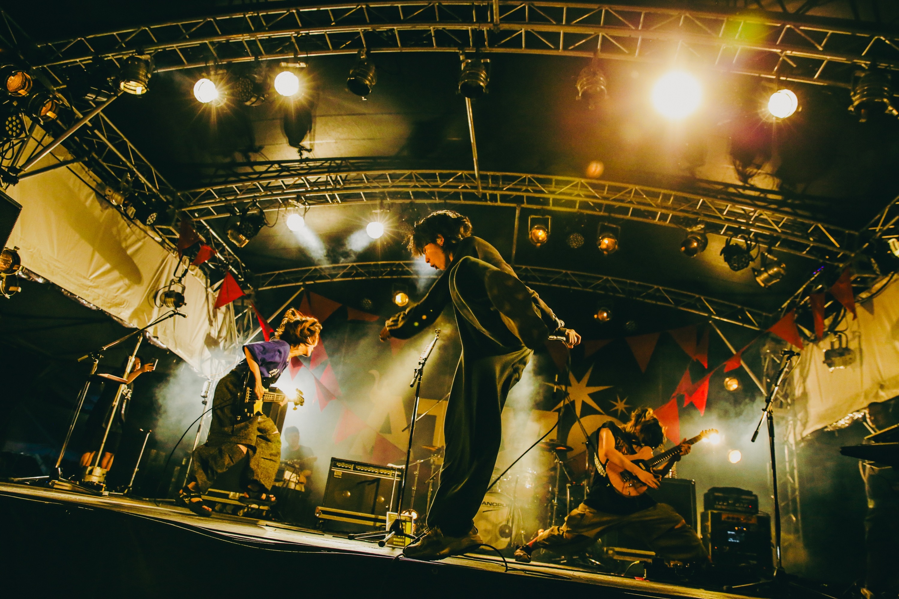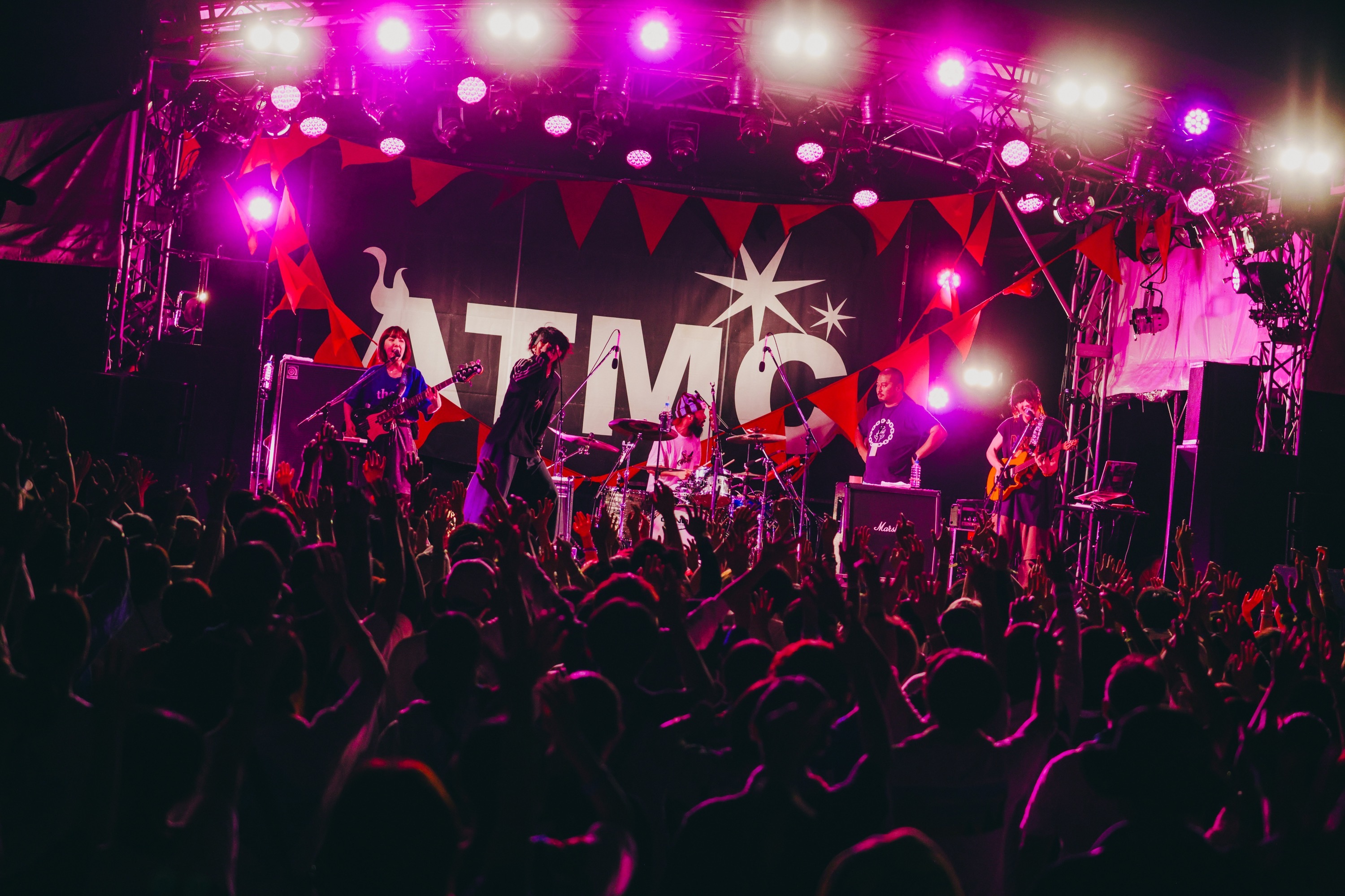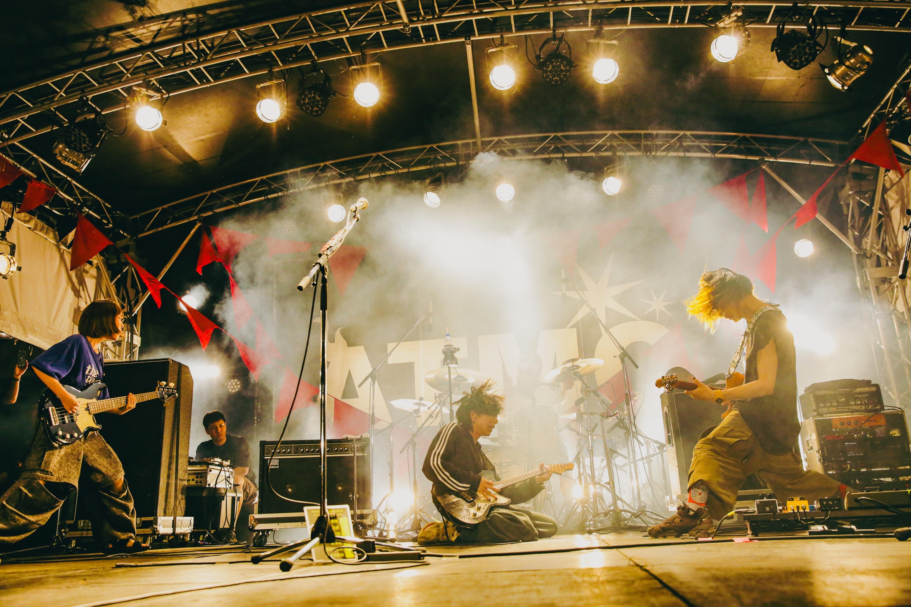 雲間に月が顔を出す20:30過ぎ、ATMCの最終ステージに上がった4人は、リハーサルから本番さながらの「アウトバーン」と「DINDON」で大サービス。盛大な花火も一緒に見上げて期待が高まるなか、くぅ(Gt.Vo)が「歓迎の花火ですね!」と口にし、まずはアグレッシブな「ボキは最強」を投下する。ハンドマイクを手に動き回るくぅのボーカルが畳みかけ、ギターも歪み、さらに「九鬼」へ。ハイカロリーかつトリッキーな曲はもちろん、全力で暴れ回る4人の様子は観客のテンションを爆上げするが、次は「さあ、歌いましょうかね」(くぅ、以下同)と「おもちゃ帝国」でグルーヴィー&ダンサブルに。
