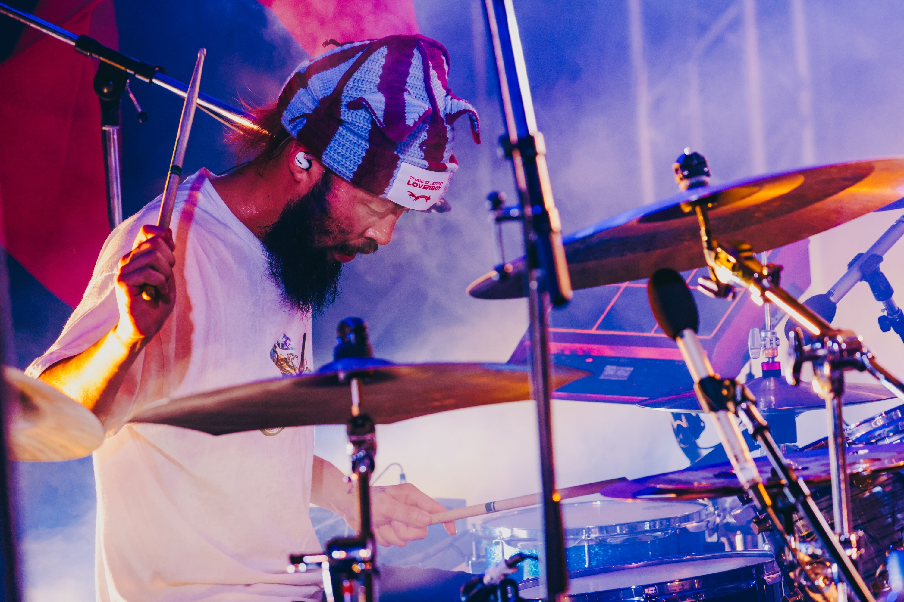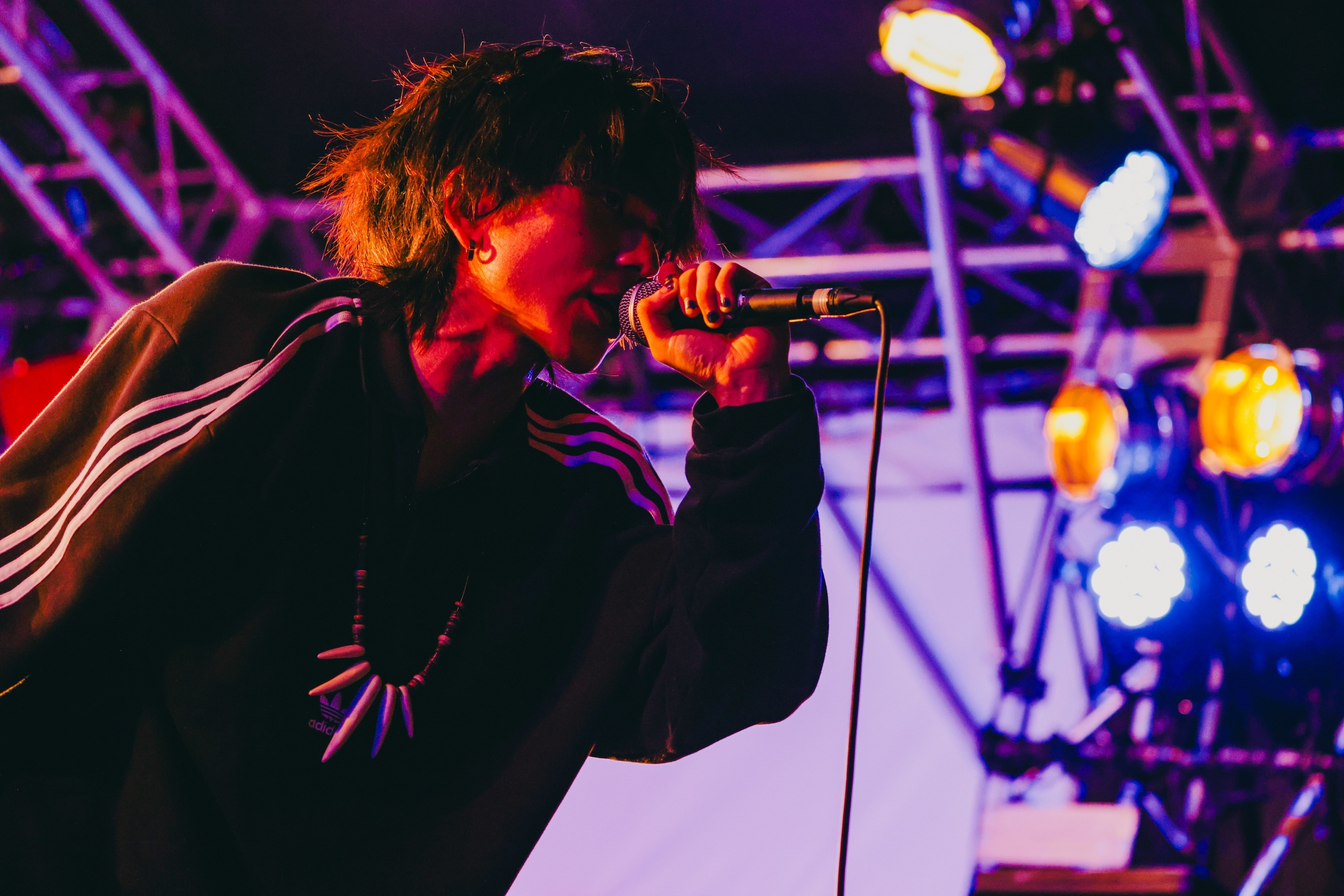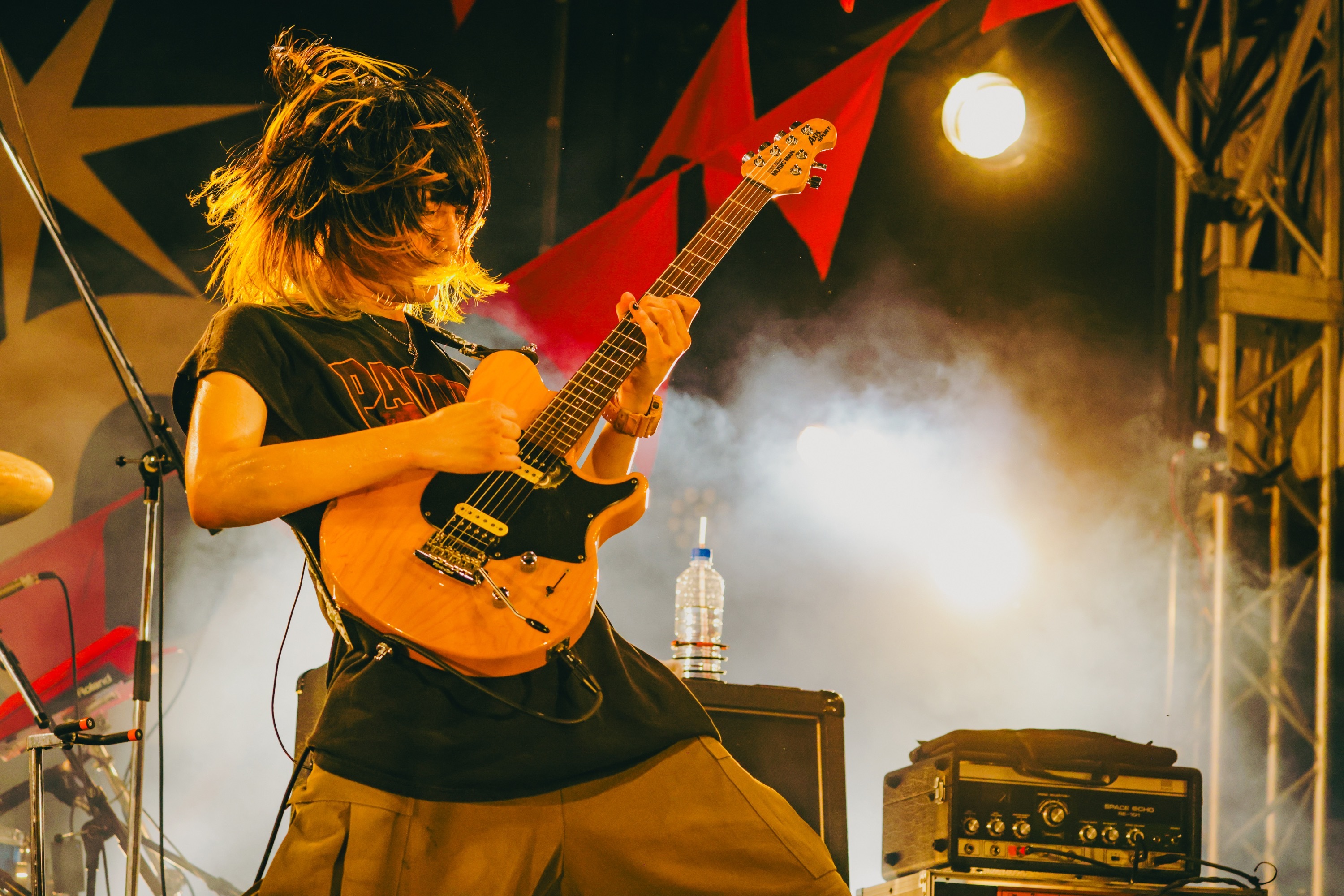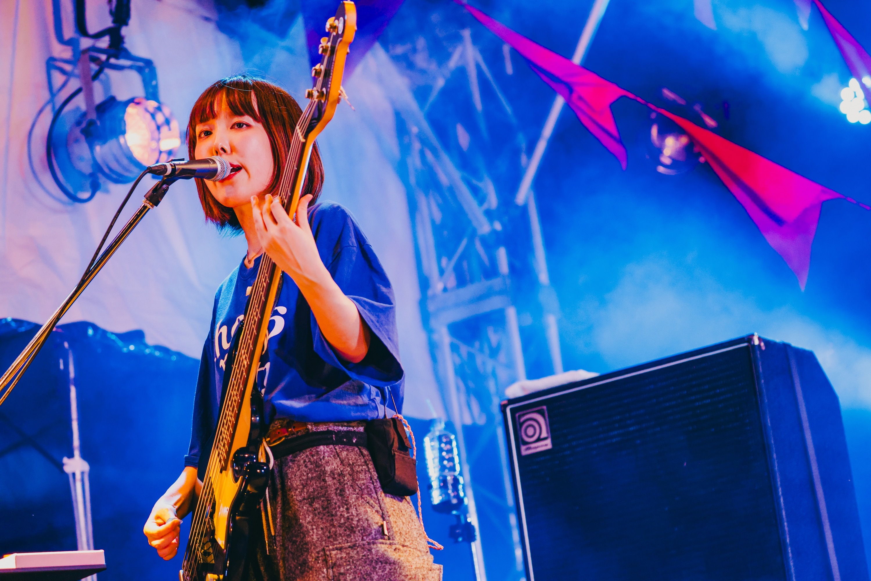 遠くのゲート近くにいる人たちも頭上で手を揺らし、くぅも気分よく舞台上をゴロゴロしてなぜかそのまま下へゴロリ。「死ぬところだったね(笑)」と無傷で見事救出されるひと幕でも釘づけにしたあとは、一旦クールダウンして前日がメジャーデビュー2周年記念日だったことを明かし、「みんなのおかげでやってこられたと思ってます」、「この夏を締めさせてください!」と、「歩く花」と「不革命前夜」で再び前傾姿勢に。エモーショナルな言葉と旋律を潜ませて刻むビートと複雑な展開は、涼しい夜風にも熱を持たせ、サイレンの音、切り裂く歌声、エッジーなサウンドで煽る。