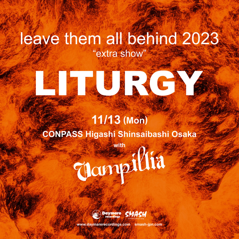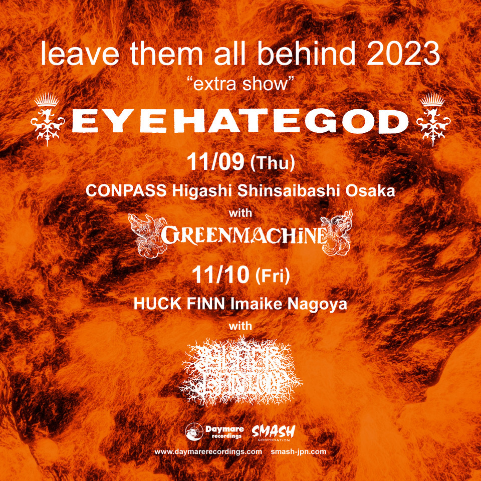 11月9日(木)、13日(月)大阪 東心斎橋Conpass、10日(金)に名古屋 今池HUCK FINNにて轟美重音シリーズ・ライヴ『leave them all behind』のスペシャル・エクストラ・ショウが開催される。11月9日(木)公演にはEYEHATEGOD、GREENMACHiNE。11月10日(金)公演にはEYEHATEGOD、BLACK GANION、そして11月13日(月)公演にはLITURGY、vampilliaが出演する。