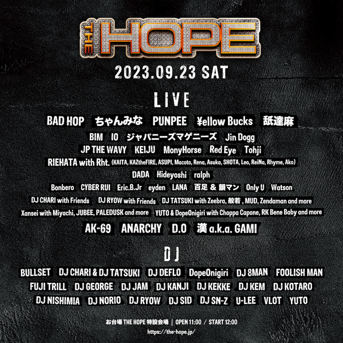 9月23日(土)にお台場THE HOPE特設会場にて開催されるHIP HOP FESTIVAL『THE HOPE』の出演アーティストのフルラインナップが解禁された。