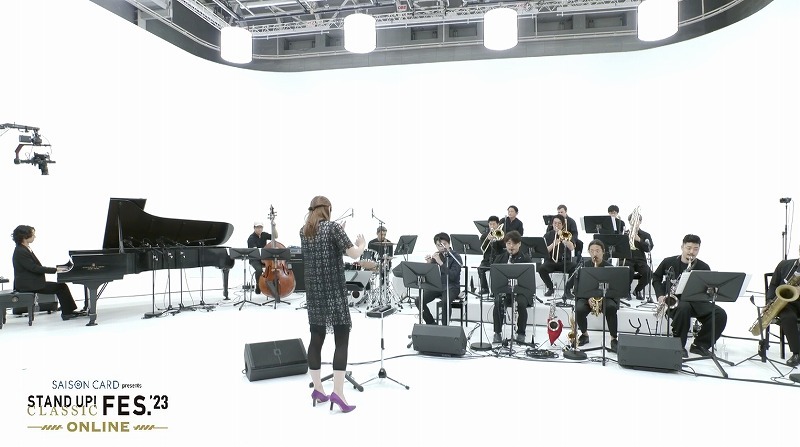挟間によるビッグバンドの楽曲に、ピアニストとして角野隼斗が加わる、ライブ感あふれるパフォーマンス。中でも注目は、ラヴェルのピアノ協奏曲をビッグバンドにアレンジした斬新なナンバーだ。ラヴェルの輝かしい色彩感はそのままに、リズムとハーモニーの遊びはオリジナル以上。原曲のミステリアスな美しさを尊重した2楽章、ジャズの疾走感とともにどこまでも旅に出て、最後にはしっかりとラヴェルの世界に帰着する3楽章。すばらしい才能が手を組んだからこそ成し得た新しい音楽、新しい波を感じる、最高のフィナーレとなった。