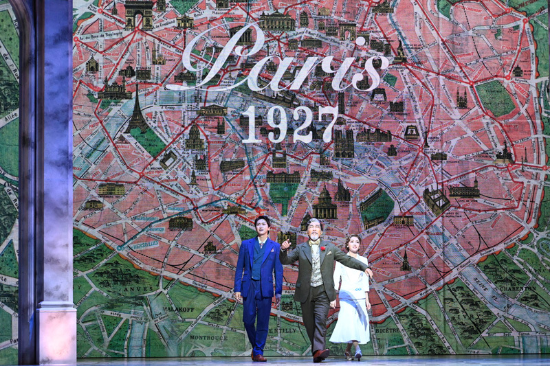 2幕は抑圧されたロシアから一転、華やかなパリへ。幕が上がると、パリの地図が描かれたスクリーンが目を引く。