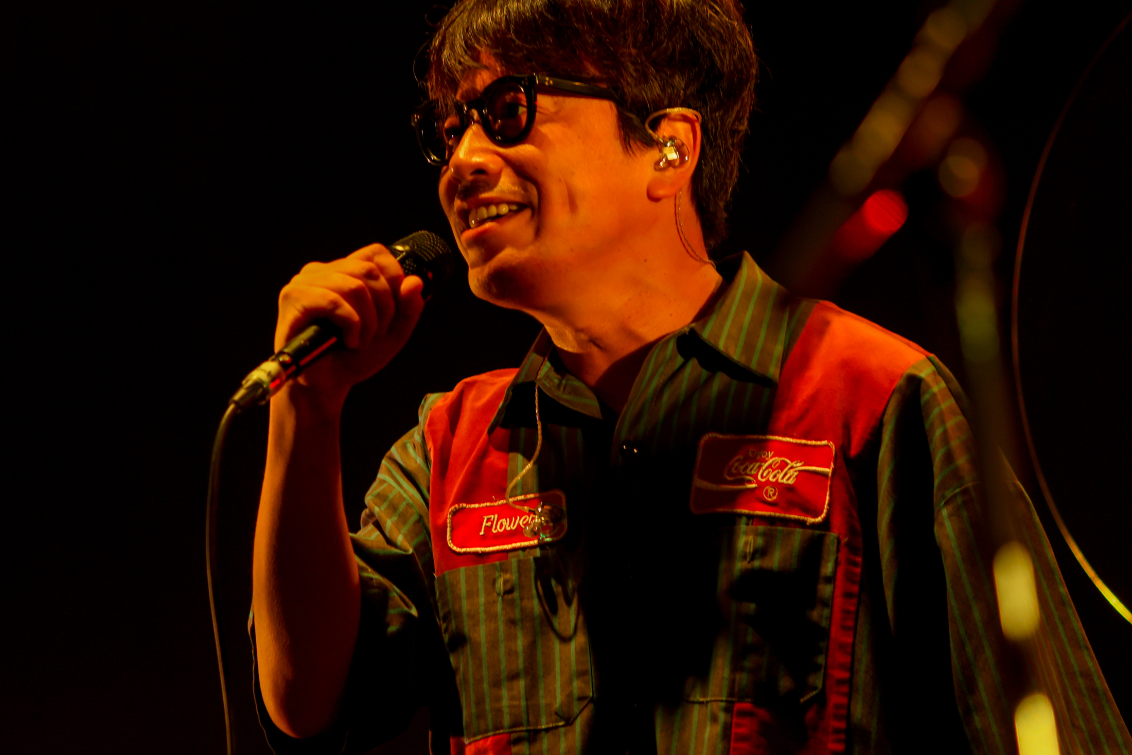 暖かい雰囲気でチョーキューメイの音楽を楽しんだあと、ここからが本番とばかりに観客がスタンディングでスタンバイ。Key、Gt、Drの3名のサポートメンバーと共に登場した岸田繁(Vo.G)、佐藤征史(Ba.Vo)によるロックバンド、くるりを大きな拍手で出迎える。ザ・クロマニヨンズとのツーマンイベントで先攻、さらに直近まで「愛の太陽EP」発売記念ツアーを行っていたこともあり、最初はどの曲で、そしてどんなセットリストで来るのかーーと胸躍るなか、「こんばんは、くるりです。よろしくお願いします」(岸田)と始まった注目の1曲目は「琥珀色の街、上海蟹の朝」、通称“上海蟹”。ギターを持たず、ハンドマイクで歌う岸田のラップ、おしゃれでメロウなシティポップサウンドで瞬く間に彼らならではの空気感に変えていく。