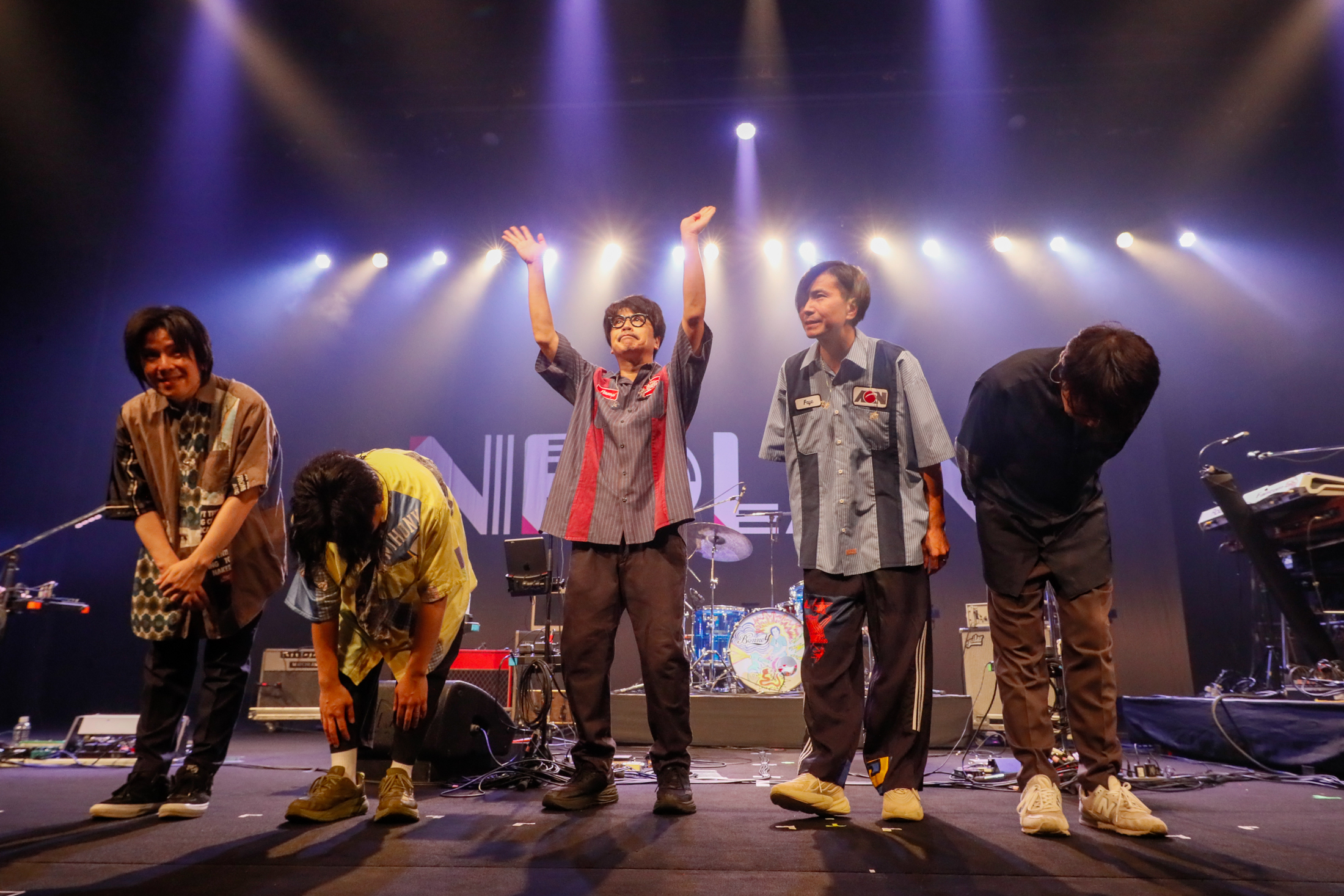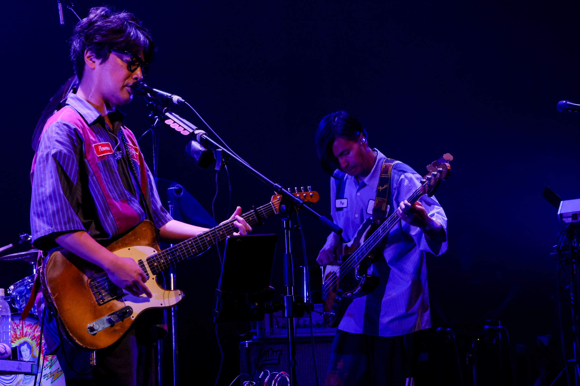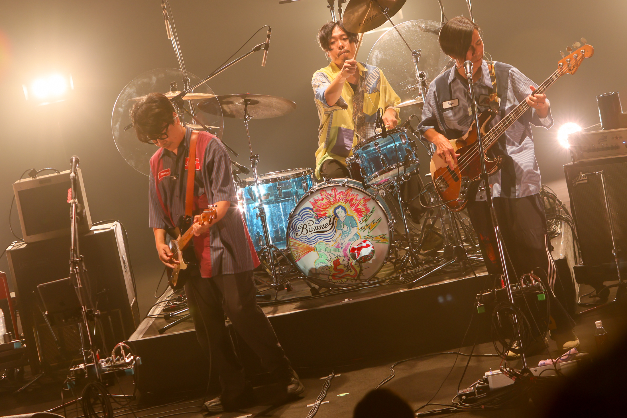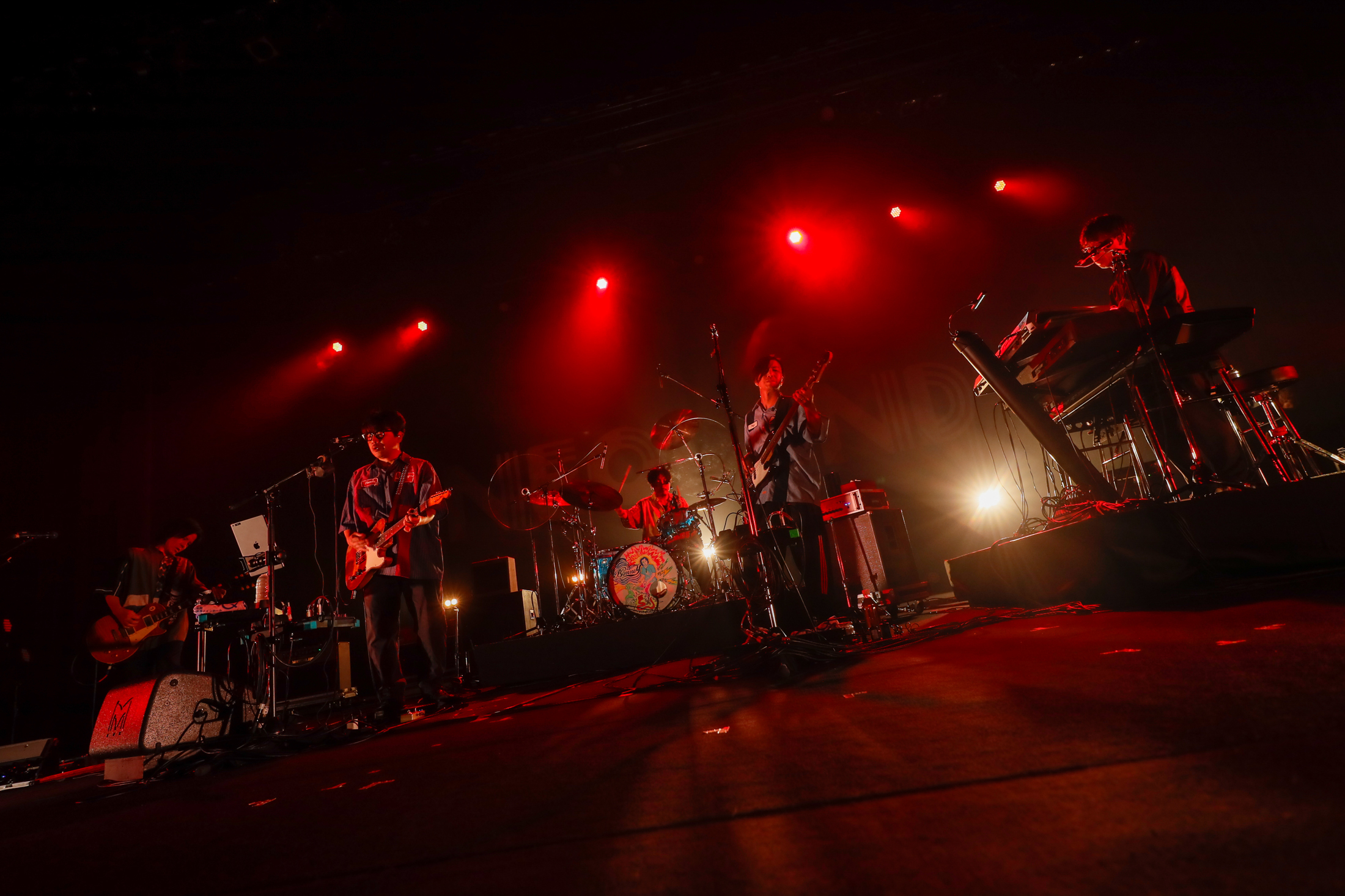 さらに、岸田がスキャットをしたり、ボソッと「ポカリ(ポカリスエット)うまい」と言ってみるなど遊び心も満載だった「Morning Paper」を間髪入れず演奏。骨太なロックンロールを見せつけ、熱気をグングン高めていった。メンバー紹介、「ポカリって昔、500ml入りの瓶のやつもありましたよね。あれを飲むのがすごい幸せやったんです」(佐藤)とポカリ話に花を咲かせたあとは、6月に先行配信された「In Your Life」、シンプルなバンドサウンドながらもどこか郷愁を誘う9分にも及ぶ壮大な「真夏日」、さらに8月に配信されたばかりの新曲「California coconuts」を披露し、最近の音楽性もきっちりと提示する。