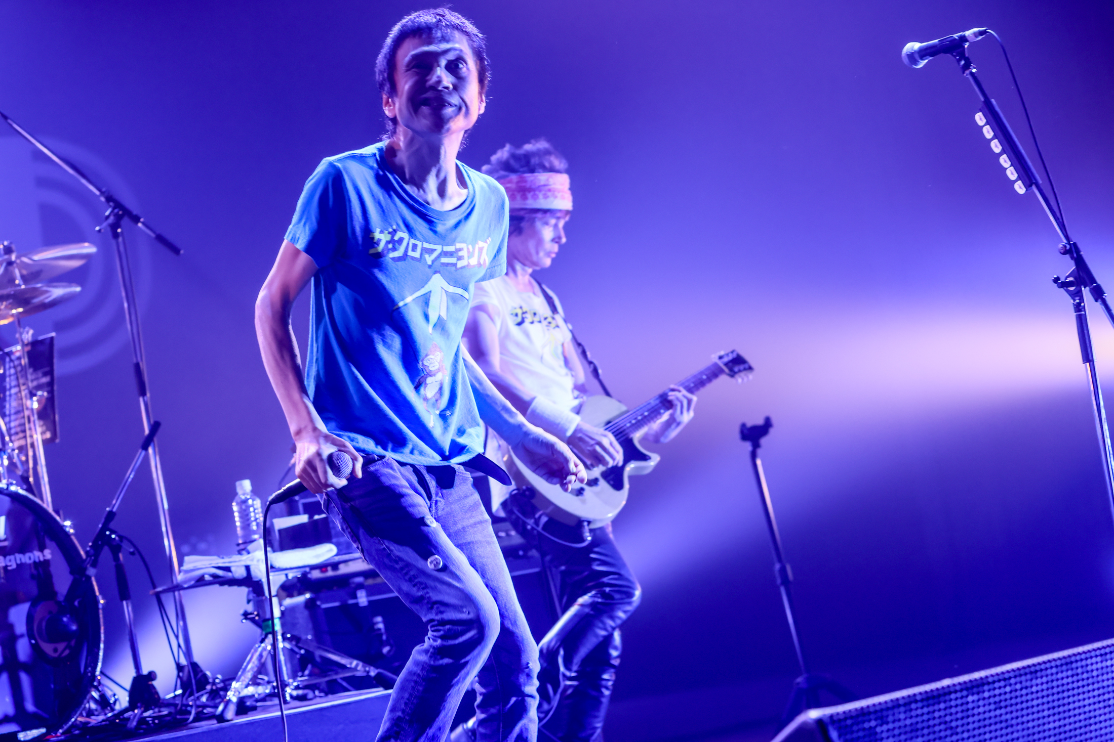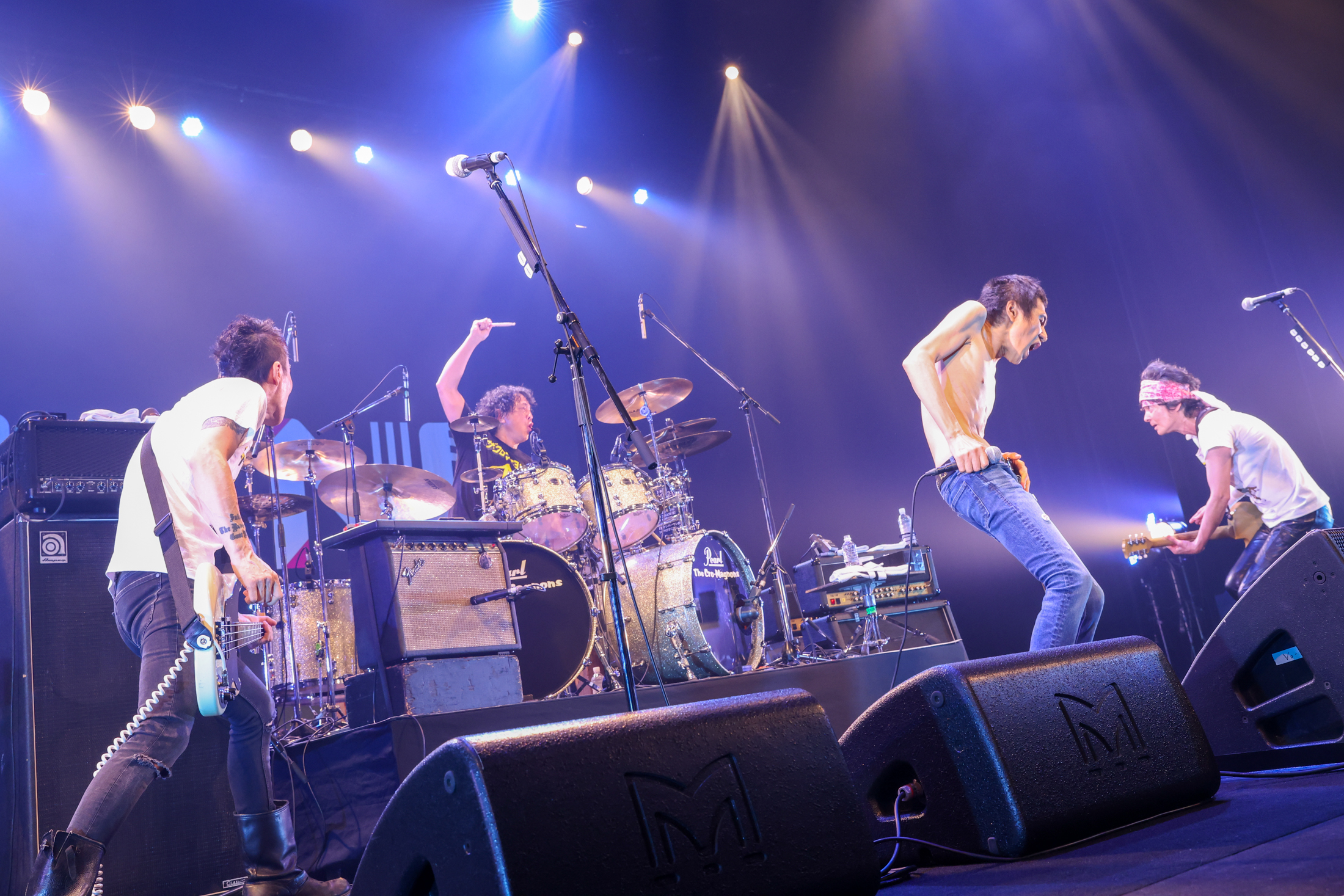 そんなサービス精神旺盛なヒロトに、あるハプニングが。MCを終え、勢いよく「グリセリン・クイーン」に入ったのだが、歌い出しのタイミングを失敗! マーシー(真島)の元に行き演奏をストップさせる。「この会場に何人もおるけど、100%僕一人の責任です。歌詞を間違えるのはいいけど、歌いだしだけはちゃんと歌いたかった。謝りま~す!! もう1回やらせてくださーい!」(ヒロト)と深々と謝罪。これには観客も大爆笑だ。この思いがけないハプニングに立ち会えた喜びもあり、やり直しの「グリセリン・クイーン」は大盛り上がり! さらに、軽快なビートに乗ってヒロトがブルースハープを奏でる「暴動チャイル(BO CHILE)」、ヒロトのハープとマーシーのギターの掛け合いがたまらない「ごくつぶし」などを浴び、その熱狂ぶりは天井知らずになっていく。